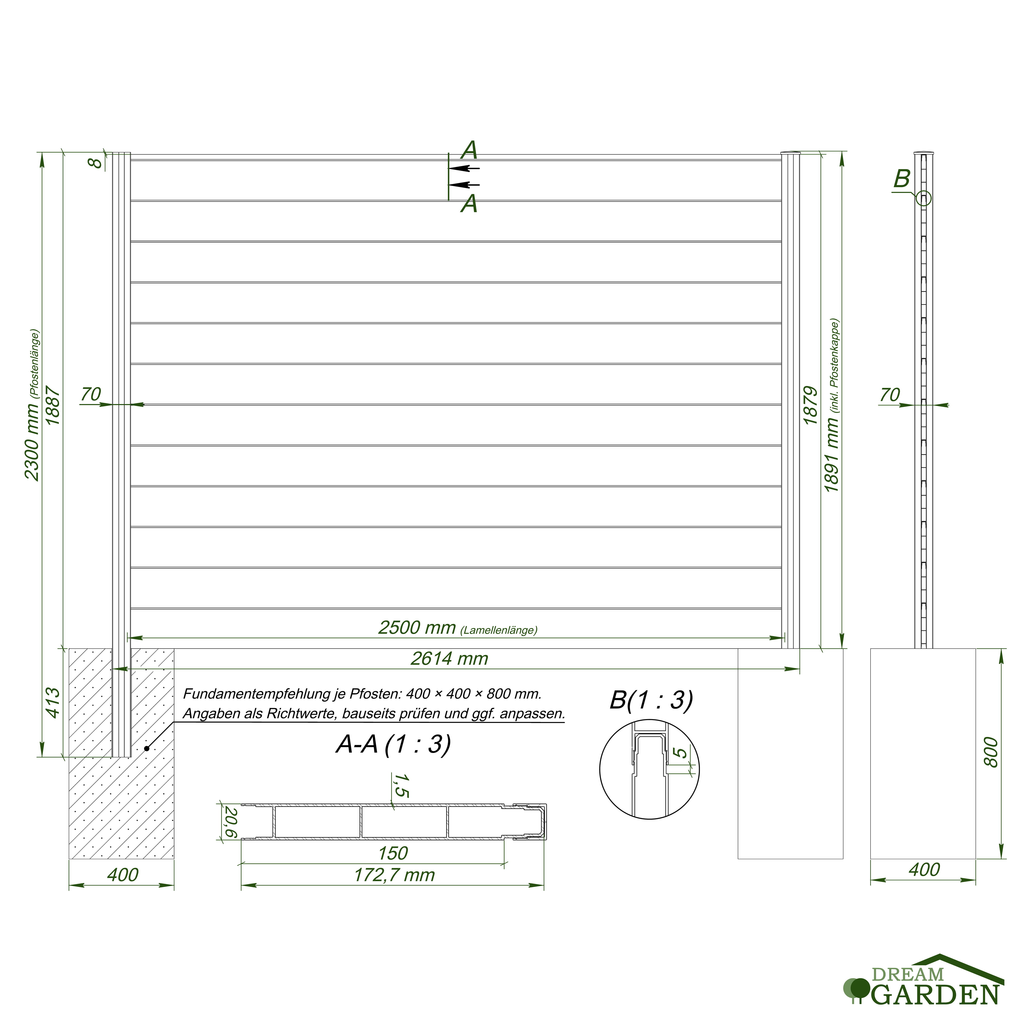 Maße Pfosten: 2500 x 70 x 70 mm