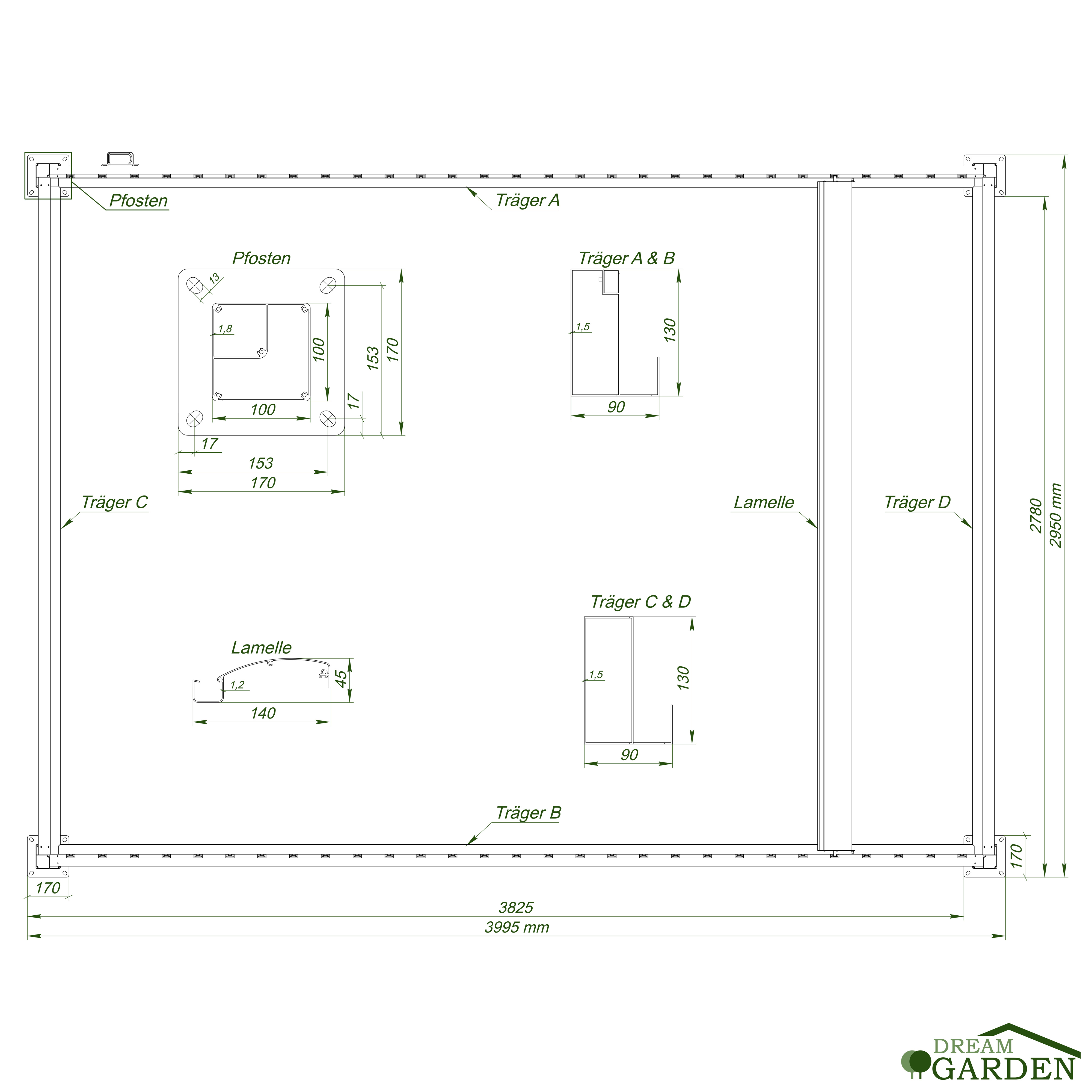 Maße Pfosten: 100x100 mm (Stärke: 1,8 mm)