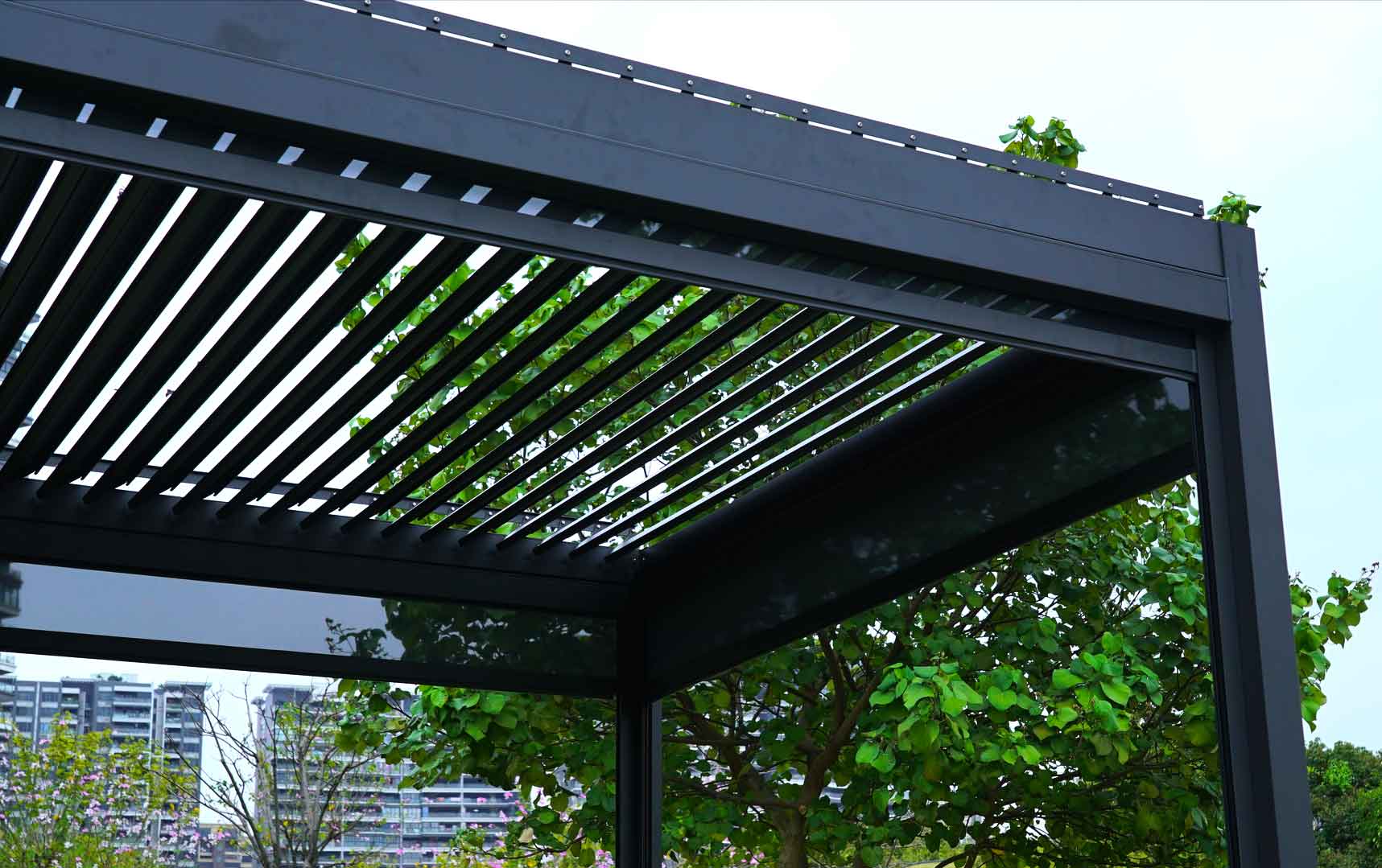 Robuste Konstruktion mit drehbaren Lamellen aus pulverbeschichtetem Aluminium, die unter höchsten Qualitätsstandards produziert wurde. Ergibt sowohl an modernen, als auch an klassischen Objekten ein gutes Gesamtbild, auch als Carport nutzbar.