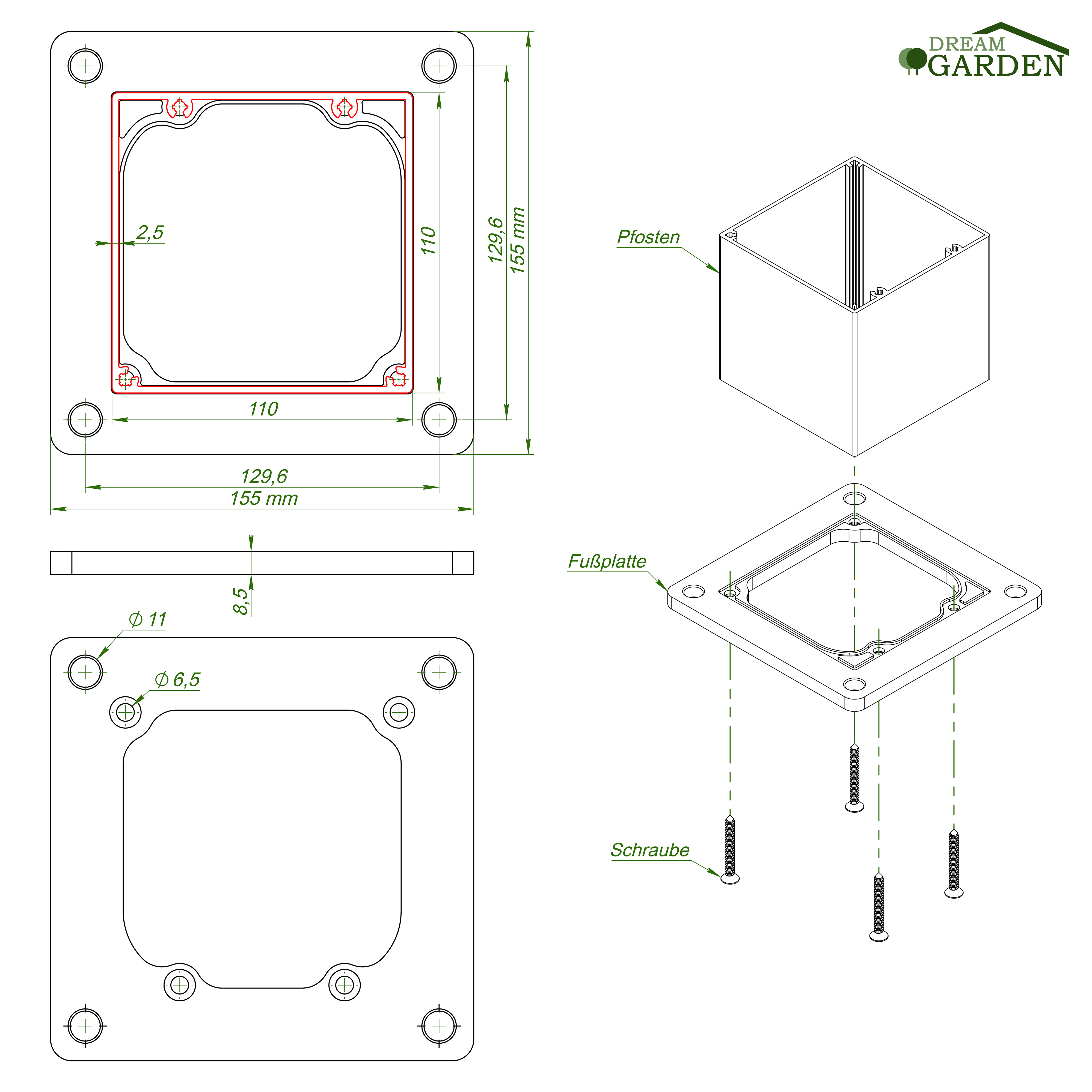 Dreamgarden Pfosten mit Fußplatte 2500 x 110 x 110 mm Aluminium Anthrazit