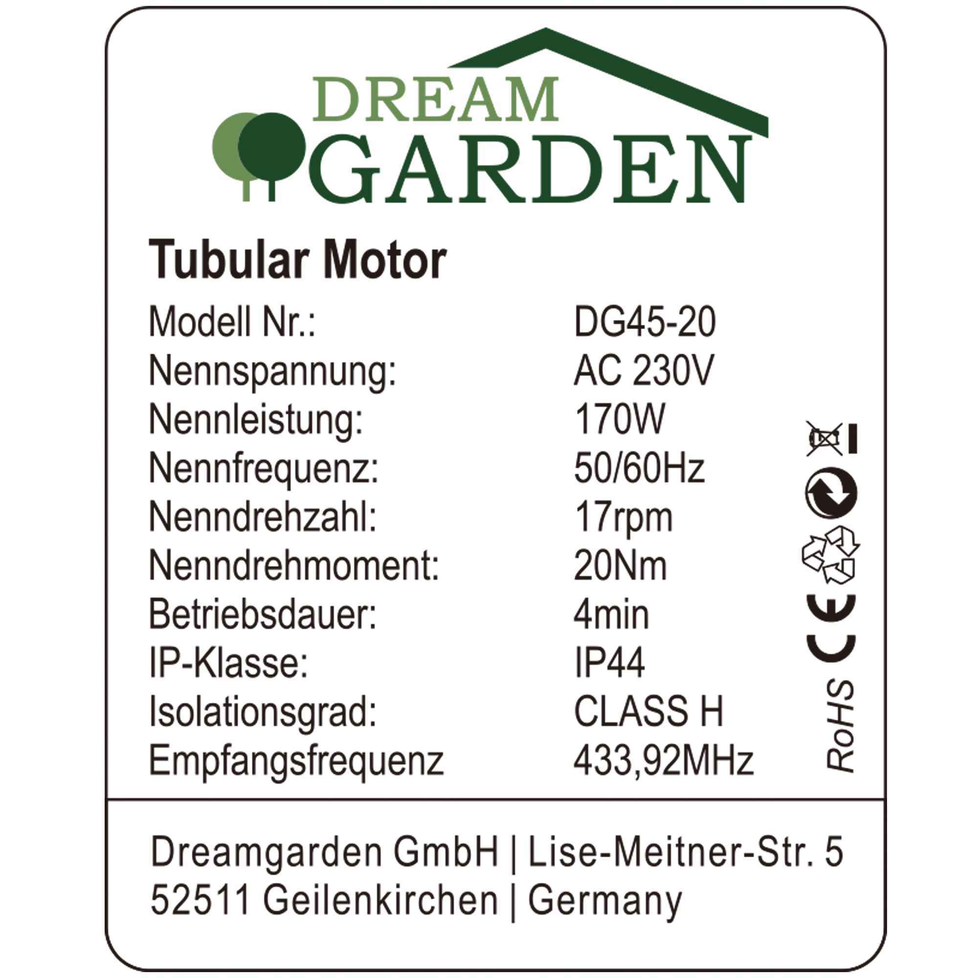 Dreamgarden Rohrmotor DG 45-20 Markise Motor mit Funkempfänger und Fernbedienung