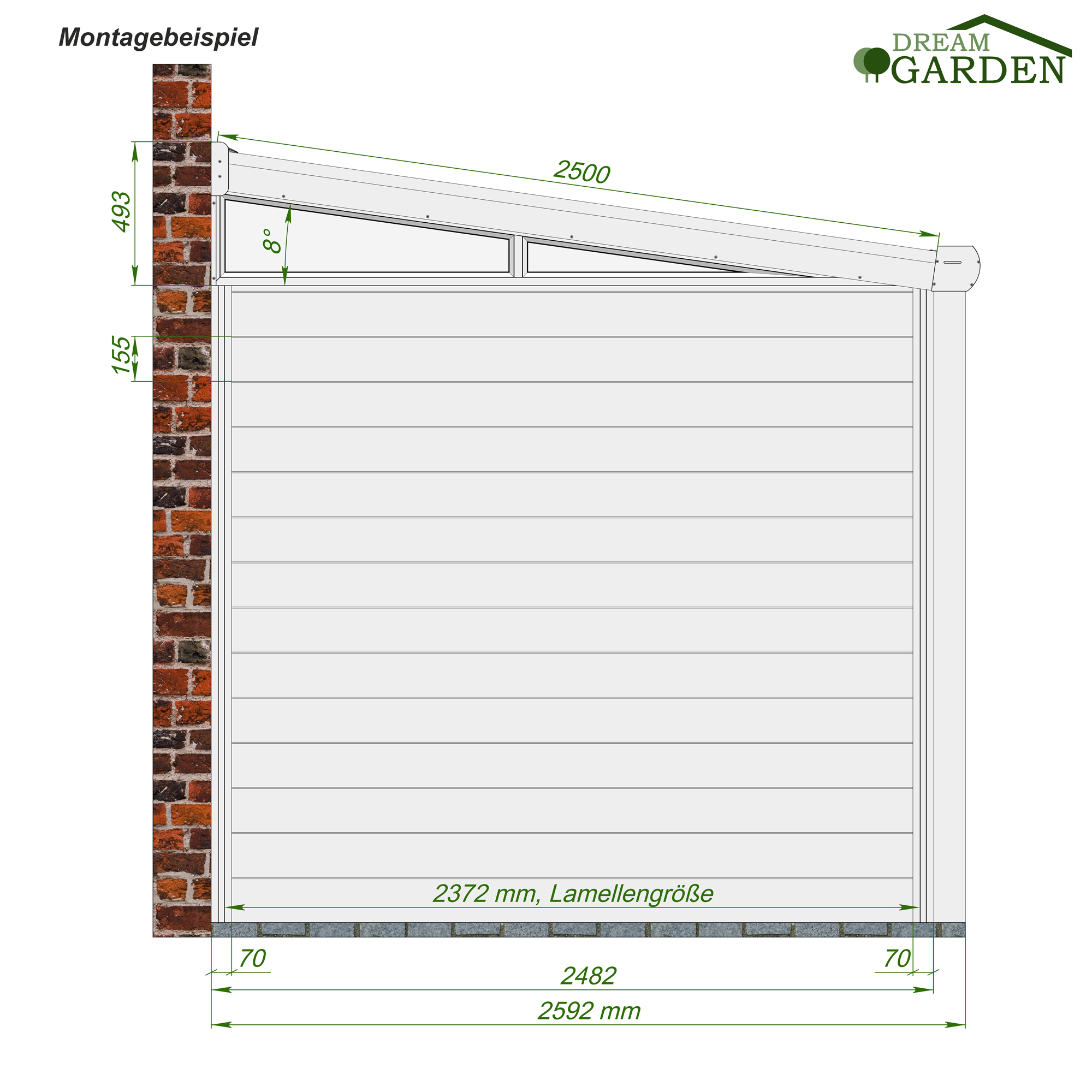 Der mit Aluminiumlamellen ausgestattete Seitenwand-Komplettbausatz ist mit dem angegebenen Material leicht unter Terrassenüberdachungen und Carports montierbar. Die Lamellen und Pfosten müssen an die gegebene Maße angepasst werden.