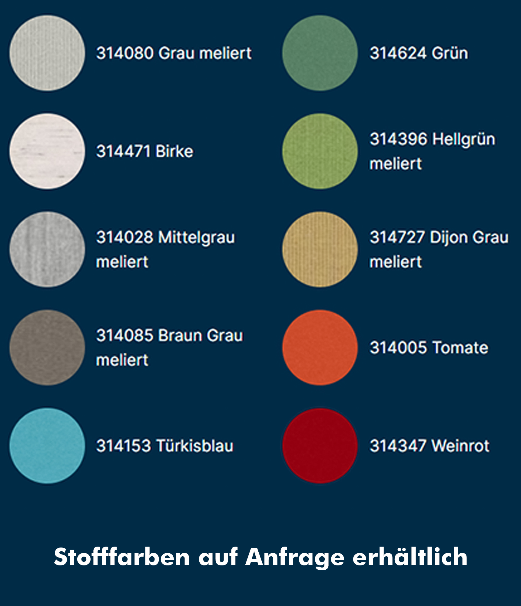Neben den Standardfarbausführungen ist die Unterdachmarkise auf Anfrage in folgenden Farben erhältlich: