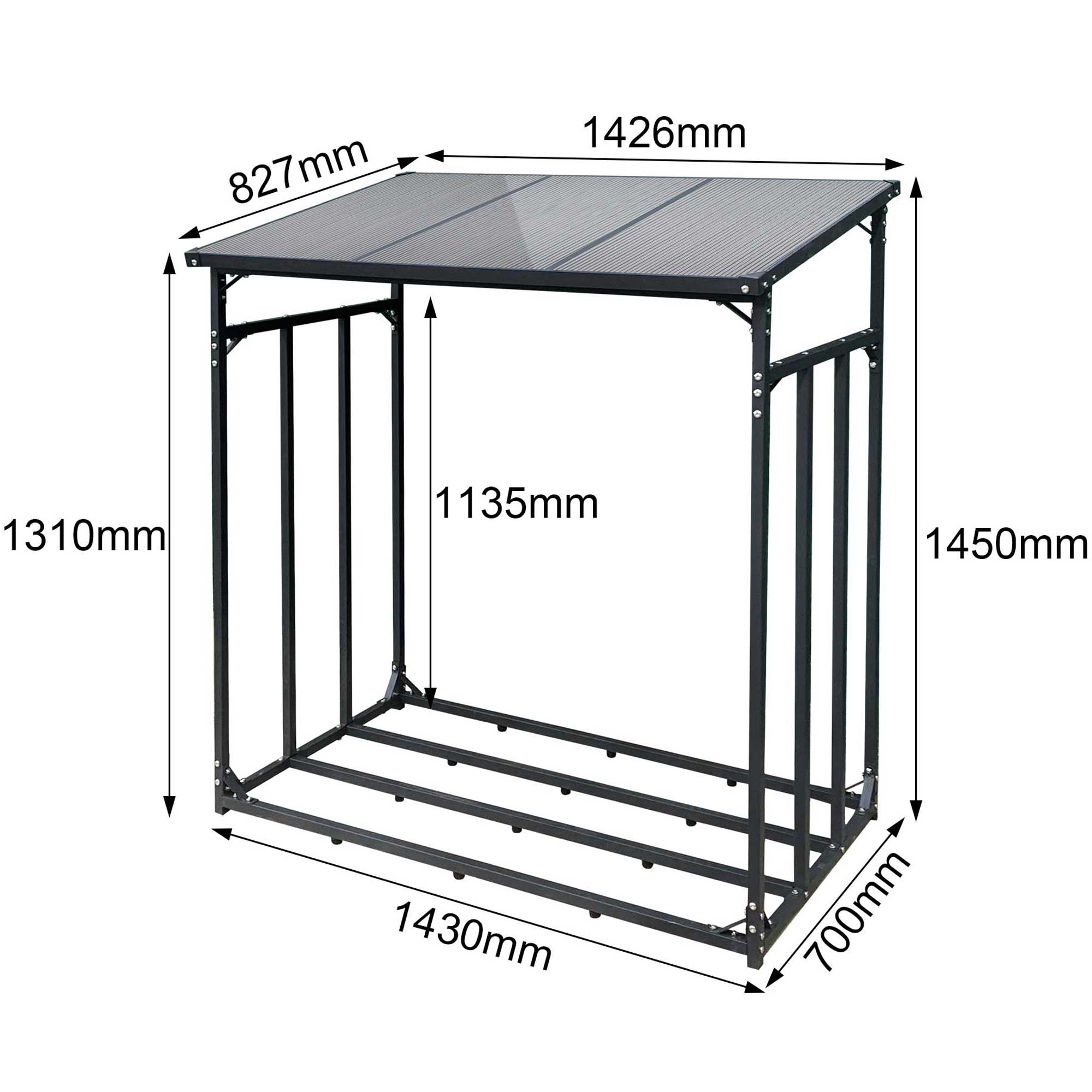 Mit Außenmaßen von 143 cm (Breite) x 70 cm (Tiefe) x 145 cm (Höhe) bietet der Feuerholzständer Platz für ca. 1,4 m³ Brennholz.