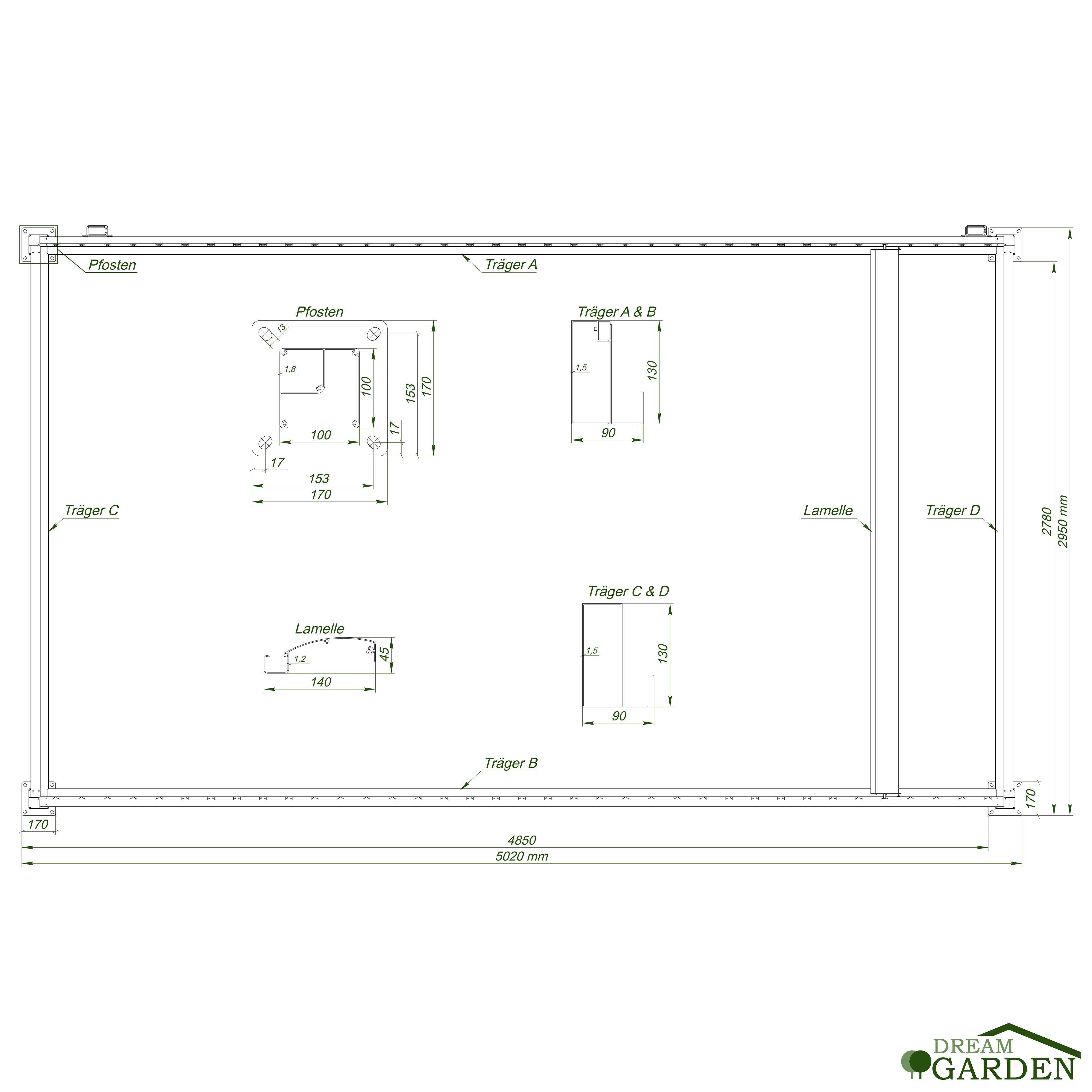 Maße Pfosten: 100x100 mm (Stärke: 1,8 mm)