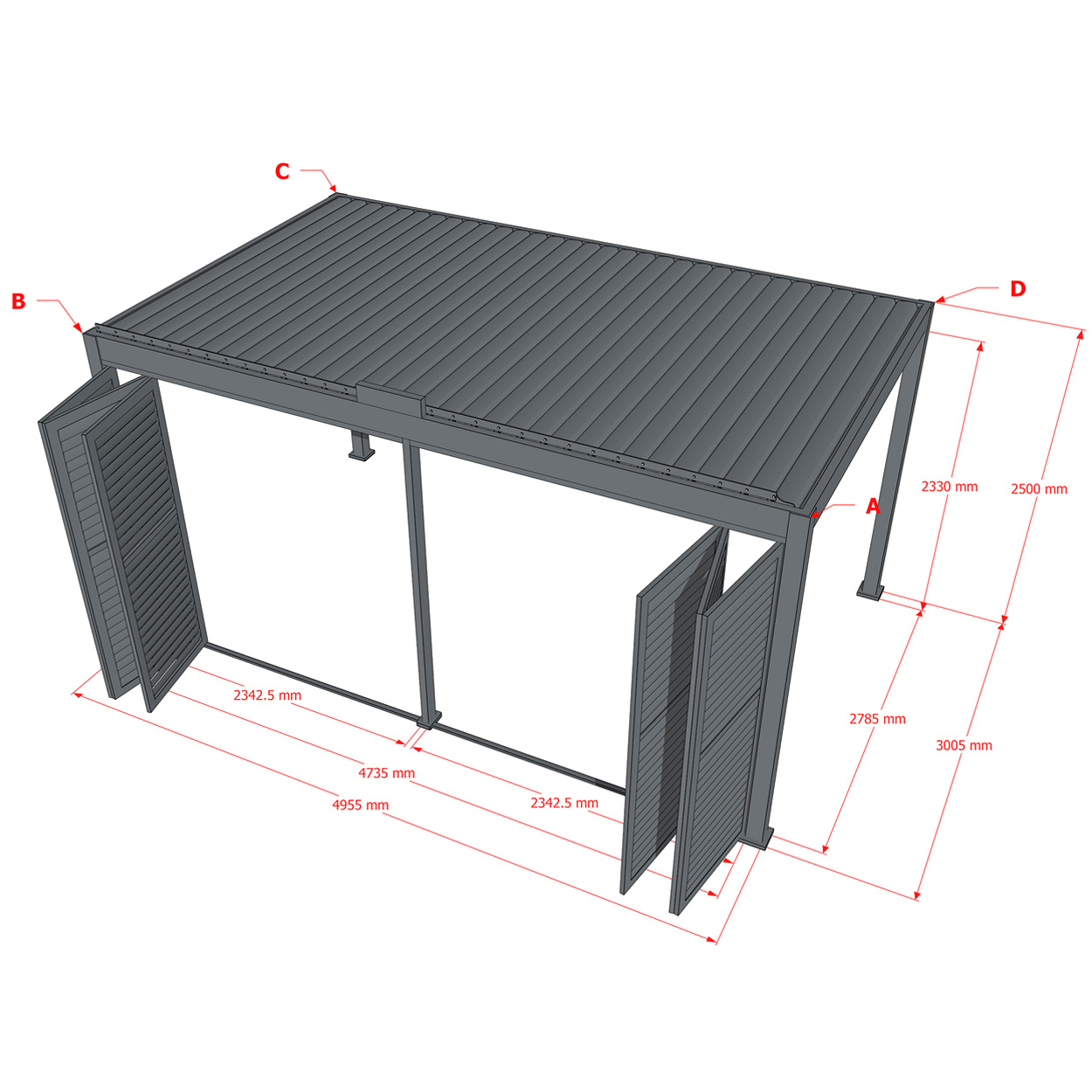 Robuste Seitenwandpaneel Konstruktion aus pulverbeschichtetem Aluminium besteht aus drehbaren horizontalen Lamellen, die über die gesamte Höhe verteilt sind. Die Jalousie-Wand kann manuell geöffnet und geschlossen werden, um die Lichtdurchlässigkeit und Lufteinlass zu regulieren.