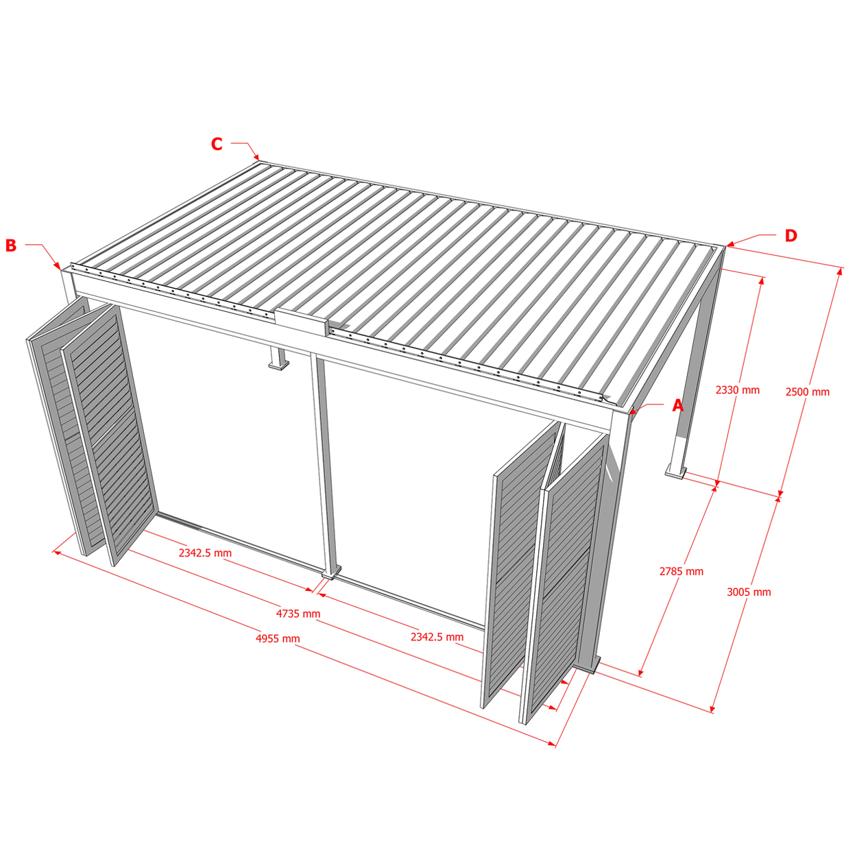 Robuste Seitenwandpaneel Konstruktion aus pulverbeschichtetem Aluminium besteht aus drehbaren horizontalen Lamellen, die über die gesamte Höhe verteilt sind. Die Jalousie-Wand kann manuell geöffnet und geschlossen werden, um die Lichtdurchlässigkeit und Lufteinlass zu regulieren.