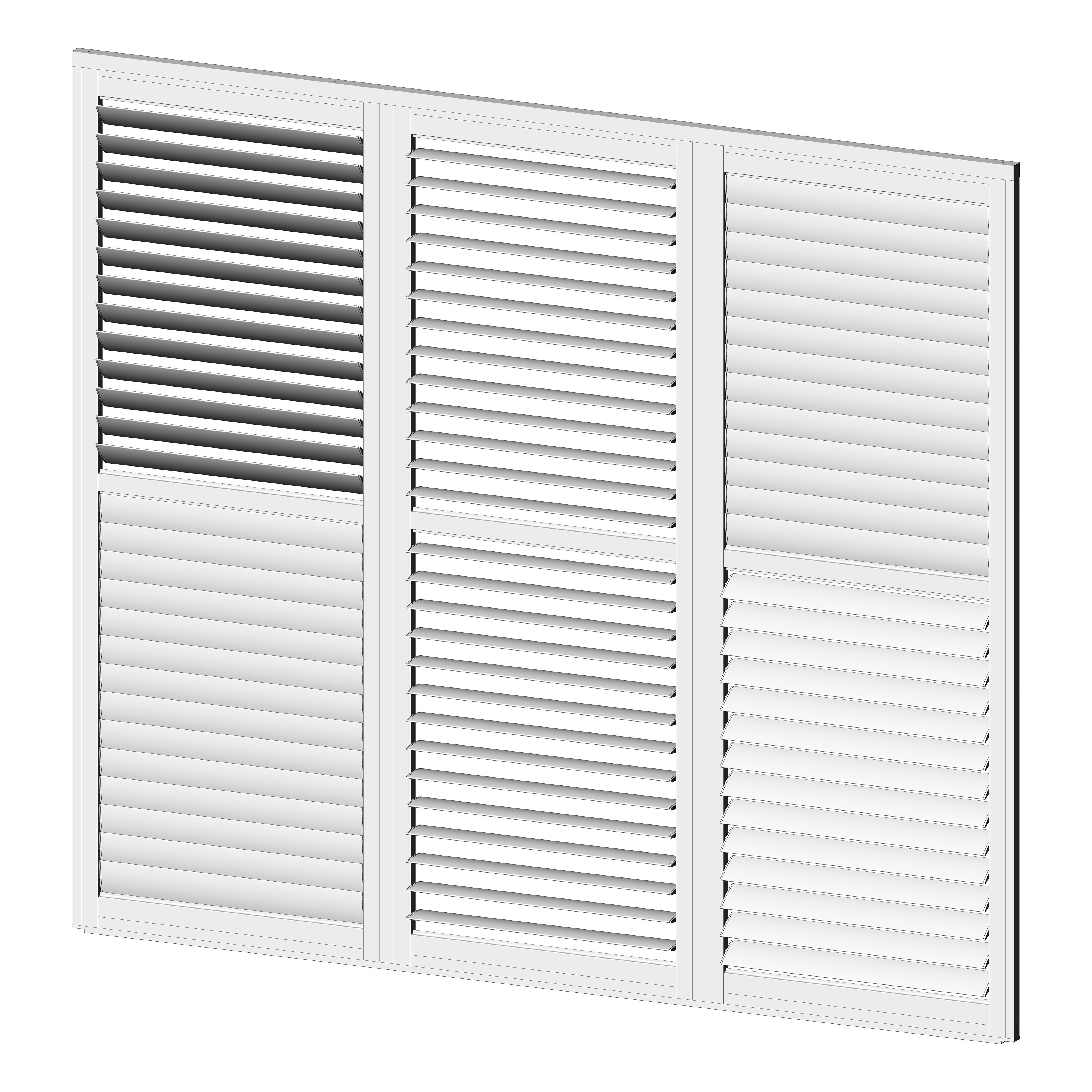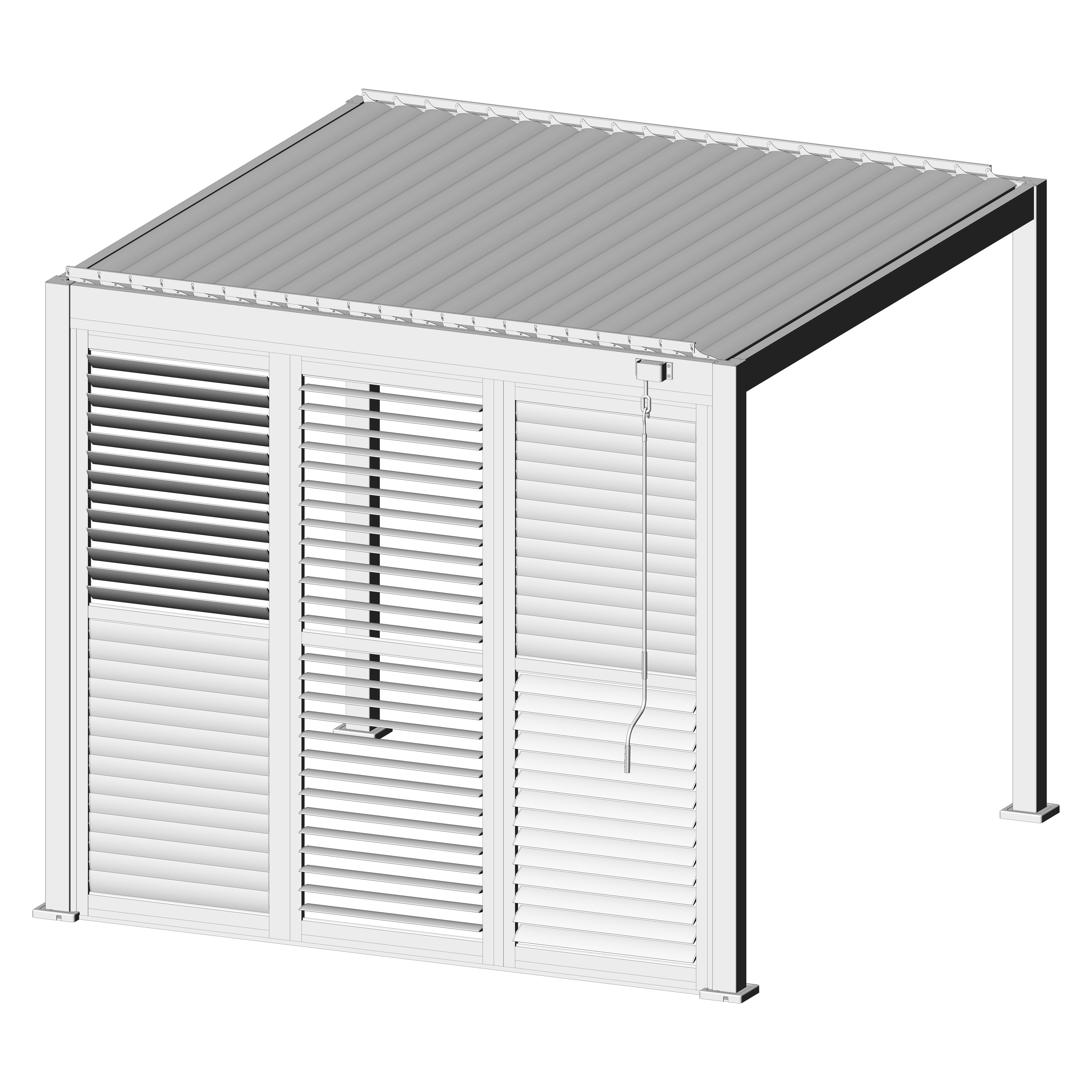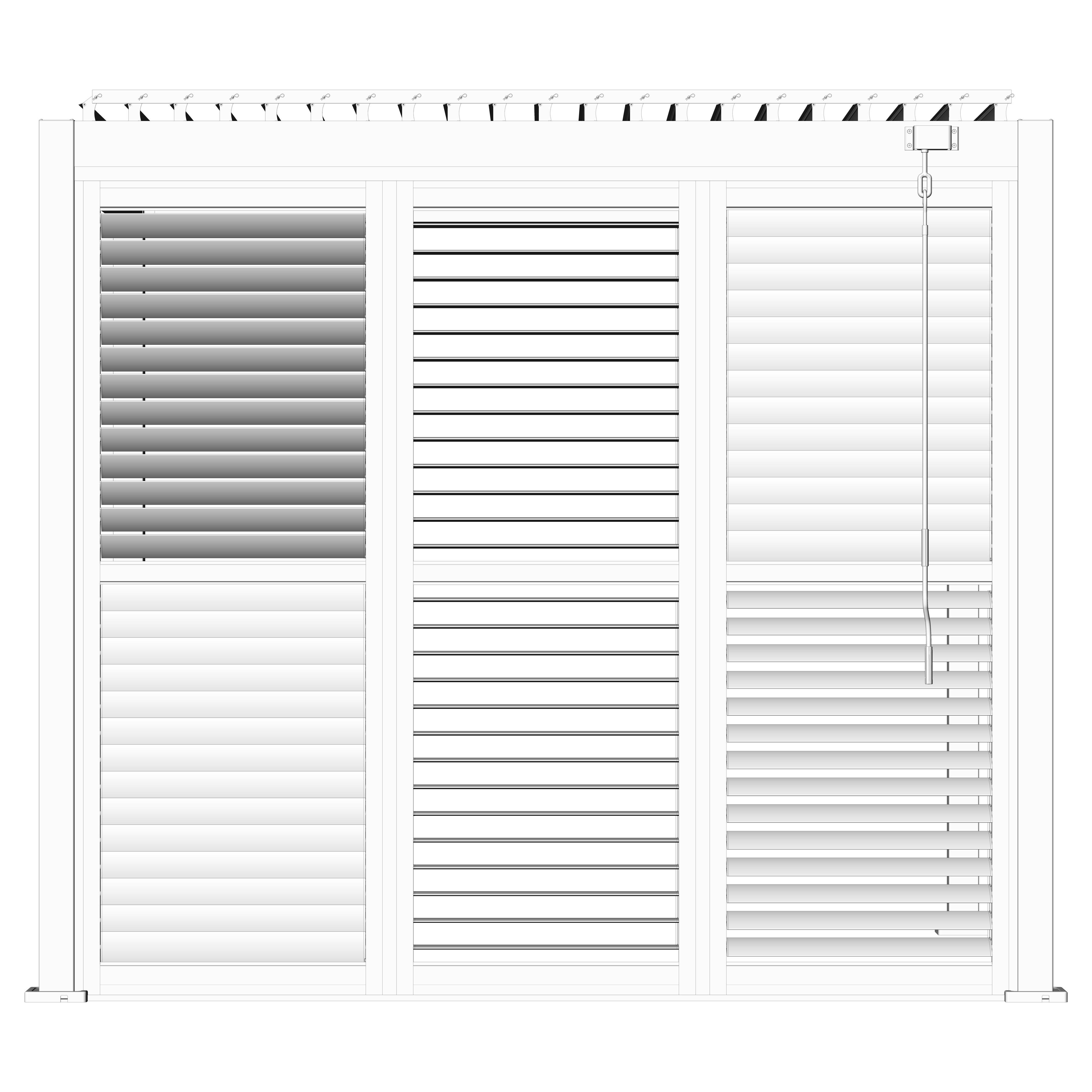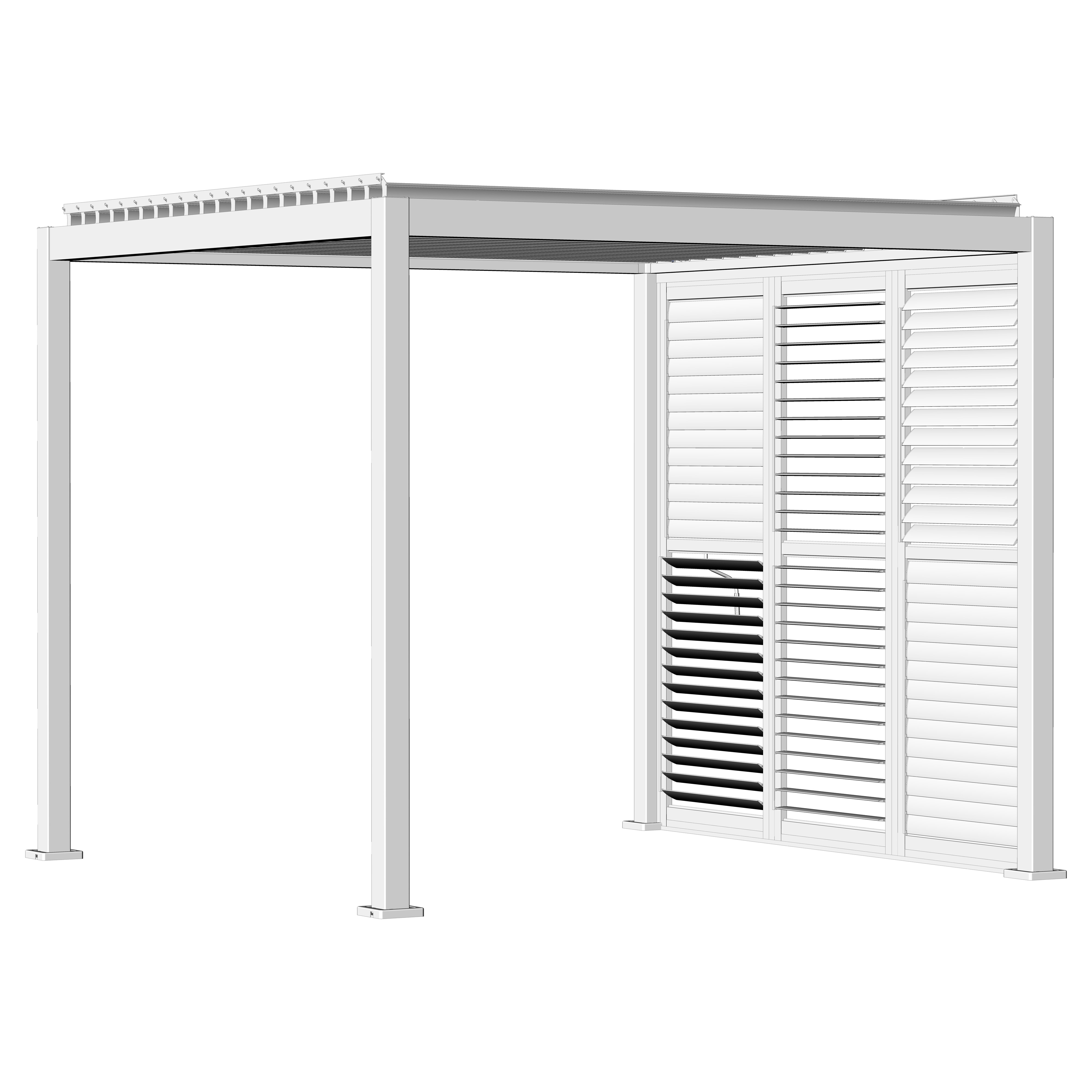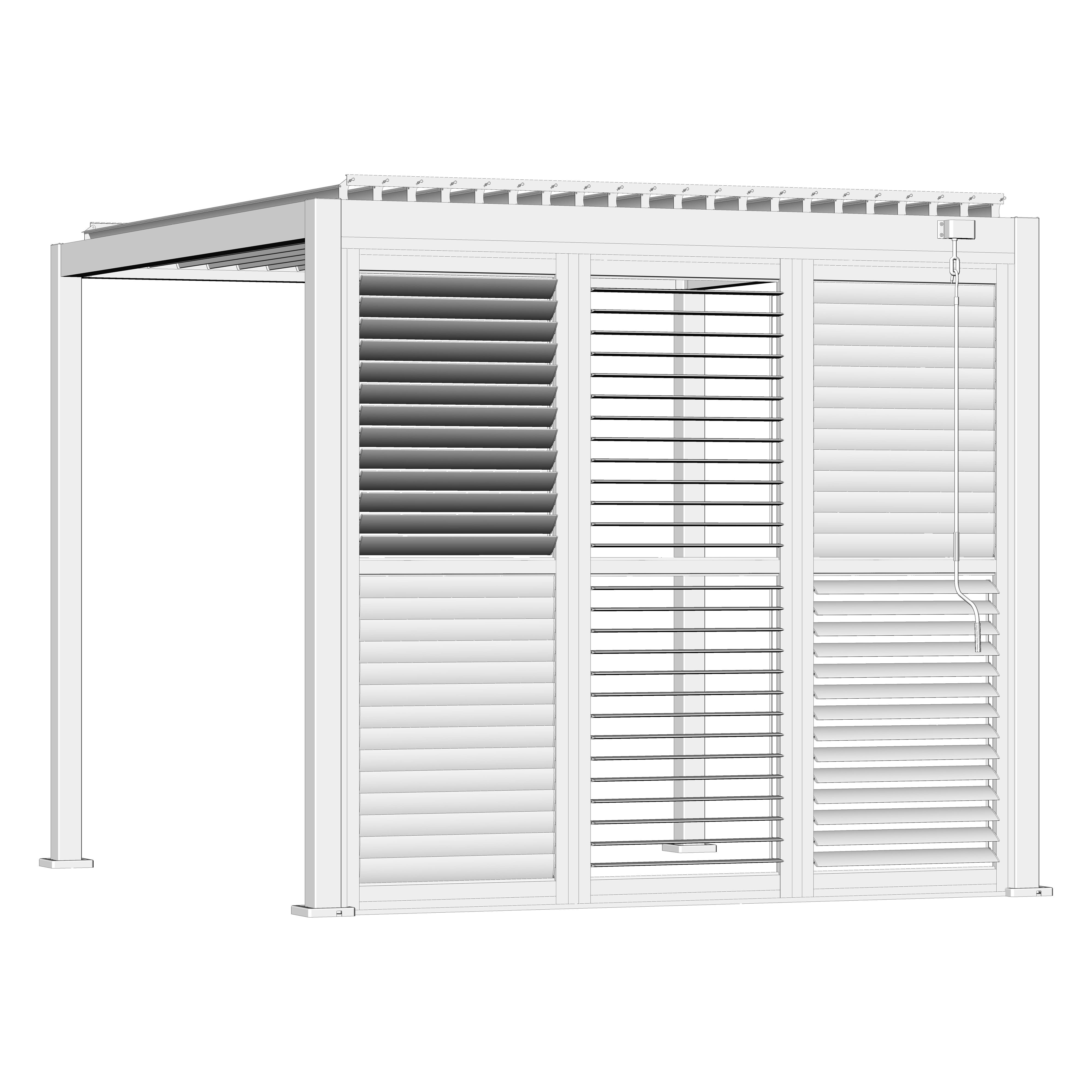 Robuste Seitenwandpaneel Konstruktion aus pulverbeschichtetem Aluminium besteht aus drehbaren horizontalen Lamellen, die über die gesamte Höhe verteilt sind. Die Jalousiewand kann manuell geöffnet und geschlossen werden, um die Lichtdurchlässigkeit und Lufteinlass zu regulieren.