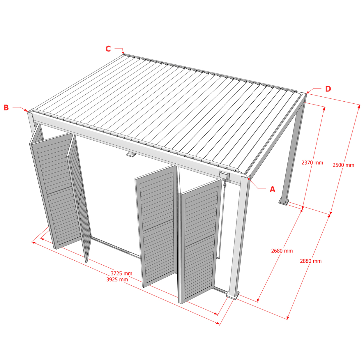 Robuste Seitenwandpaneel Konstruktion aus pulverbeschichtetem Aluminium besteht aus drehbaren horizontalen Lamellen, die über die gesamte Höhe verteilt sind. Die Jalousiewand kann manuell geöffnet und geschlossen werden, um die Lichtdurchlässigkeit und Lufteinlass zu regulieren.