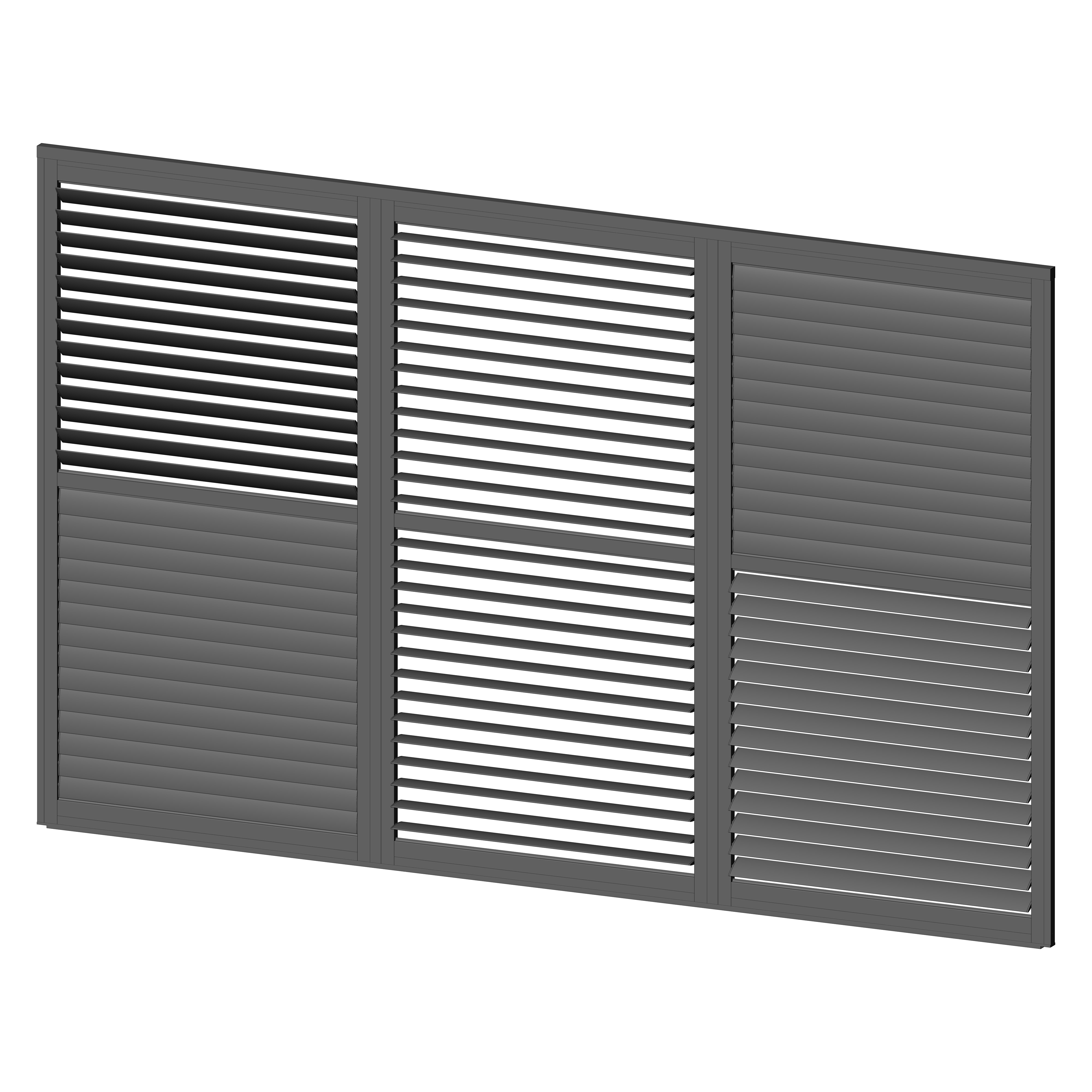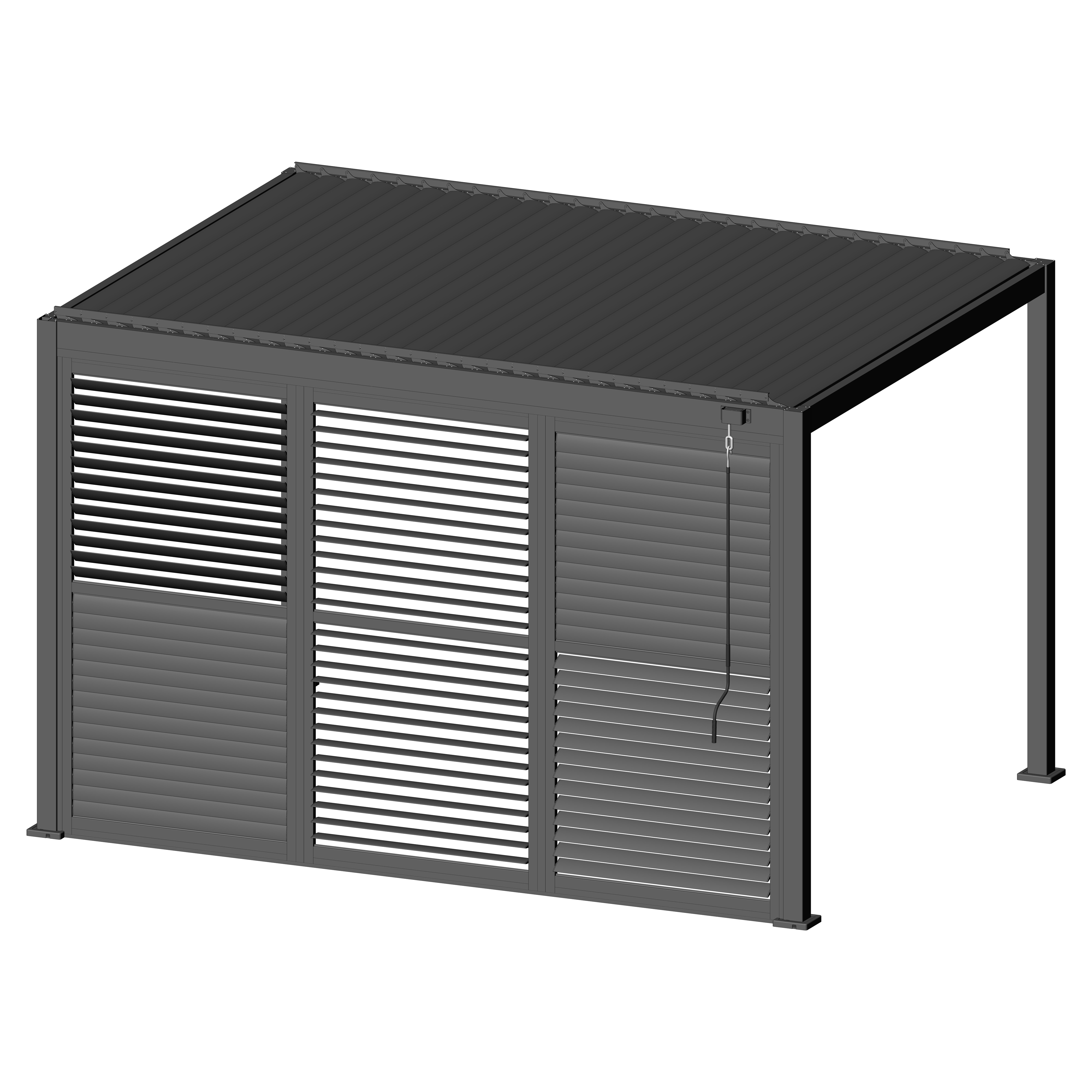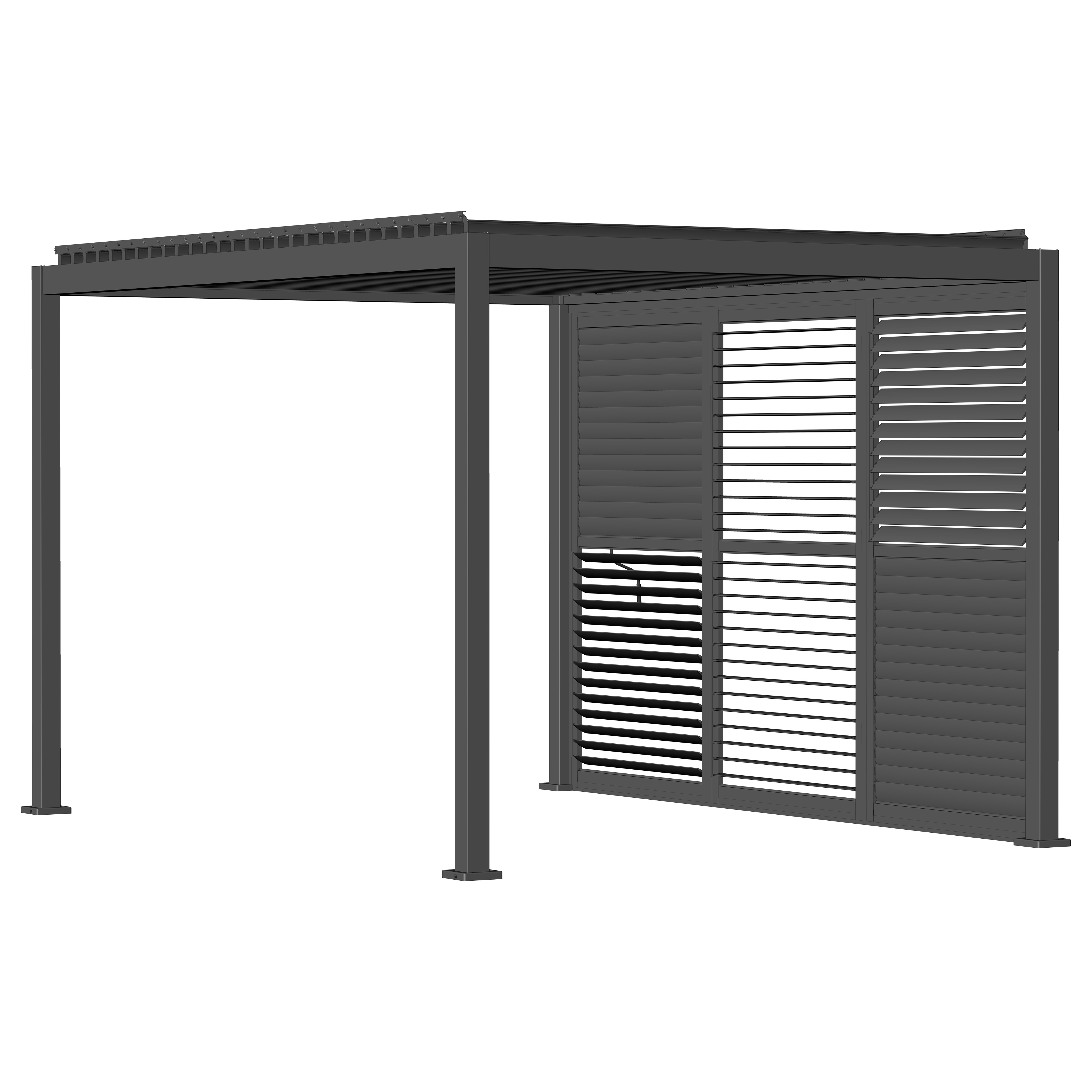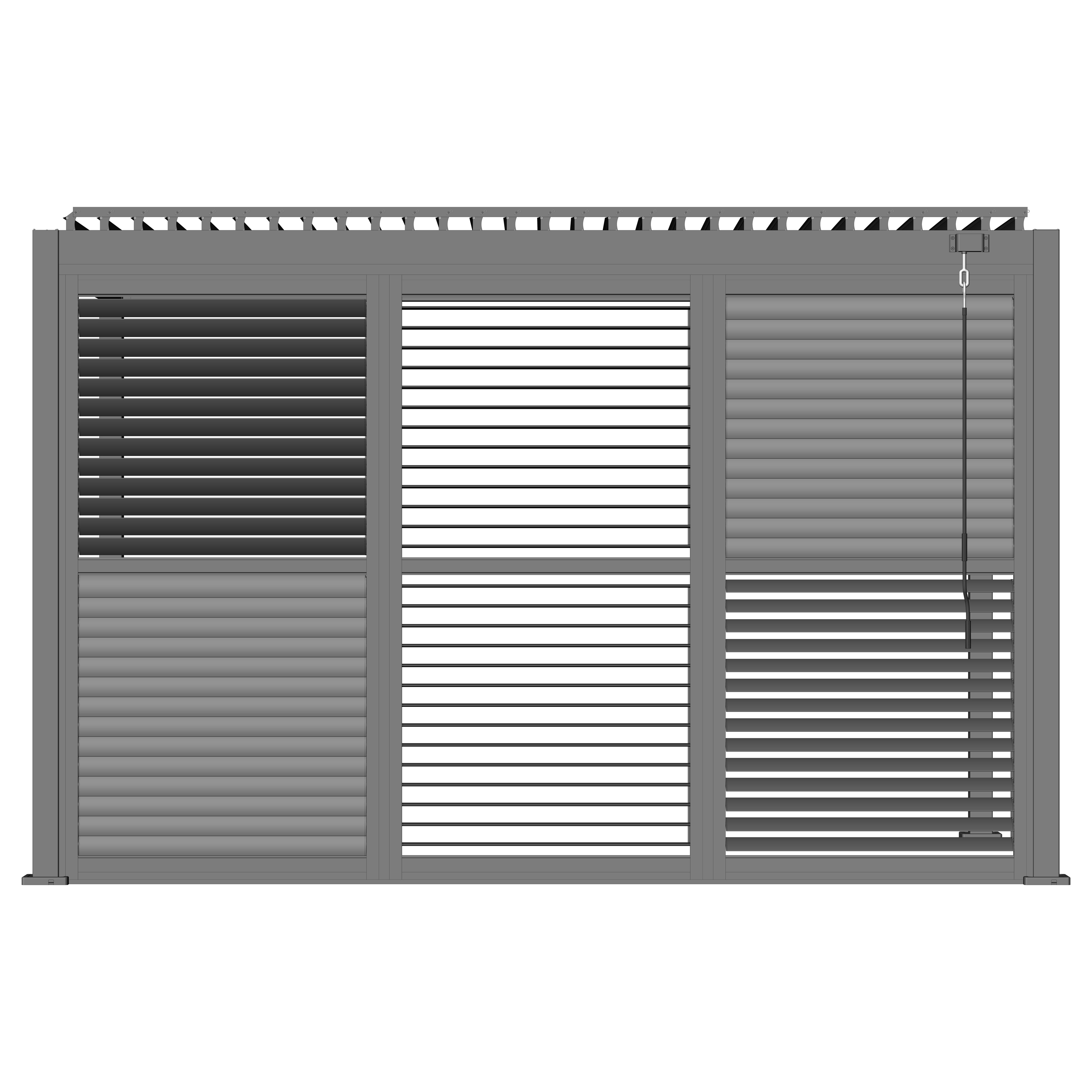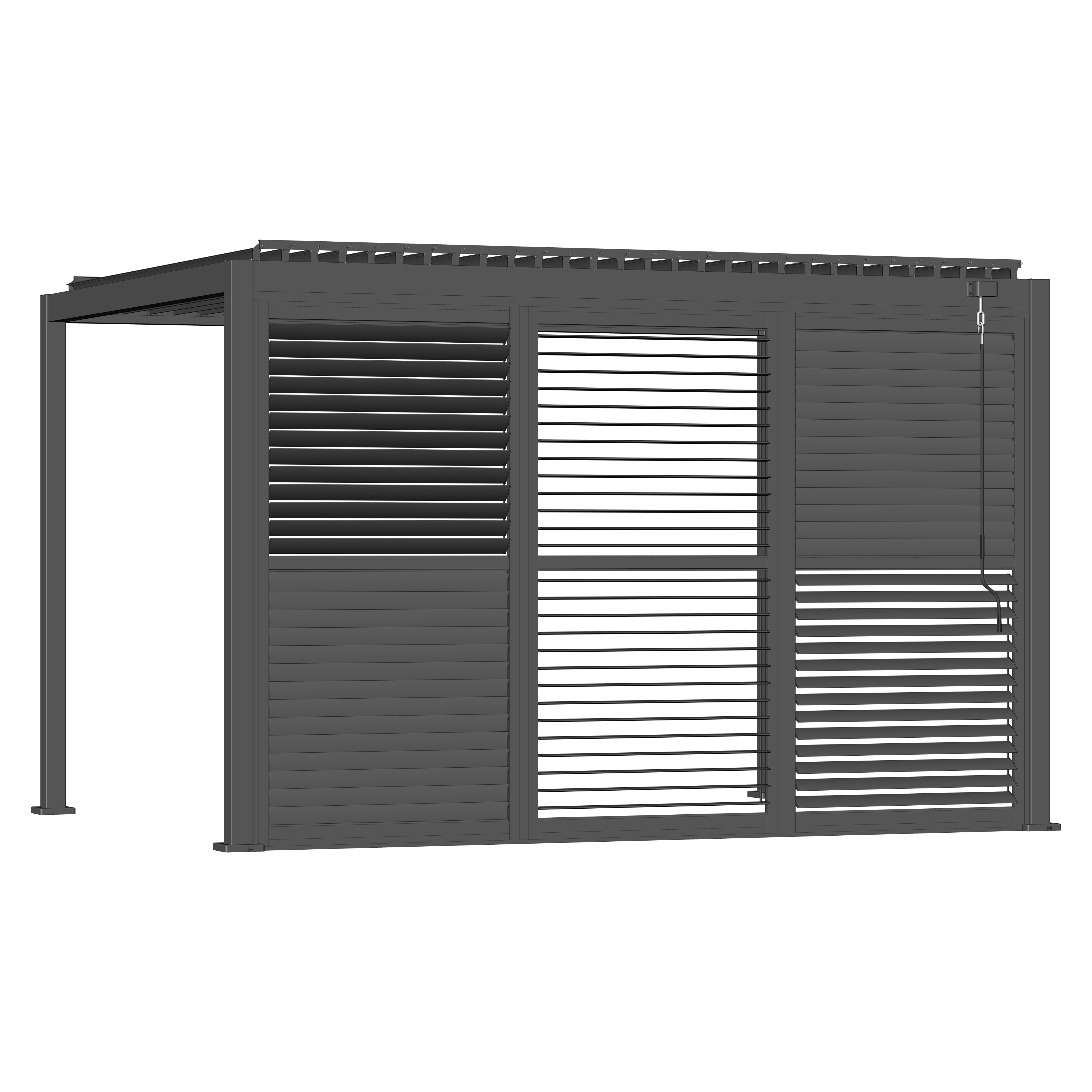 Robuste Seitenwandpaneel Konstruktion aus pulverbeschichtetem Aluminium besteht aus drehbaren horizontalen Lamellen, die über die gesamte Höhe verteilt sind. Die Jalousiewand kann manuell geöffnet und geschlossen werden, um die Lichtdurchlässigkeit und Lufteinlass zu regulieren.