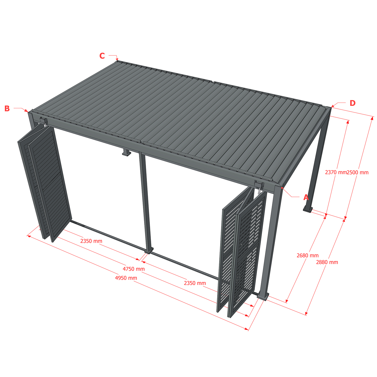 Robuste Seitenwandpaneel Konstruktion aus pulverbeschichtetem Aluminium besteht aus drehbaren horizontalen Lamellen, die über die gesamte Höhe verteilt sind. Die Jalousiewand kann manuell geöffnet und geschlossen werden, um die Lichtdurchlässigkeit und Lufteinlass zu regulieren.