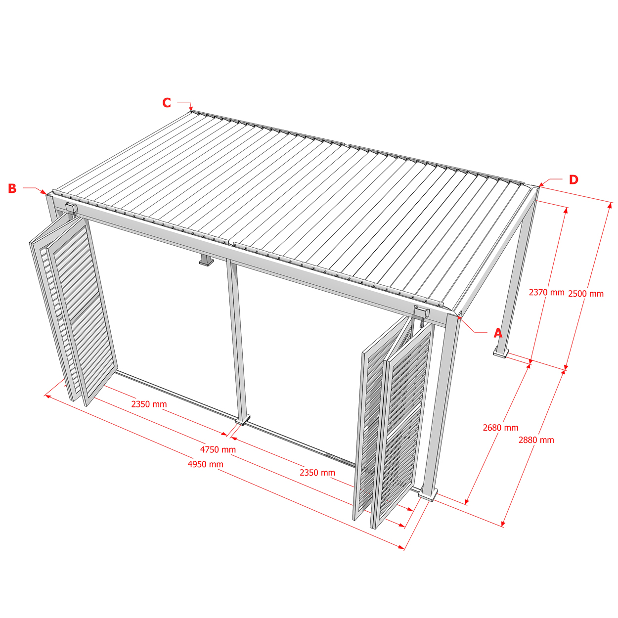 Robuste Seitenwandpaneel Konstruktion aus pulverbeschichtetem Aluminium besteht aus drehbaren horizontalen Lamellen, die über die gesamte Höhe verteilt sind. Die Jalousiewand kann manuell geöffnet und geschlossen werden, um die Lichtdurchlässigkeit und Lufteinlass zu regulieren.