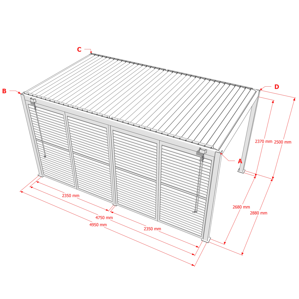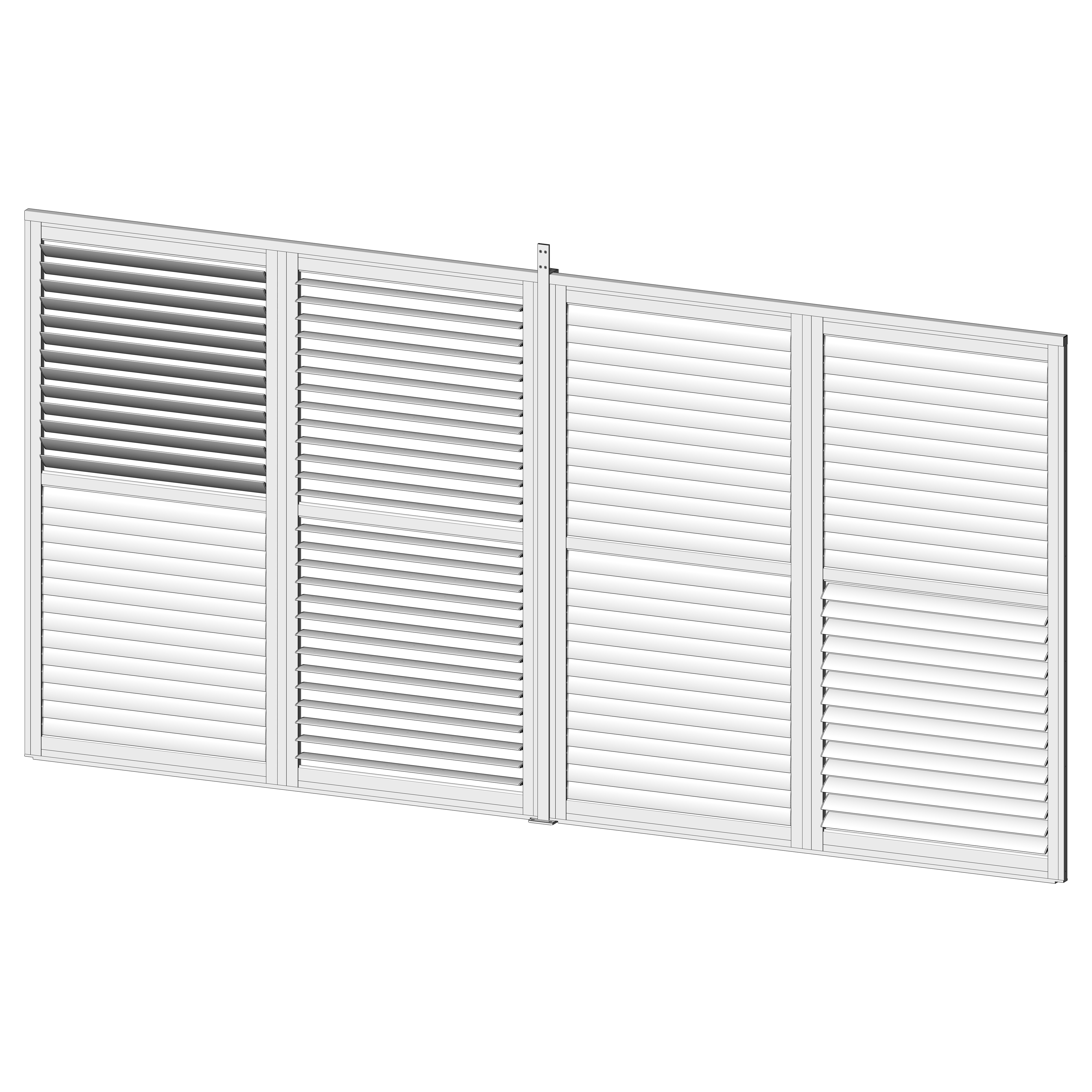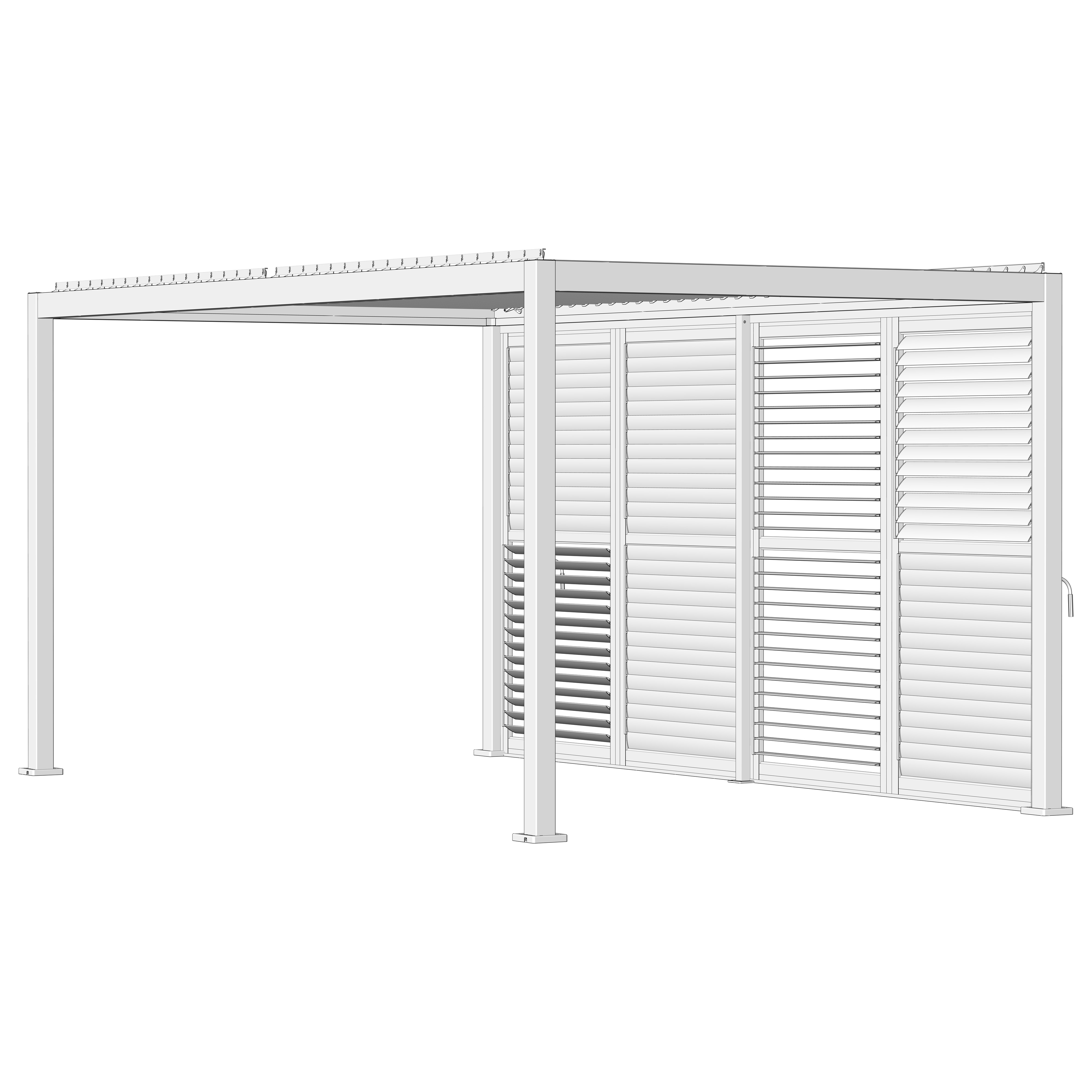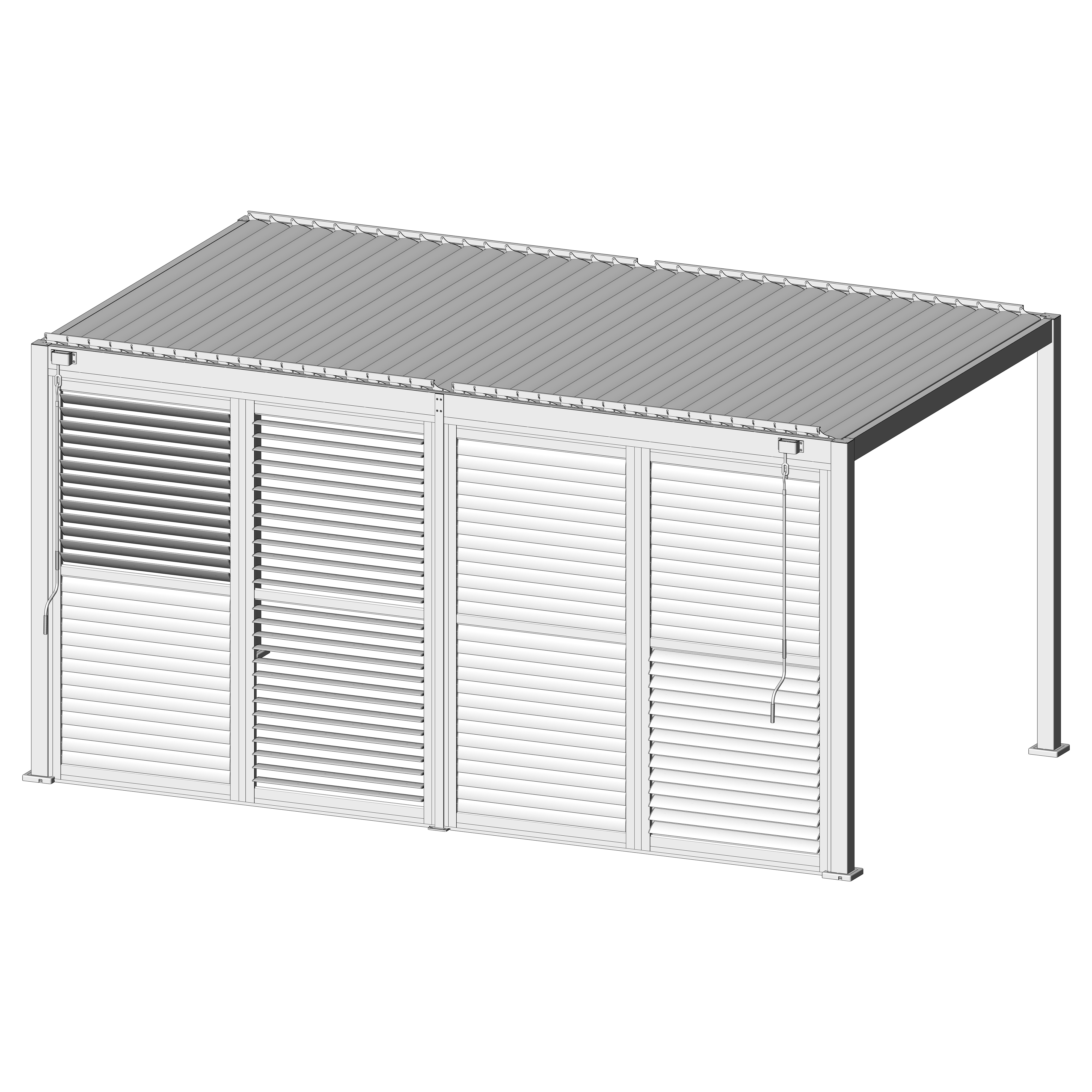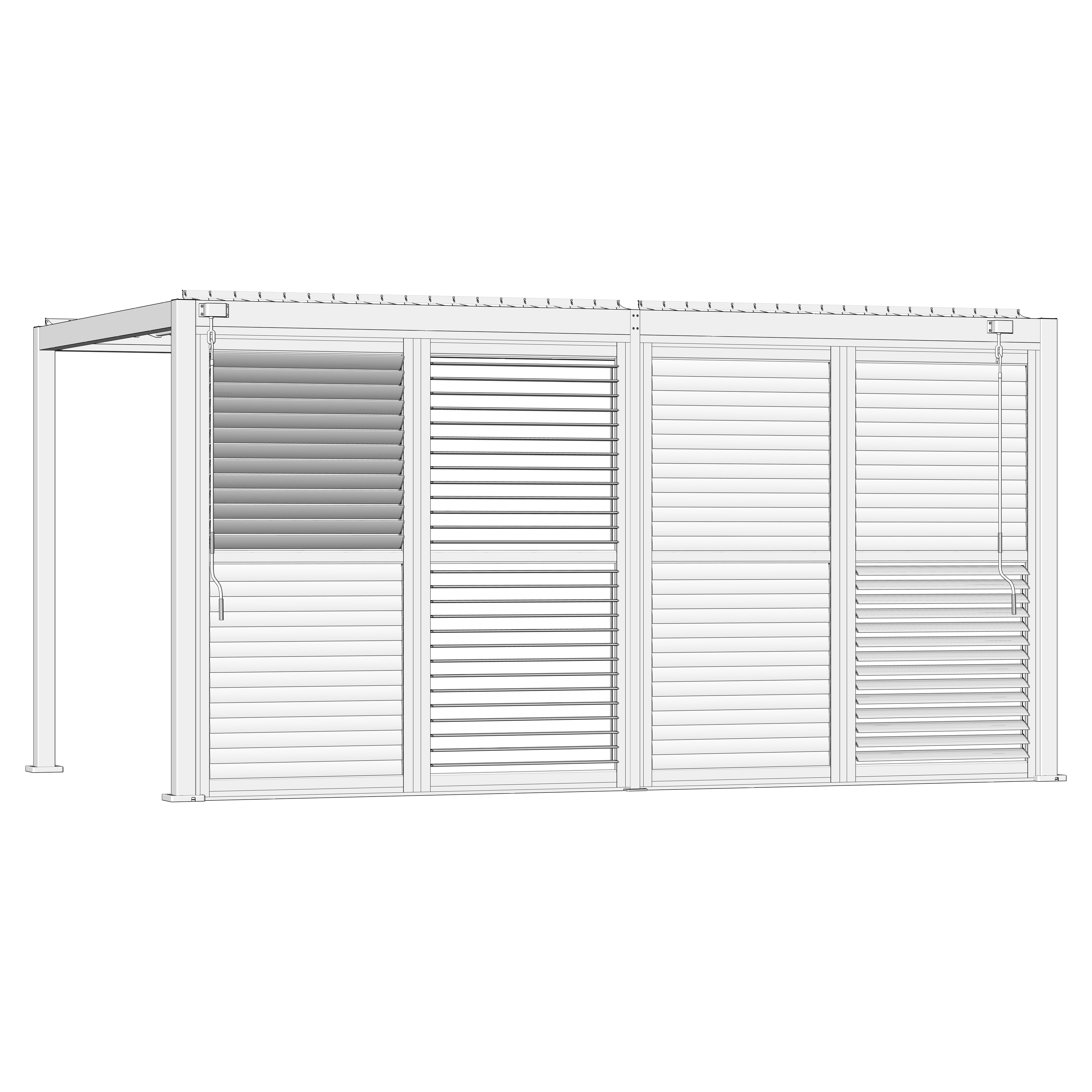 Robuste Seitenwandpaneel Konstruktion aus pulverbeschichtetem Aluminium besteht aus drehbaren horizontalen Lamellen, die über die gesamte Höhe verteilt sind. Die Jalousiewand kann manuell geöffnet und geschlossen werden, um die Lichtdurchlässigkeit und Lufteinlass zu regulieren.