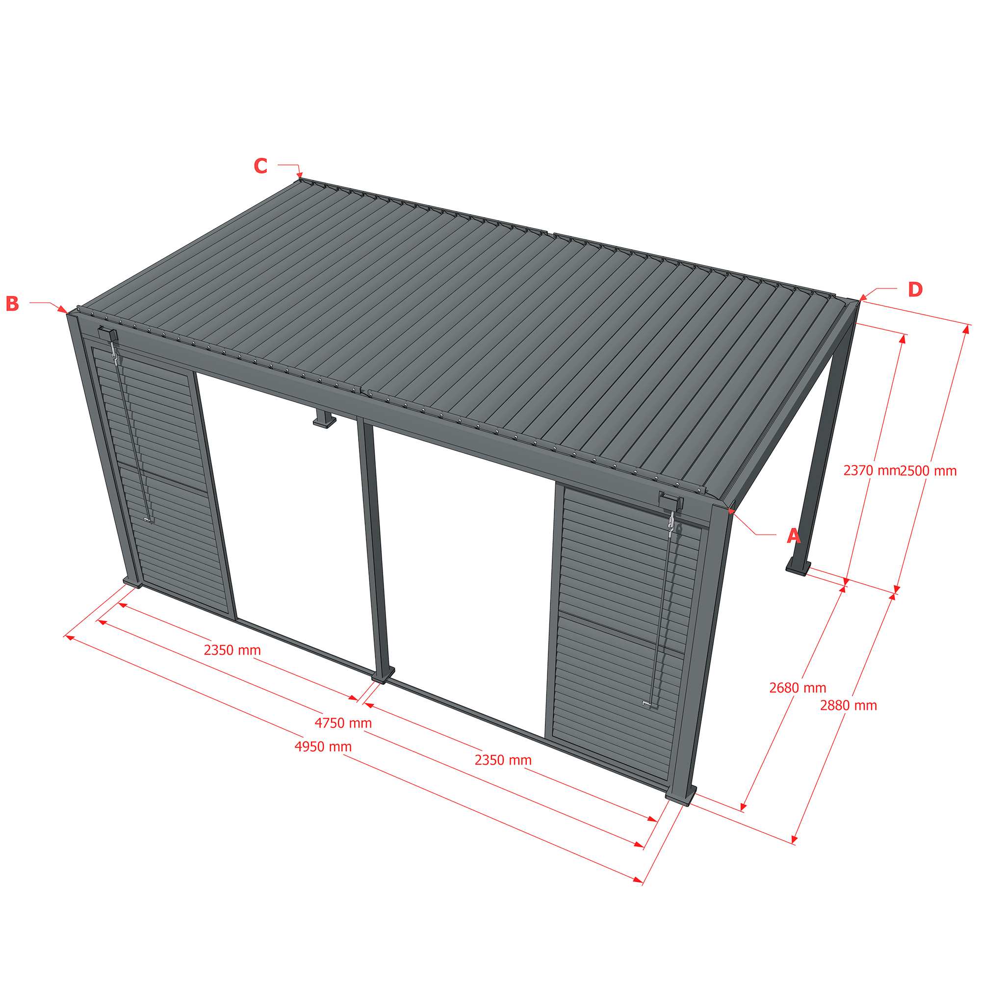 Robuste Seitenwandpaneel Konstruktion aus pulverbeschichtetem Aluminium besteht aus drehbaren horizontalen Lamellen, die über die gesamte Höhe verteilt sind. Die Jalousiewand kann manuell geöffnet und geschlossen werden, um die Lichtdurchlässigkeit und Lufteinlass zu regulieren.
