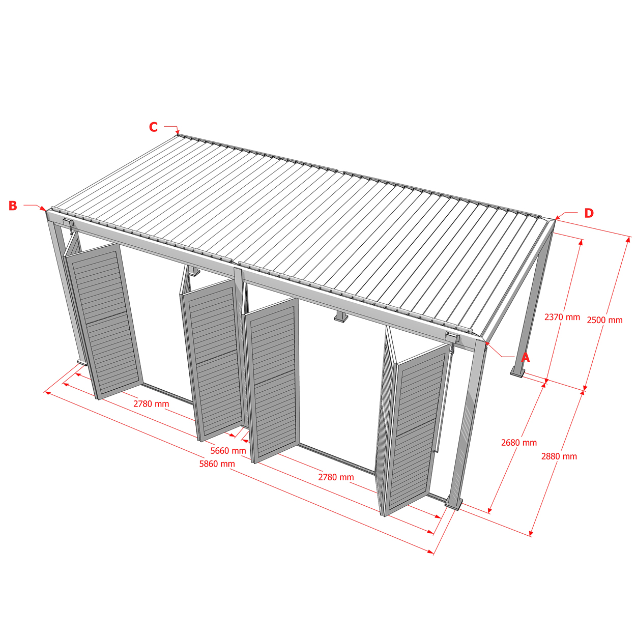 Robuste Seitenwandpaneel Konstruktion aus pulverbeschichtetem Aluminium besteht aus drehbaren horizontalen Lamellen, die über die gesamte Höhe verteilt sind. Die Jalousie-Wand kann manuell geöffnet und geschlossen werden, um die Lichtdurchlässigkeit und Lufteinlass zu regulieren.