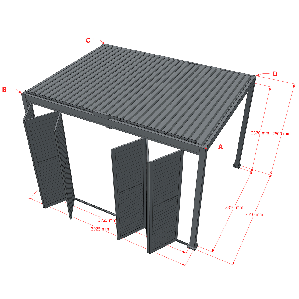 Robuste Seitenwandpaneel Konstruktion aus pulverbeschichtetem Aluminium besteht aus drehbaren horizontalen Lamellen, die über die gesamte Höhe verteilt sind. Die Jalousie-Wand kann manuell geöffnet und geschlossen werden, um die Lichtdurchlässigkeit und Lufteinlass zu regulieren.