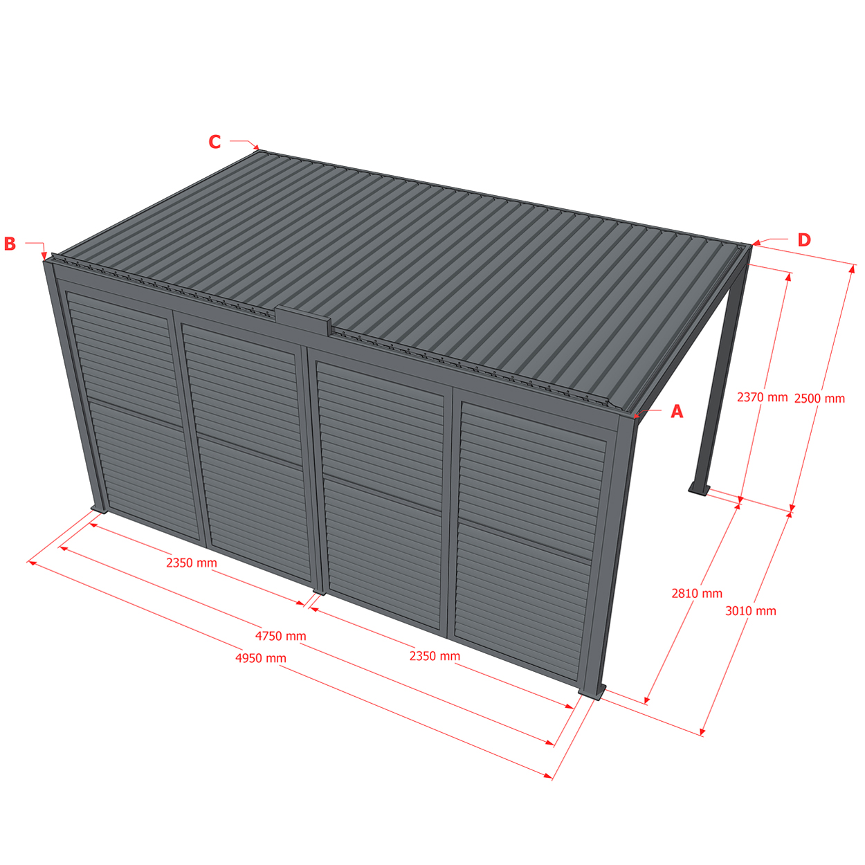 Robuste Seitenwandpaneel Konstruktion aus pulverbeschichtetem Aluminium besteht aus drehbaren horizontalen Lamellen, die über die gesamte Höhe verteilt sind. Die Jalousie-Wand kann manuell geöffnet und geschlossen werden, um die Lichtdurchlässigkeit und Lufteinlass zu regulieren.