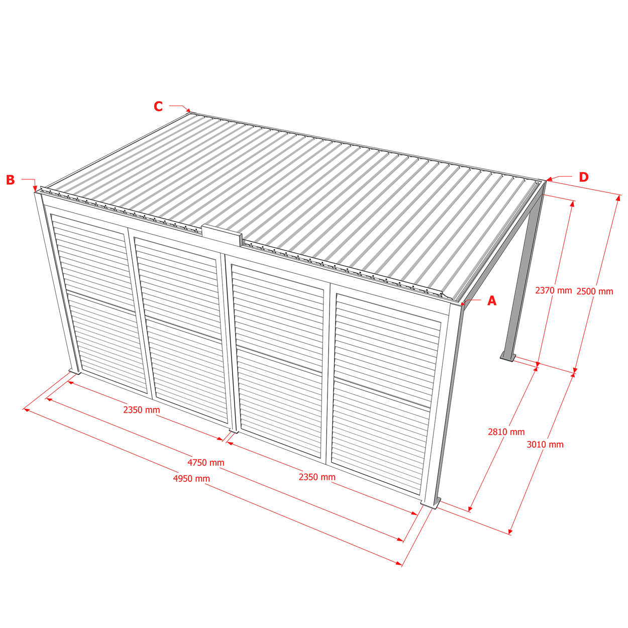 Robuste Seitenwandpaneel Konstruktion aus pulverbeschichtetem Aluminium besteht aus drehbaren horizontalen Lamellen, die über die gesamte Höhe verteilt sind. Die Jalousie-Wand kann manuell geöffnet und geschlossen werden, um die Lichtdurchlässigkeit und Lufteinlass zu regulieren.