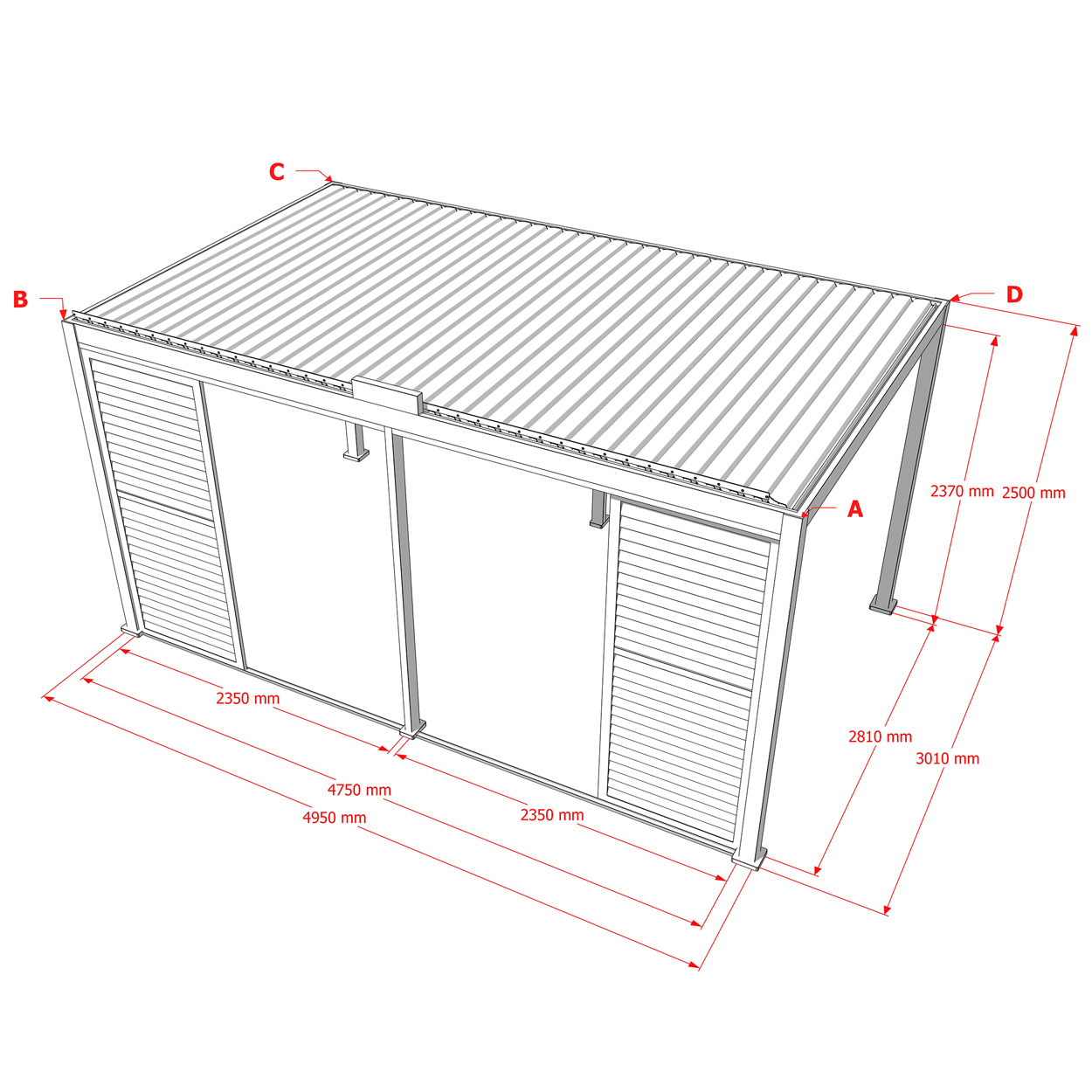 Robuste Seitenwandpaneel Konstruktion aus pulverbeschichtetem Aluminium besteht aus drehbaren horizontalen Lamellen, die über die gesamte Höhe verteilt sind. Die Jalousie-Wand kann manuell geöffnet und geschlossen werden, um die Lichtdurchlässigkeit und Lufteinlass zu regulieren.