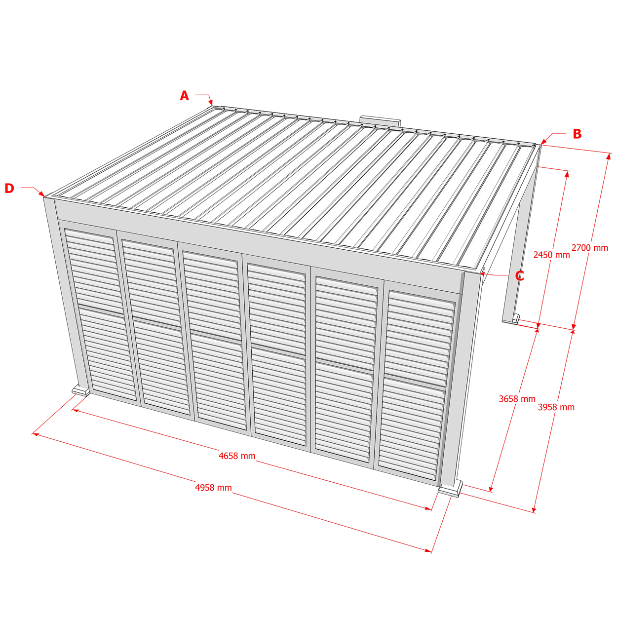 Robuste Seitenwandpaneel Konstruktion aus pulverbeschichtetem Aluminium besteht aus drehbaren horizontalen Lamellen, die über die gesamte Höhe verteilt sind. Die Jalousiewand kann manuell geöffnet und geschlossen werden, um die Lichtdurchlässigkeit und Lufteinlass zu regulieren.