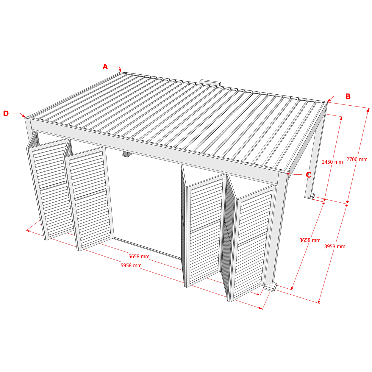 Robuste Seitenwandpaneel Konstruktion aus pulverbeschichtetem Aluminium besteht aus drehbaren horizontalen Lamellen, die über die gesamte Höhe verteilt sind. Die Jalousiewand kann manuell geöffnet und geschlossen werden, um die Lichtdurchlässigkeit und Lufteinlass zu regulieren.