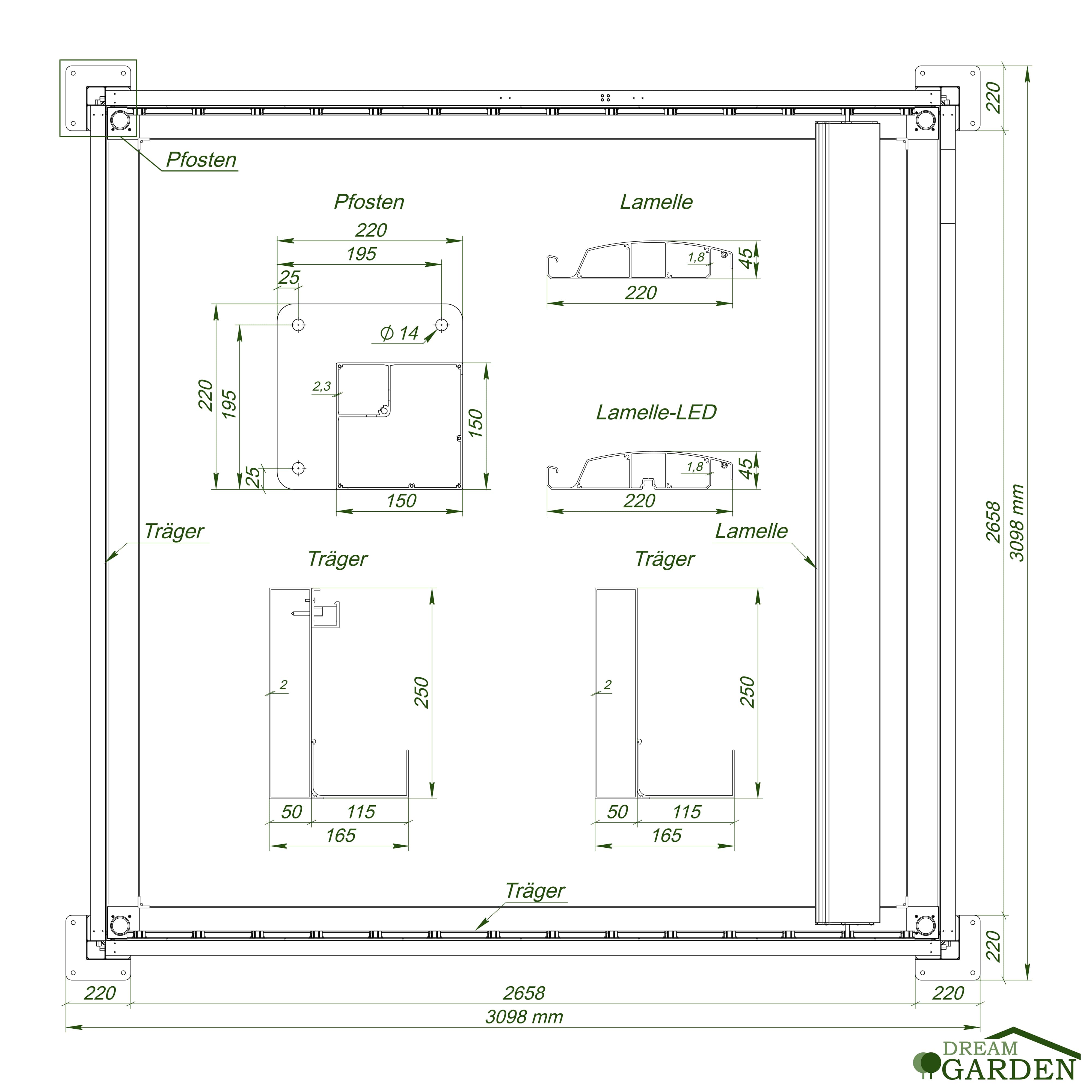 Maße Pfosten: 150x150 mm (Stärke: 2,3 mm)
