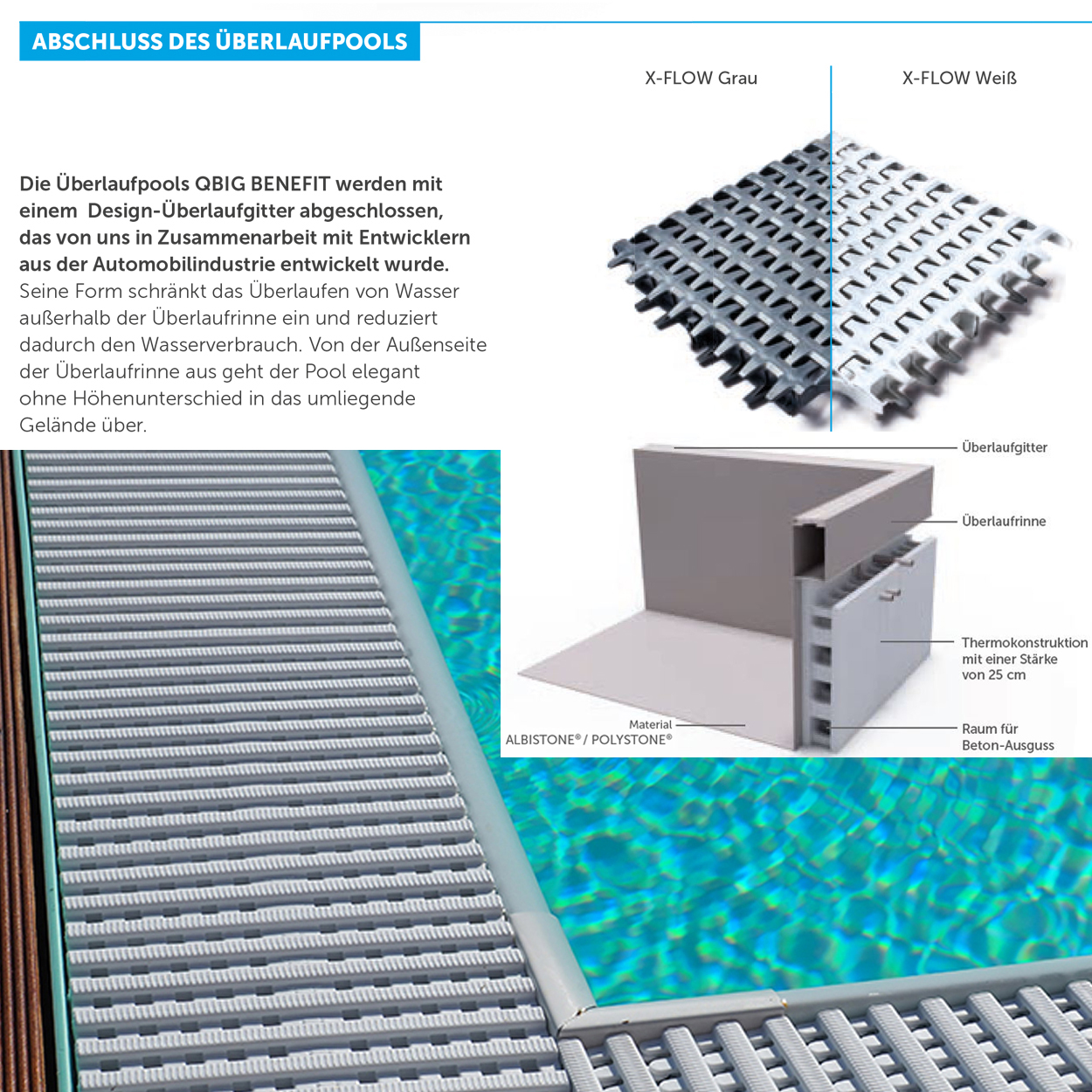 Die Überlaufpools werden mit einem Design-Überlaufgitter abgeschlossen, das in Zusammenarbeit mit Entwicklern aus der Automobilindustrie entwickelt wurde. Die Form schränkt das Überlaufen von Wasser außerhalb der Überlaufrinne ein und reduziert dadurch den Wasserverbrauch. Von der Außenseite der Überlaufrinne aus geht der Pool elegant ohne Höhenunterschied in das umliegende Gelände über. Sauberes Design, das Wasser bis zum Rand und das Gefühl einer unendlichen Wasserfläche.