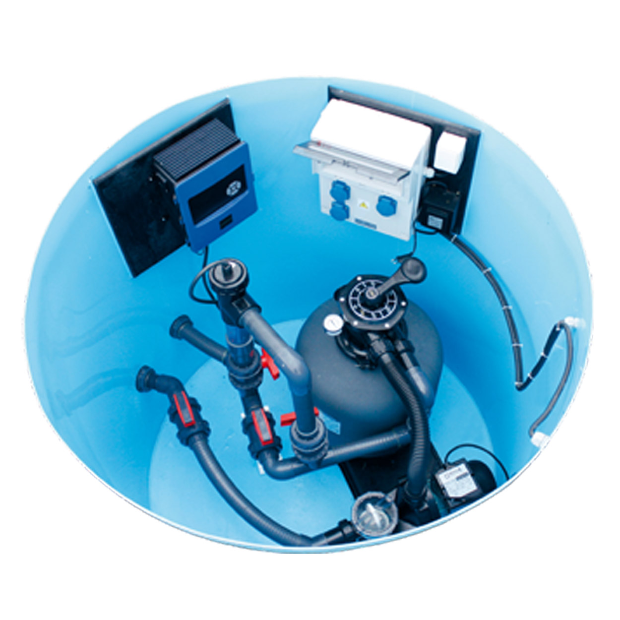 - Stellt den Wasserkreislauf, die Filtration und Desinfektion sicher