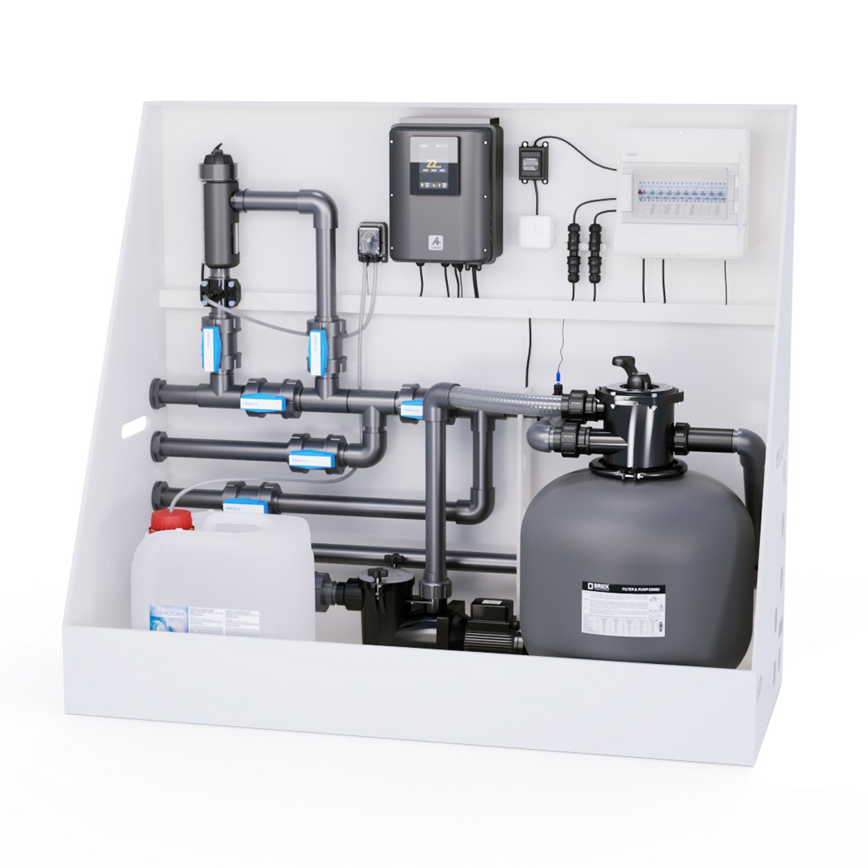 Komfort ist das Wichtigste. Sämtliche Komponente sind unauffällig in einer technologischen Wand verborgen und Sie haben die Pooltechnik immer zur Hand. Der bequemste Zugang zur Pooltechnik ist durch die Platzierung in der technologischen Wand gegeben. Sie ist einfach zugänglich und wird in der Regel in einem Gartenhaus, einer Garage oder im Keller installiert.