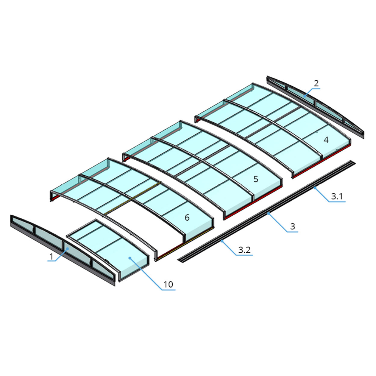 Die Überdachung ist mit teleskopischen Modulen ausgestattet. Diese sind so konzipiert, dass die gesamte Überdachung auf die Länge eines Moduls zusammengeschoben werden kann. Jedes Modul hat standardmäßig zwei Arretierungen mit Sicherheitsrosetten, welche das Modul gegen selbständige Bewegung sichern. In der Grundausstattung dieses Produkts sind die Rosetten nicht abschließbar, auf Wunsch können sie jedoch für einen noch höheren Schutz mit einem Schloss versehen werden. Die Eindeckung des Moduls wird von einer kompaktem Polycarbonat mit 4 mm Stärke gebildet. Das Material mit UV-Schutz unterstützt gleichzeitig durch seine wärmeisolierenden Eigenschaften die Erwärmung des Beckenwassers.