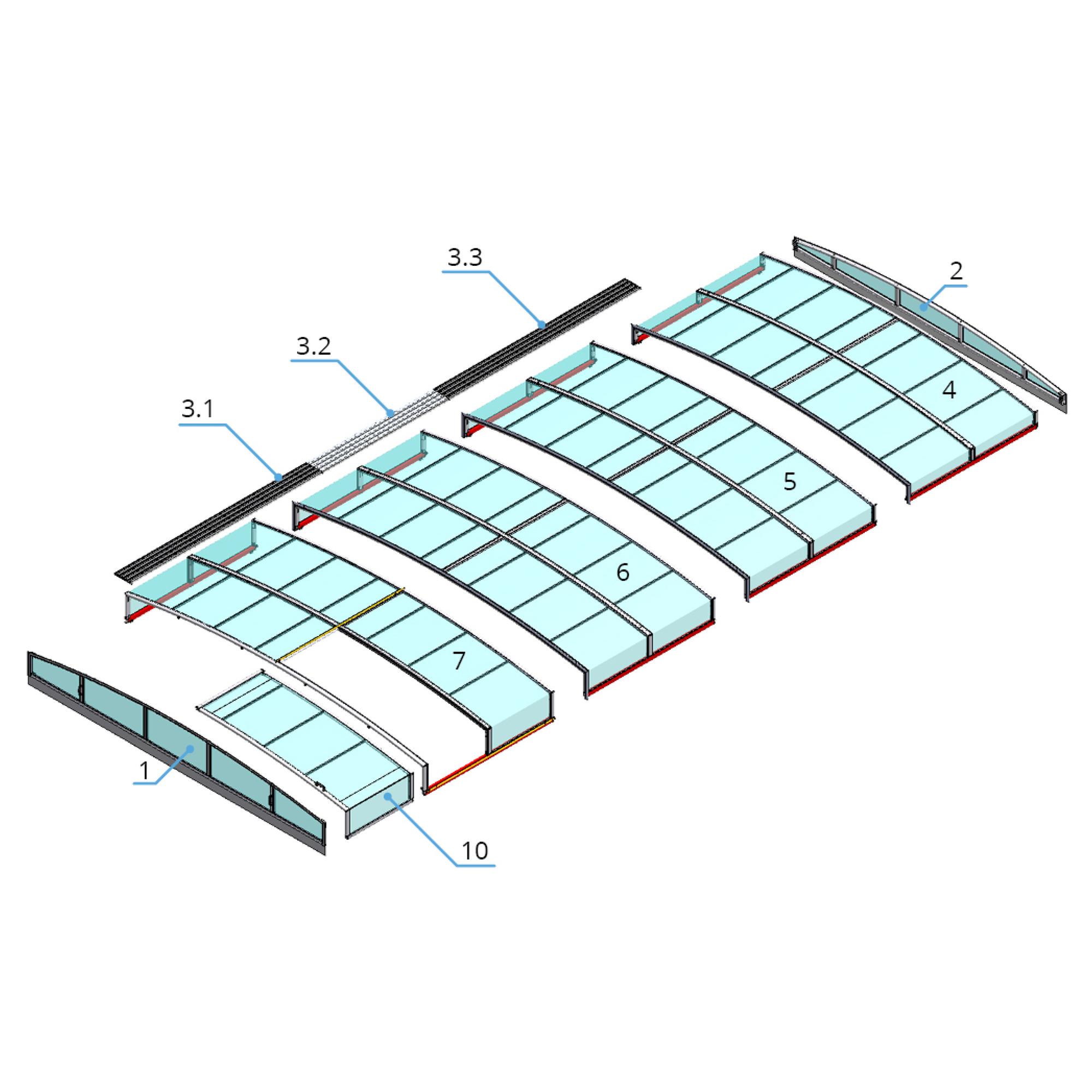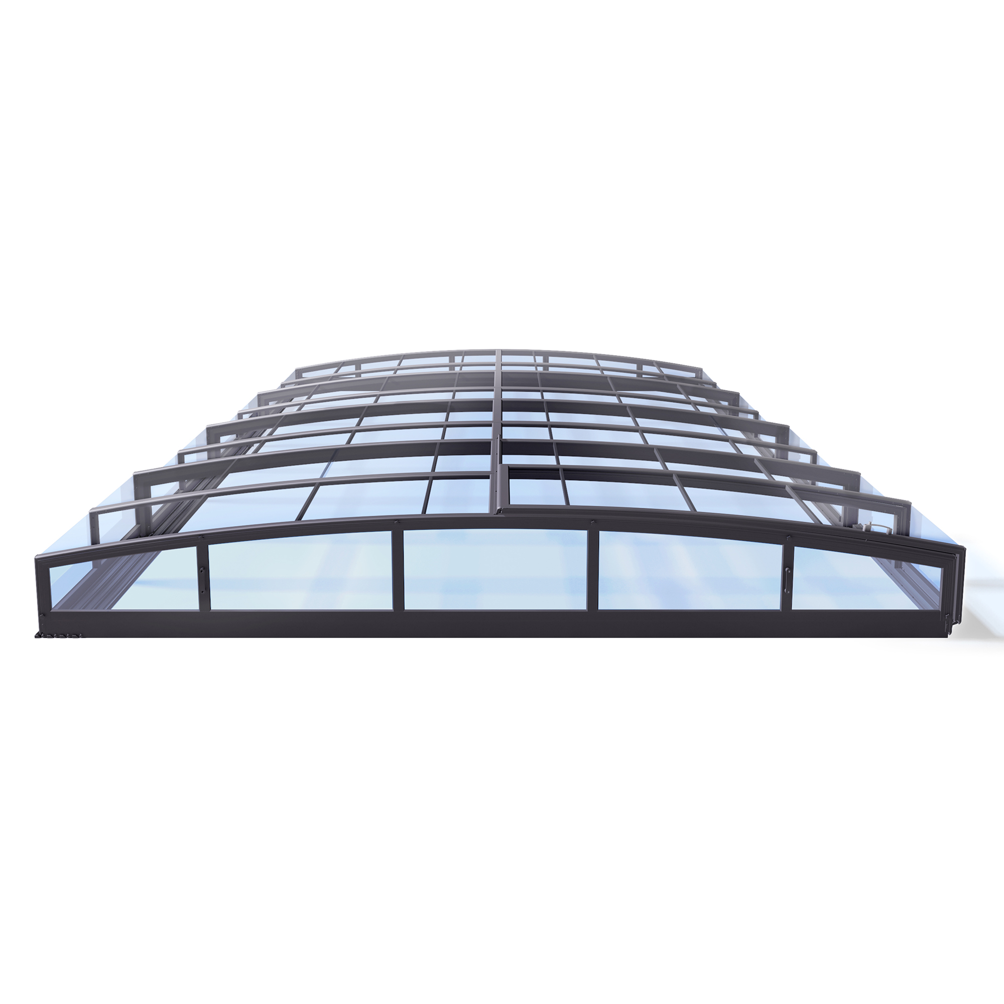 Die Überdachung ist mit teleskopischen Modulen ausgestattet. Diese sind so konzipiert, dass die gesamte Überdachung auf die Länge eines Moduls zusammengeschoben werden kann. Jedes Modul hat standardmäßig zwei Arretierungen mit Sicherheitsrosetten, welche das Modul gegen selbständige Bewegung sichern. In der Grundausstattung dieses Produkts sind die Rosetten nicht abschließbar, auf Wunsch können sie jedoch für einen noch höheren Schutz mit einem Schloss versehen werden. Die Eindeckung des Moduls wird von einer kompaktem Polycarbonat mit 4 mm Stärke gebildet. Das Material mit UV-Schutz unterstützt gleichzeitig durch seine wärmeisolierenden Eigenschaften die Erwärmung des Beckenwassers.