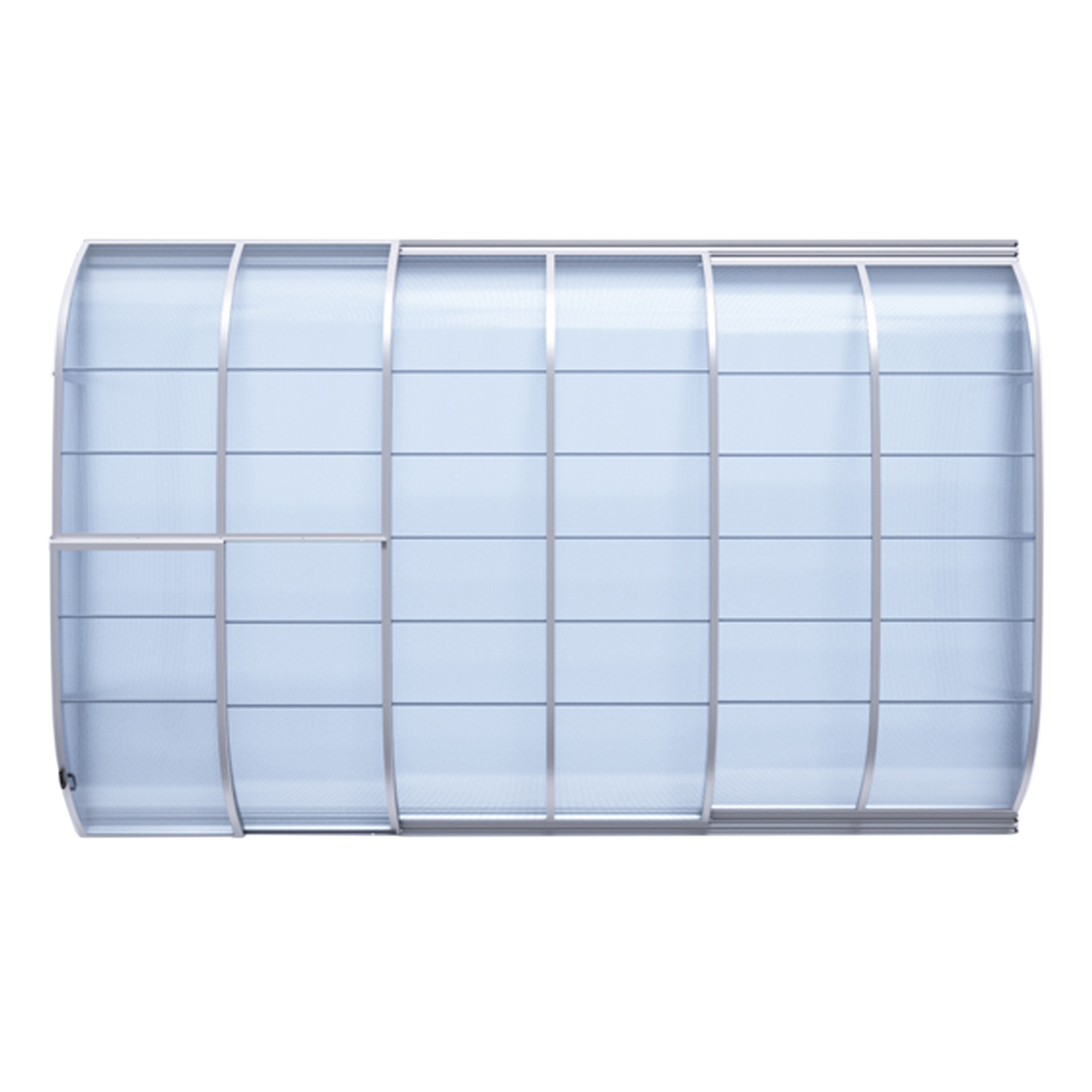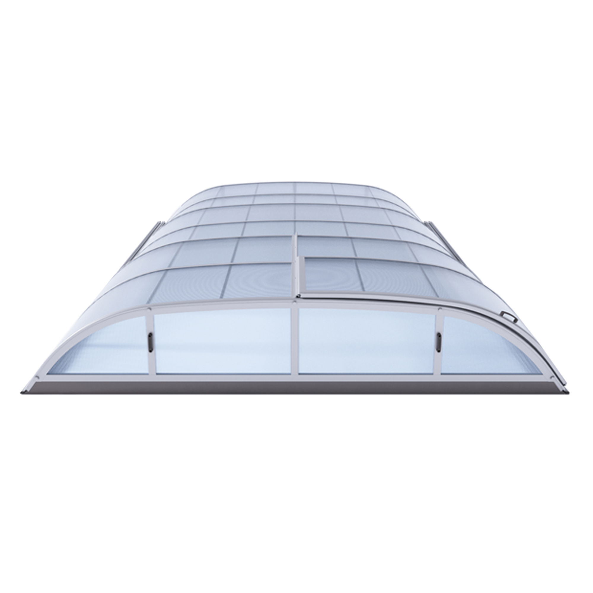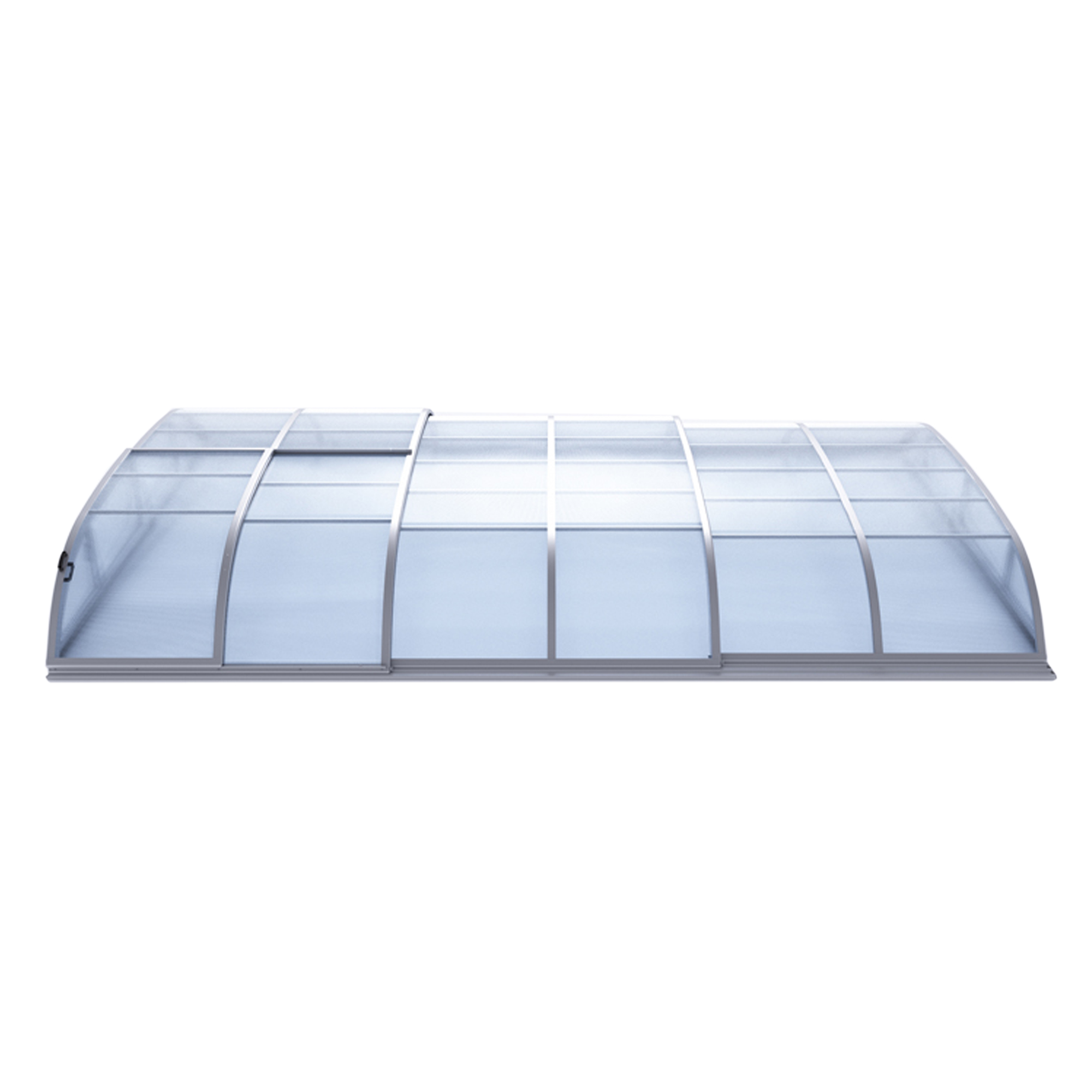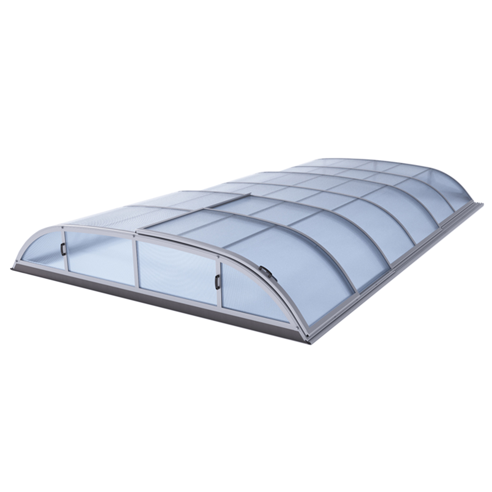 Die Überdachung ist mit teleskopischen Modulen ausgestattet und bietet viel Privatsphäre beim Schwimmen. Die Moduleelemente sind so konzipiert, dass die gesamte Überdachung auf die Länge eines Moduls zusammengeschoben werden kann. Jedes Modul hat standardmäßig zwei Arretierungen mit Sicherheitsrosetten, welche es gegen selbständige Bewegung sichern. Die Eindeckung besteht aus klarem Polycarbonat, das Material mit UV-Schutz unterstützt gleichzeitig durch seine wärmeisolierenden Eigenschaften die Erwärmung des Beckenwassers.