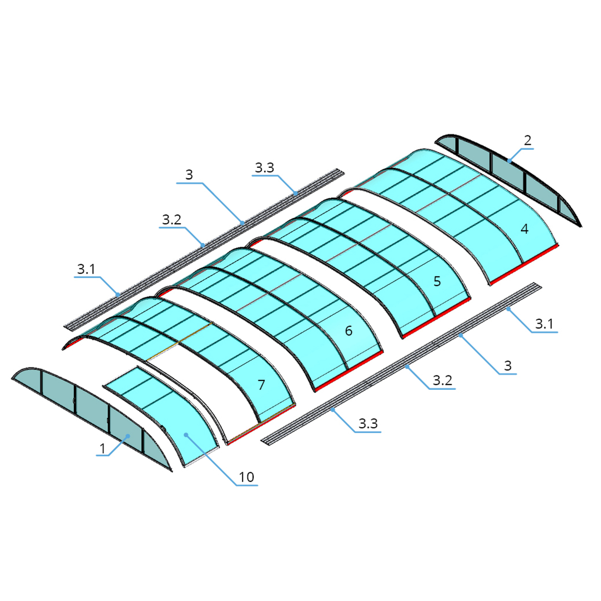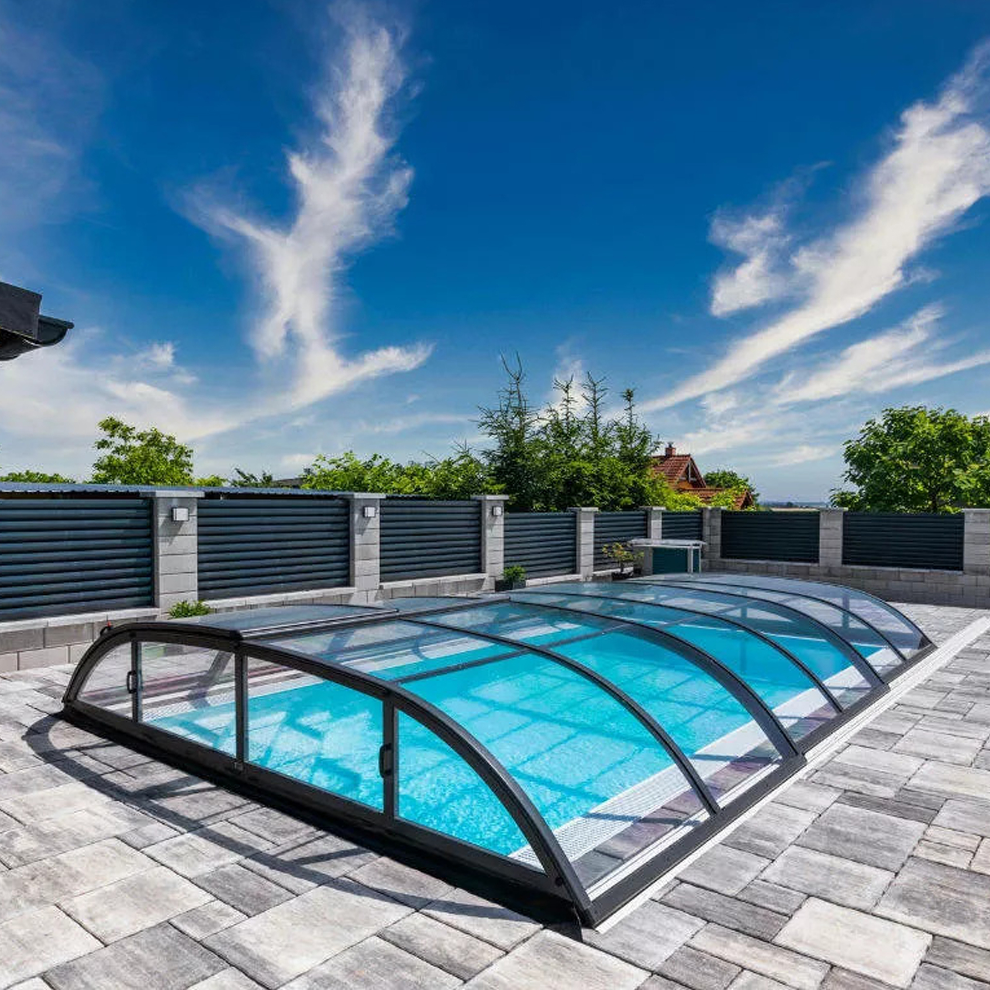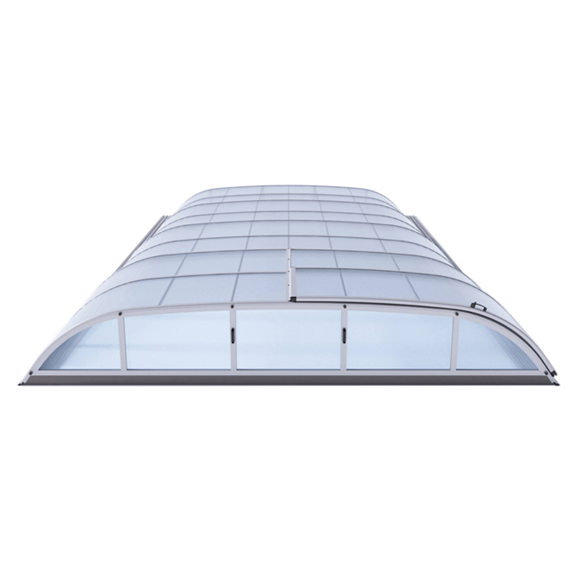 Die Überdachung ist mit teleskopischen Modulen ausgestattet und bietet viel Privatsphäre beim Schwimmen. Die Moduleelemente sind so konzipiert, dass die gesamte Überdachung auf die Länge eines Moduls zusammengeschoben werden kann. Jedes Modul hat standardmäßig zwei Arretierungen mit Sicherheitsrosetten, welche es gegen selbständige Bewegung sichern. Die Eindeckung besteht aus klarem Polycarbonat, das Material mit UV-Schutz unterstützt gleichzeitig durch seine wärmeisolierenden Eigenschaften die Erwärmung des Beckenwassers.
