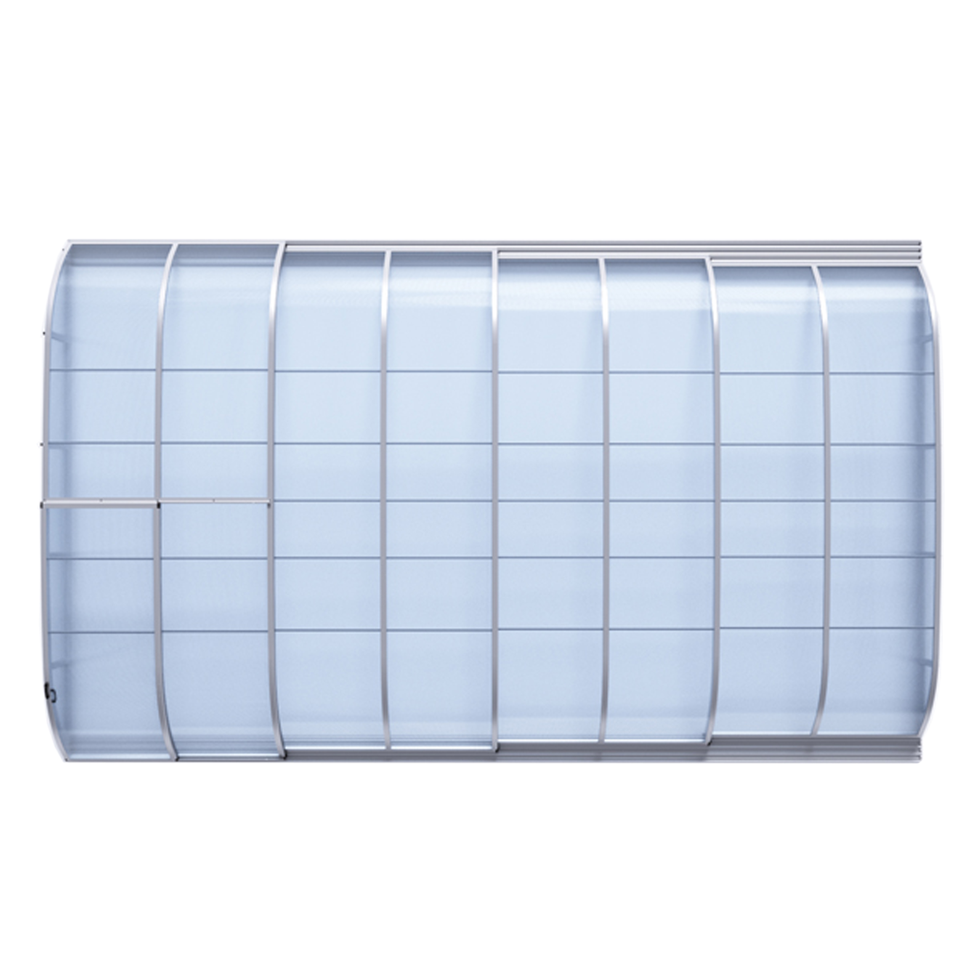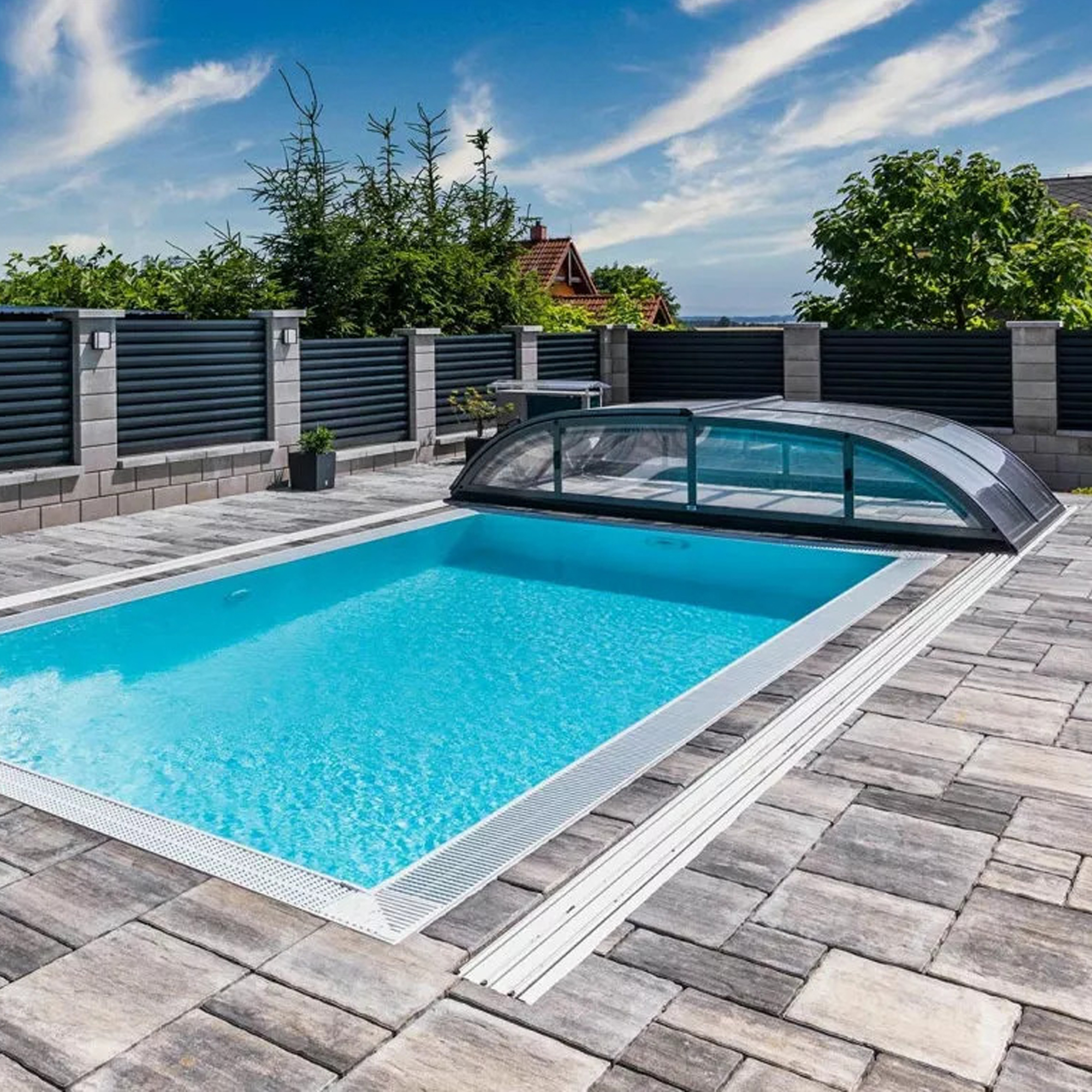 Die Überdachung ist mit teleskopischen Modulen ausgestattet und bietet viel Privatsphäre beim Schwimmen. Die Moduleelemente sind so konzipiert, dass die gesamte Überdachung auf die Länge eines Moduls zusammengeschoben werden kann. Jedes Modul hat standardmäßig zwei Arretierungen mit Sicherheitsrosetten, welche es gegen selbständige Bewegung sichern. Die Eindeckung besteht aus klarem Polycarbonat, das Material mit UV-Schutz unterstützt gleichzeitig durch seine wärmeisolierenden Eigenschaften die Erwärmung des Beckenwassers.