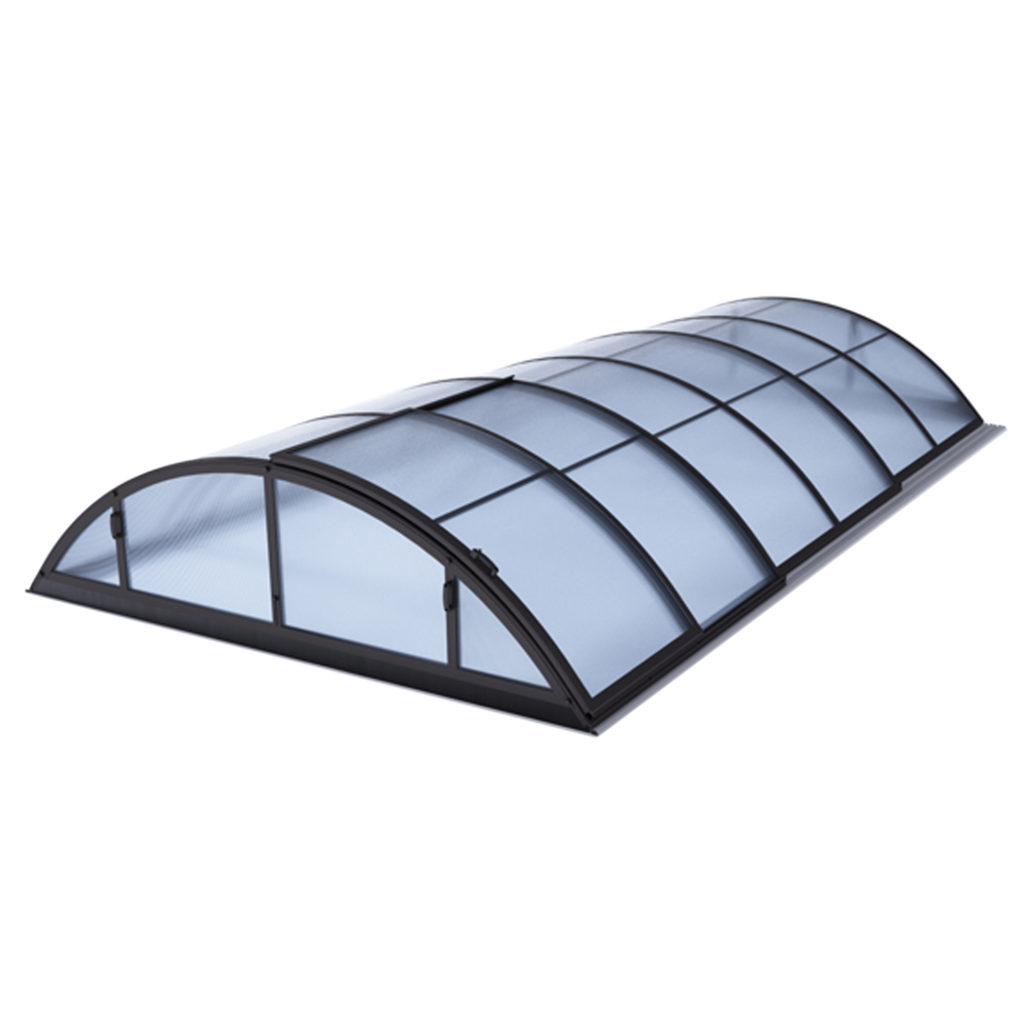 Die Überdachung ist mit teleskopischen Modulen ausgestattet und bietet viel Privatsphäre beim Schwimmen. Die Modulelemente sind so konzipiert, dass die gesamte Überdachung auf die Länge eines Moduls zusammengeschoben werden kann. Jedes Modul hat standardmäßig zwei Arretierungen mit Sicherheitsrosetten, welche es gegen selbständige Bewegung sichern. Die Eindeckung besteht aus klarem Polycarbonat, das Material mit UV-Schutz unterstützt gleichzeitig durch seine wärmeisolierenden Eigenschaften die Erwärmung des Beckenwassers.