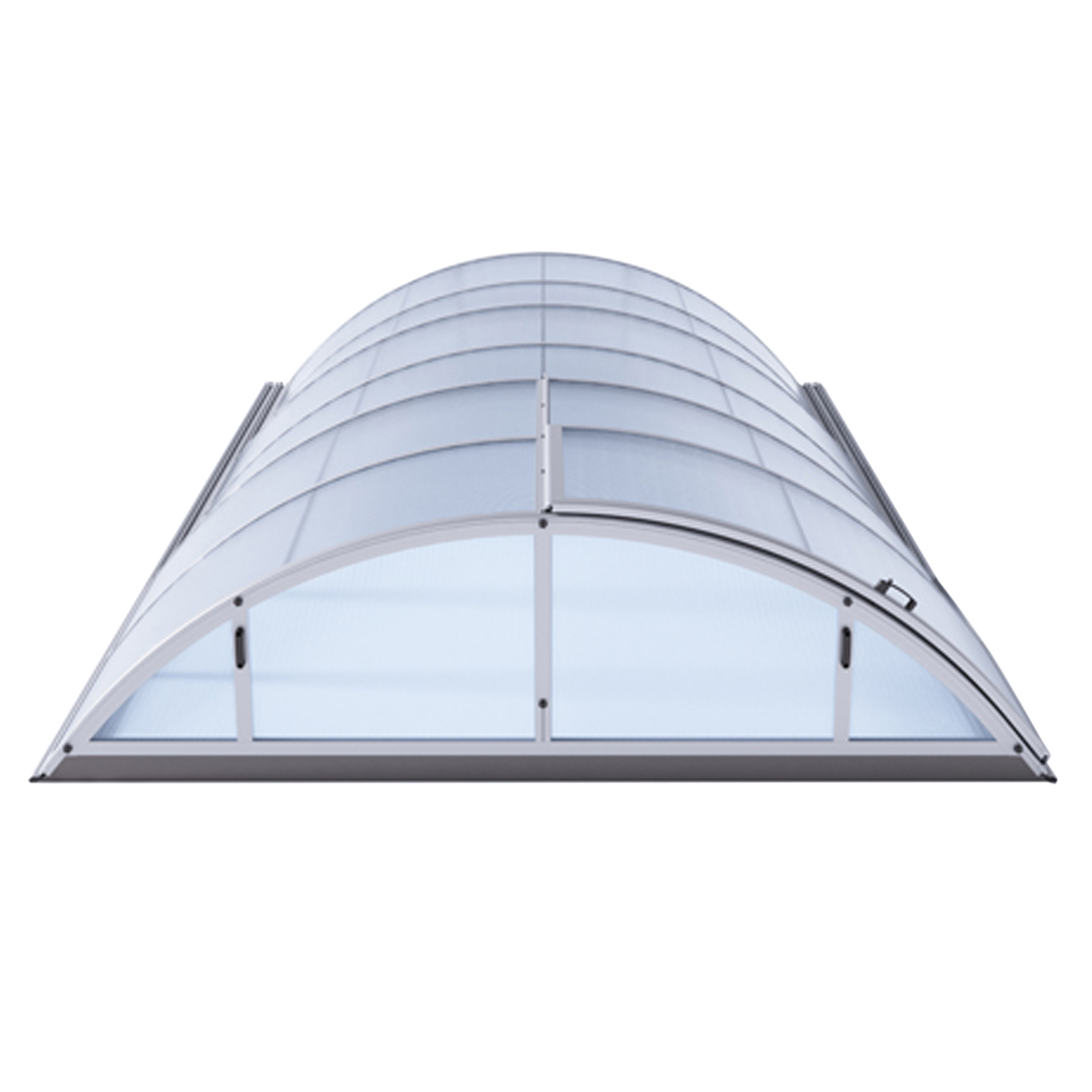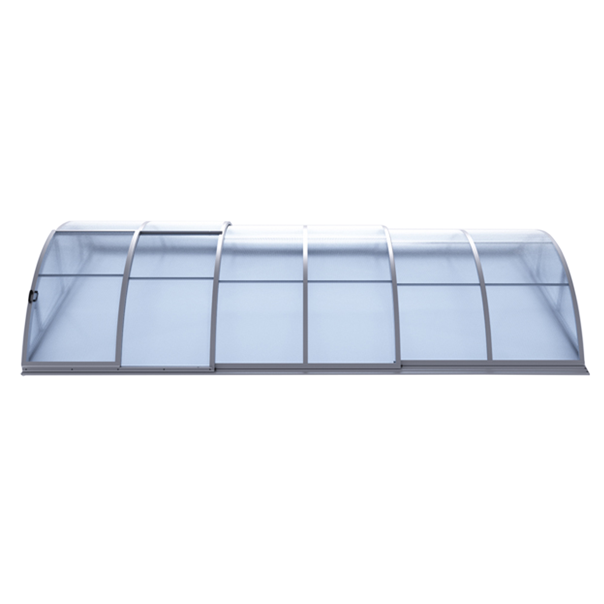 Die Überdachung ist mit teleskopischen Modulen ausgestattet und bietet viel Privatsphäre beim Schwimmen. Die Modulelemente sind so konzipiert, dass die gesamte Überdachung auf die Länge eines Moduls zusammengeschoben werden kann. Jedes Modul hat standardmäßig zwei Arretierungen mit Sicherheitsrosetten, welche es gegen selbständige Bewegung sichern. Die Eindeckung besteht aus klarem Polycarbonat, das Material mit UV-Schutz unterstützt gleichzeitig durch seine wärmeisolierenden Eigenschaften die Erwärmung des Beckenwassers.
