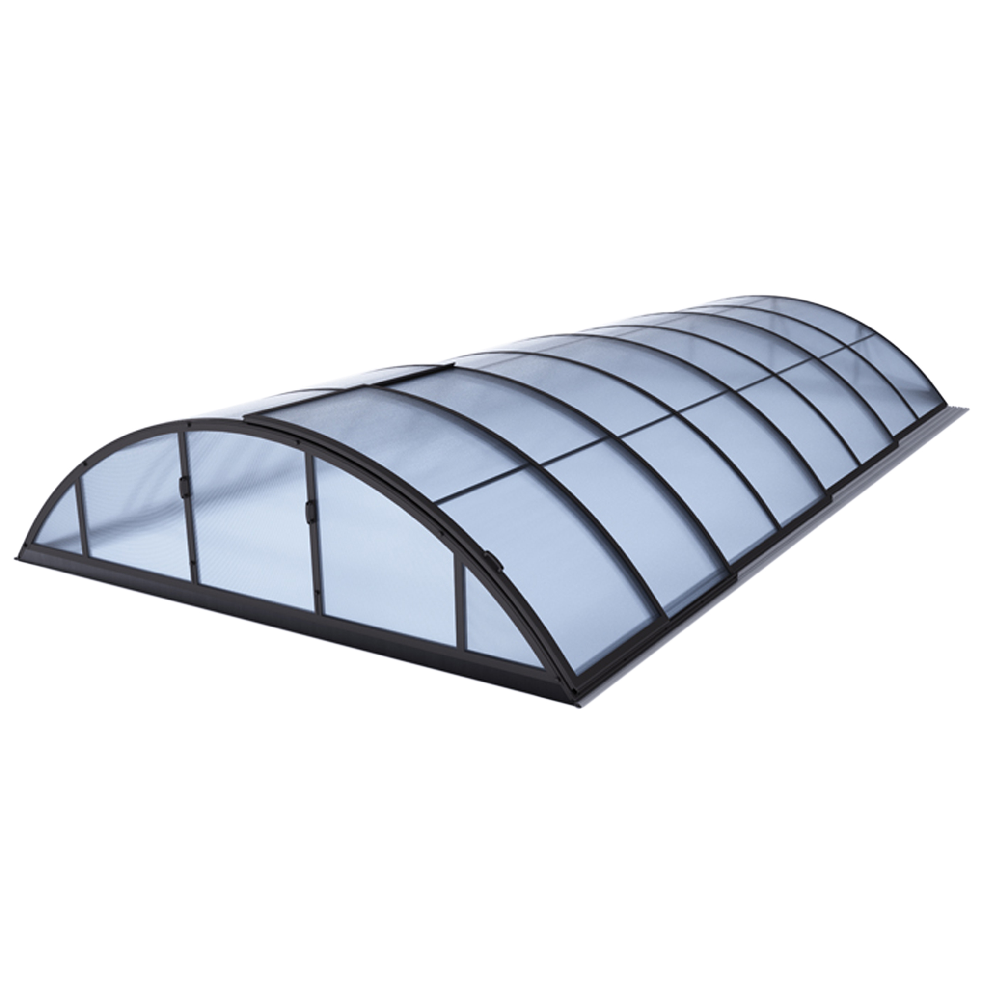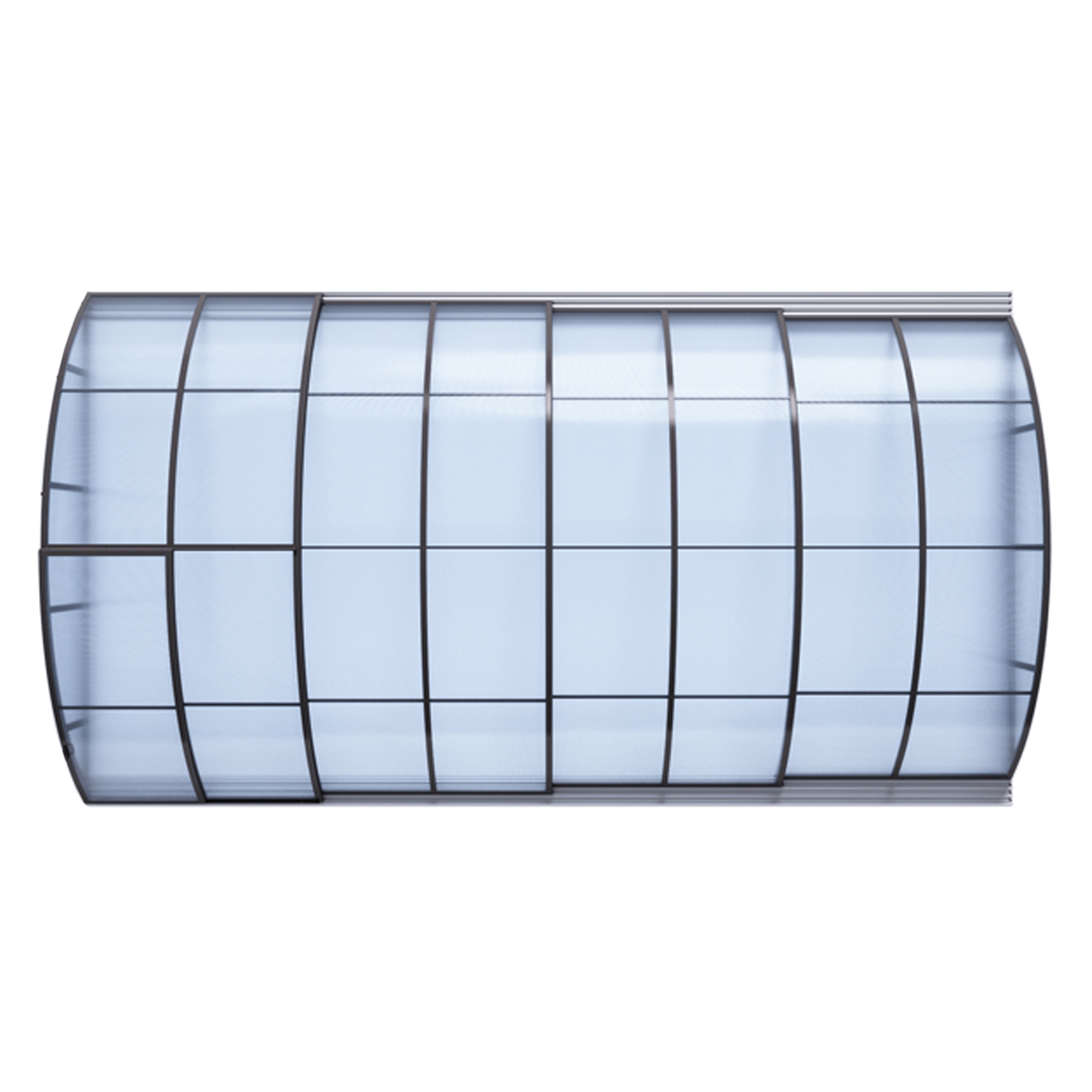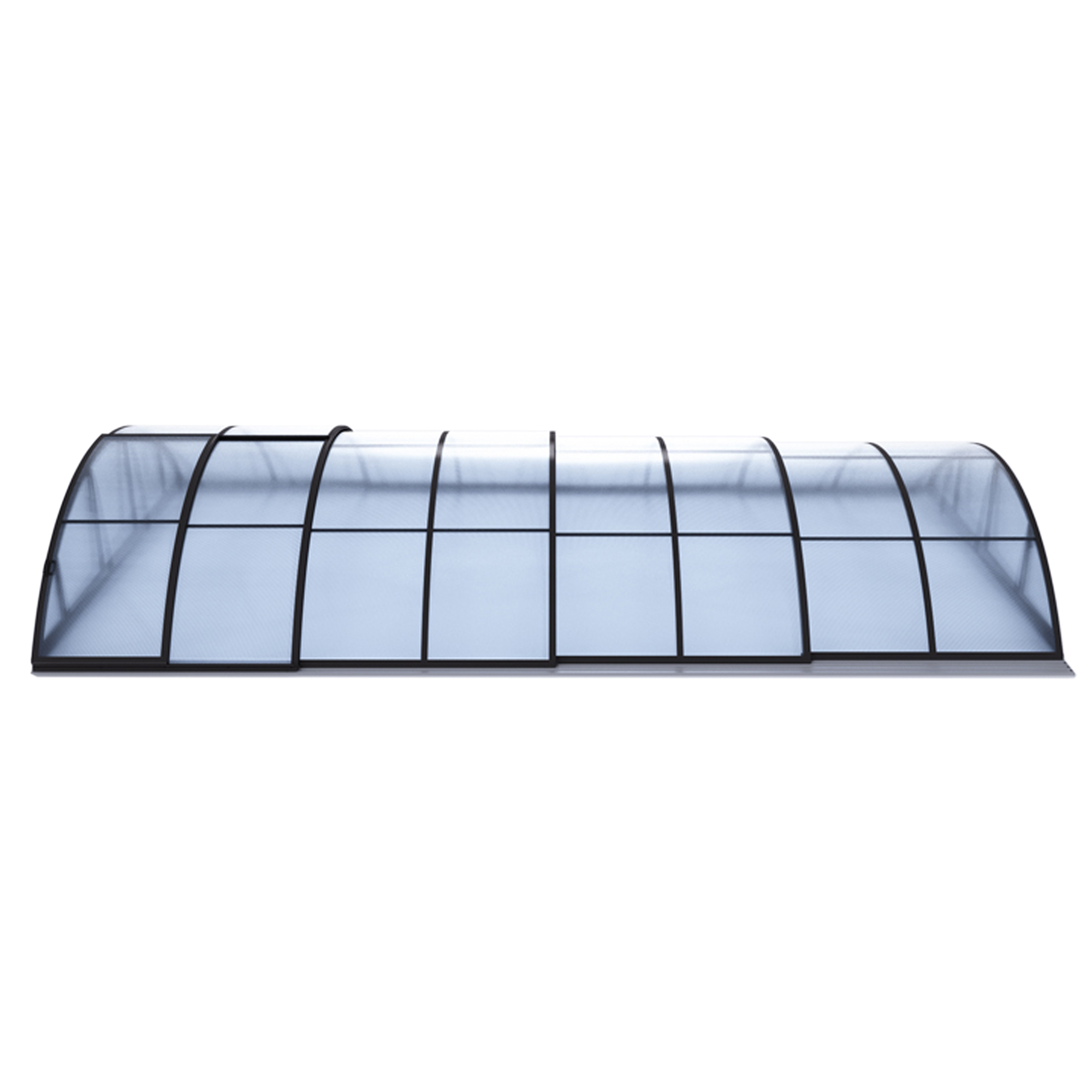 Die Überdachung ist mit teleskopischen Modulen ausgestattet und bietet viel Privatsphäre beim Schwimmen. Die Modulelemente sind so konzipiert, dass die gesamte Überdachung auf die Länge eines Moduls zusammengeschoben werden kann. Jedes Modul hat standardmäßig zwei Arretierungen mit Sicherheitsrosetten, welche es gegen selbständige Bewegung sichern. Die Eindeckung besteht aus klarem Polycarbonat, das Material mit UV-Schutz unterstützt gleichzeitig durch seine wärmeisolierenden Eigenschaften die Erwärmung des Beckenwassers.