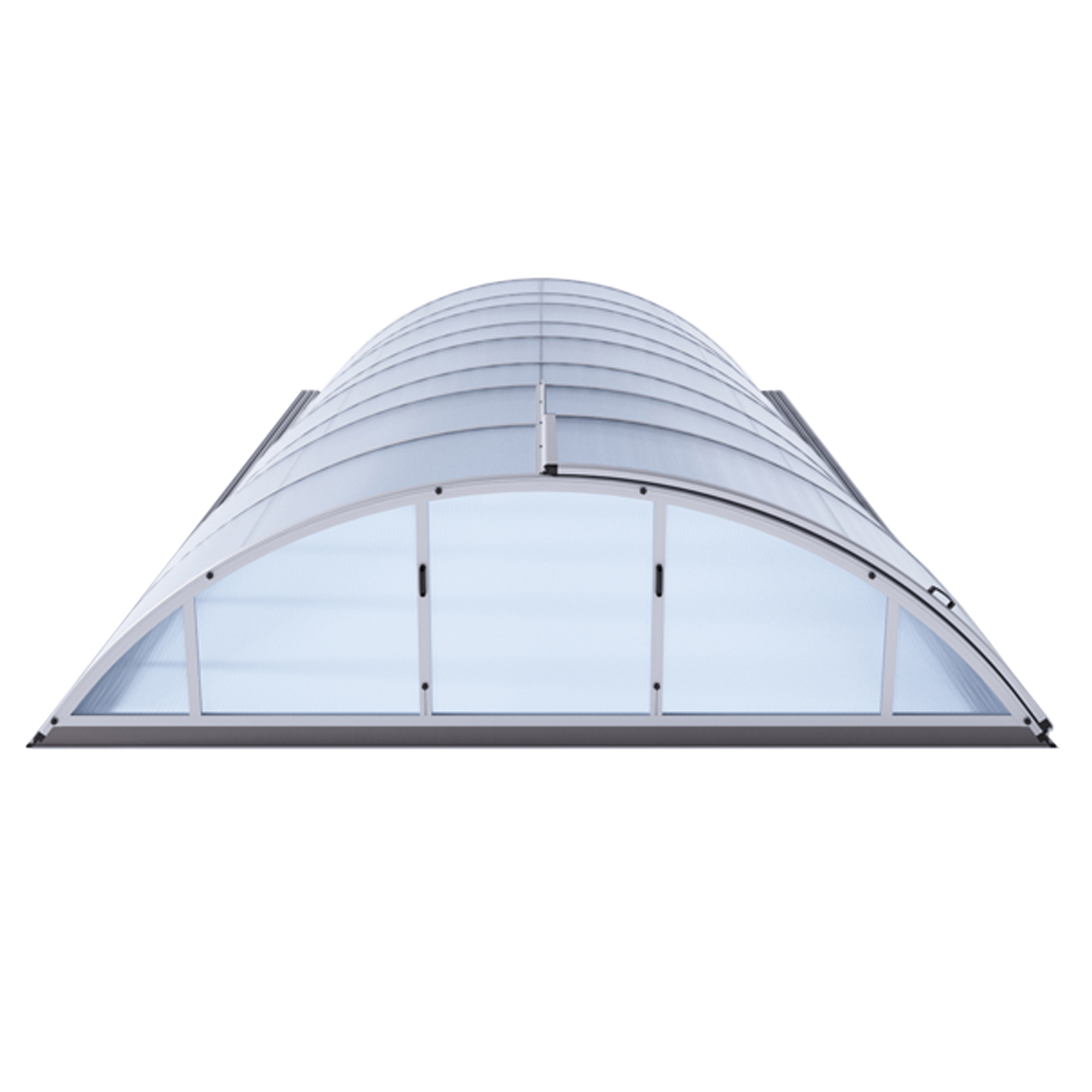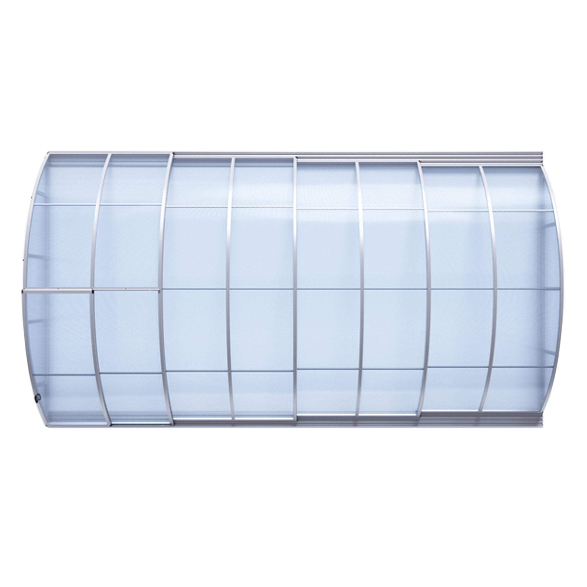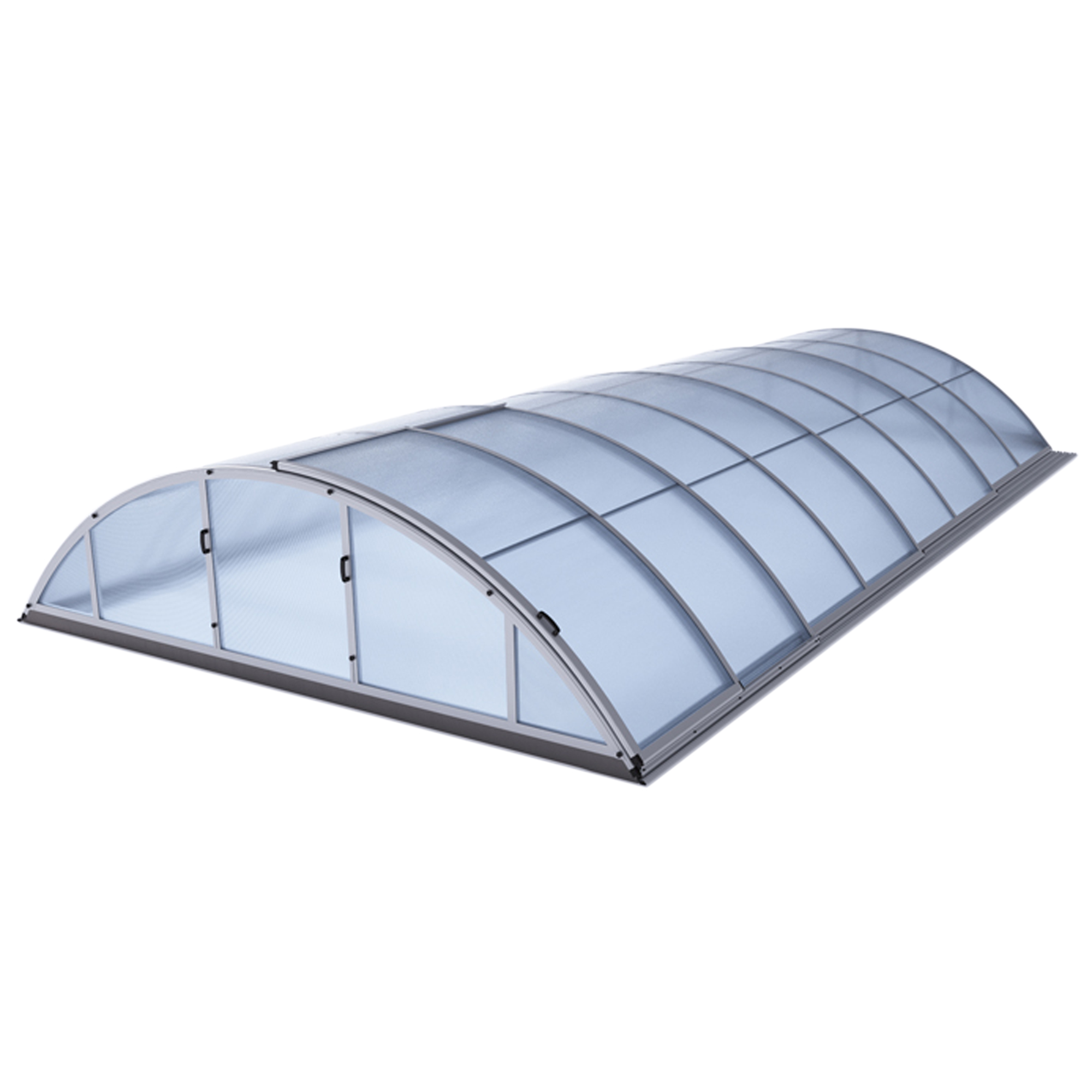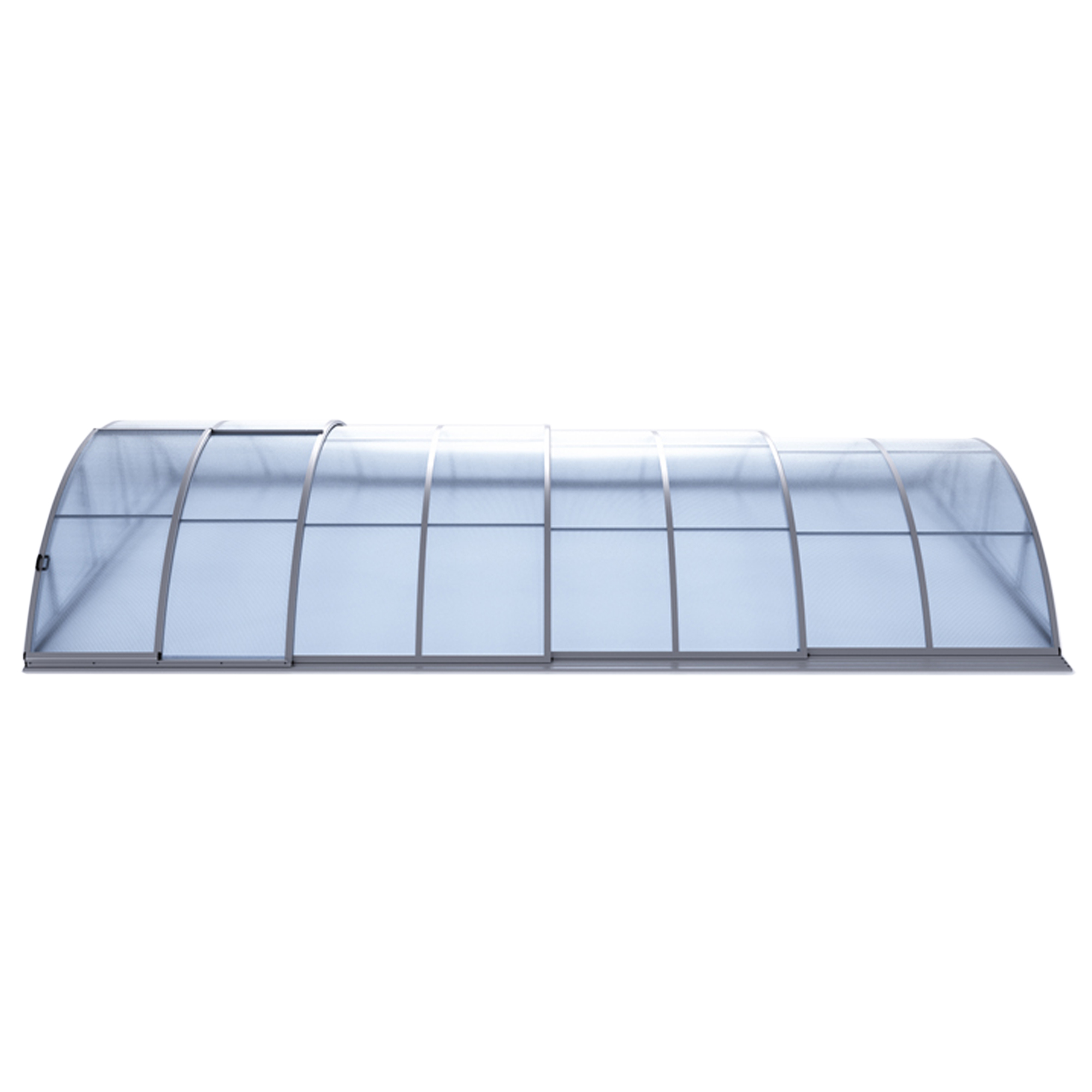 Die Überdachung ist mit teleskopischen Modulen ausgestattet und bietet viel Privatsphäre beim Schwimmen. Die Modulelemente sind so konzipiert, dass die gesamte Überdachung auf die Länge eines Moduls zusammengeschoben werden kann. Jedes Modul hat standardmäßig zwei Arretierungen mit Sicherheitsrosetten, welche es gegen selbständige Bewegung sichern. Die Eindeckung besteht aus klarem Polycarbonat, das Material mit UV-Schutz unterstützt gleichzeitig durch seine wärmeisolierenden Eigenschaften die Erwärmung des Beckenwassers.