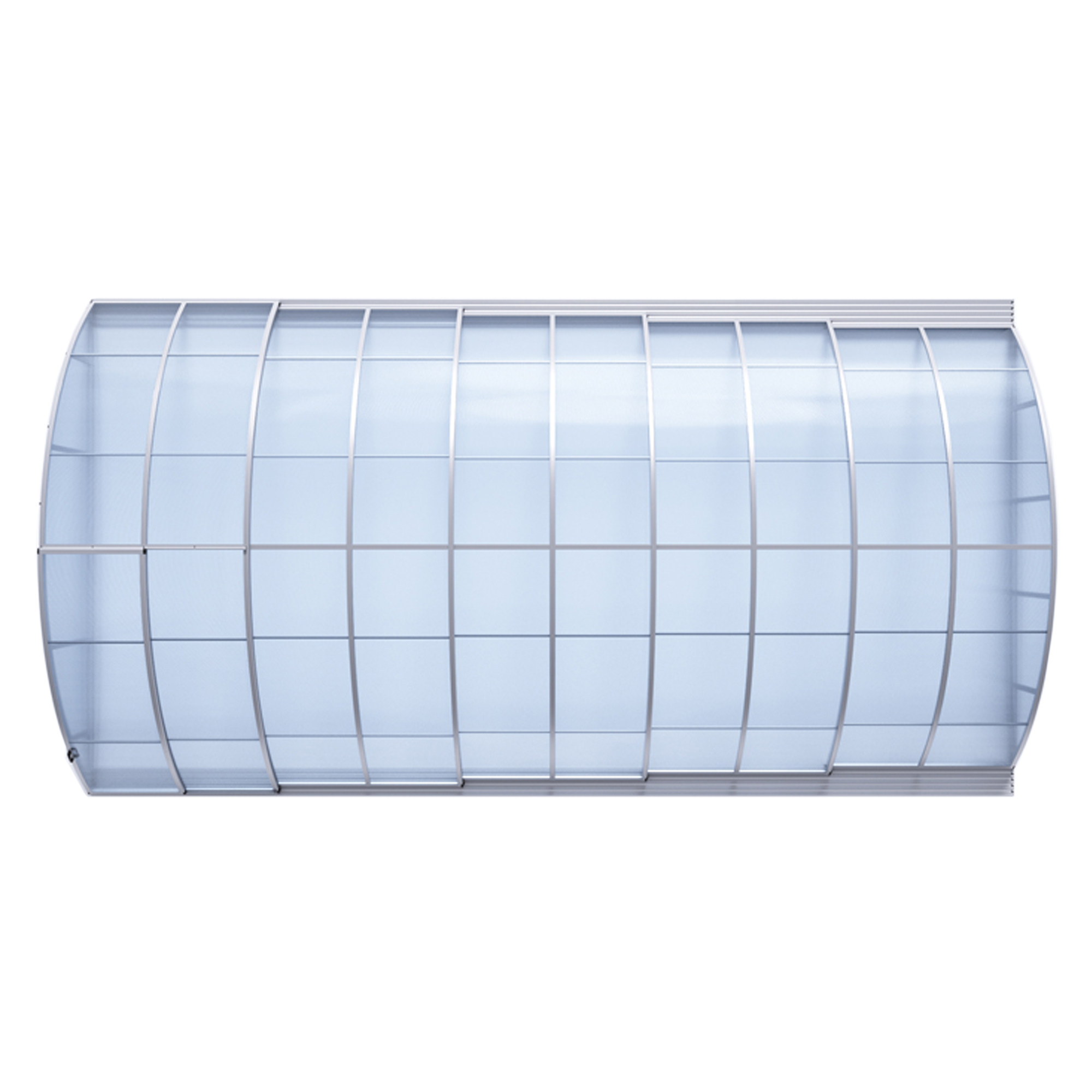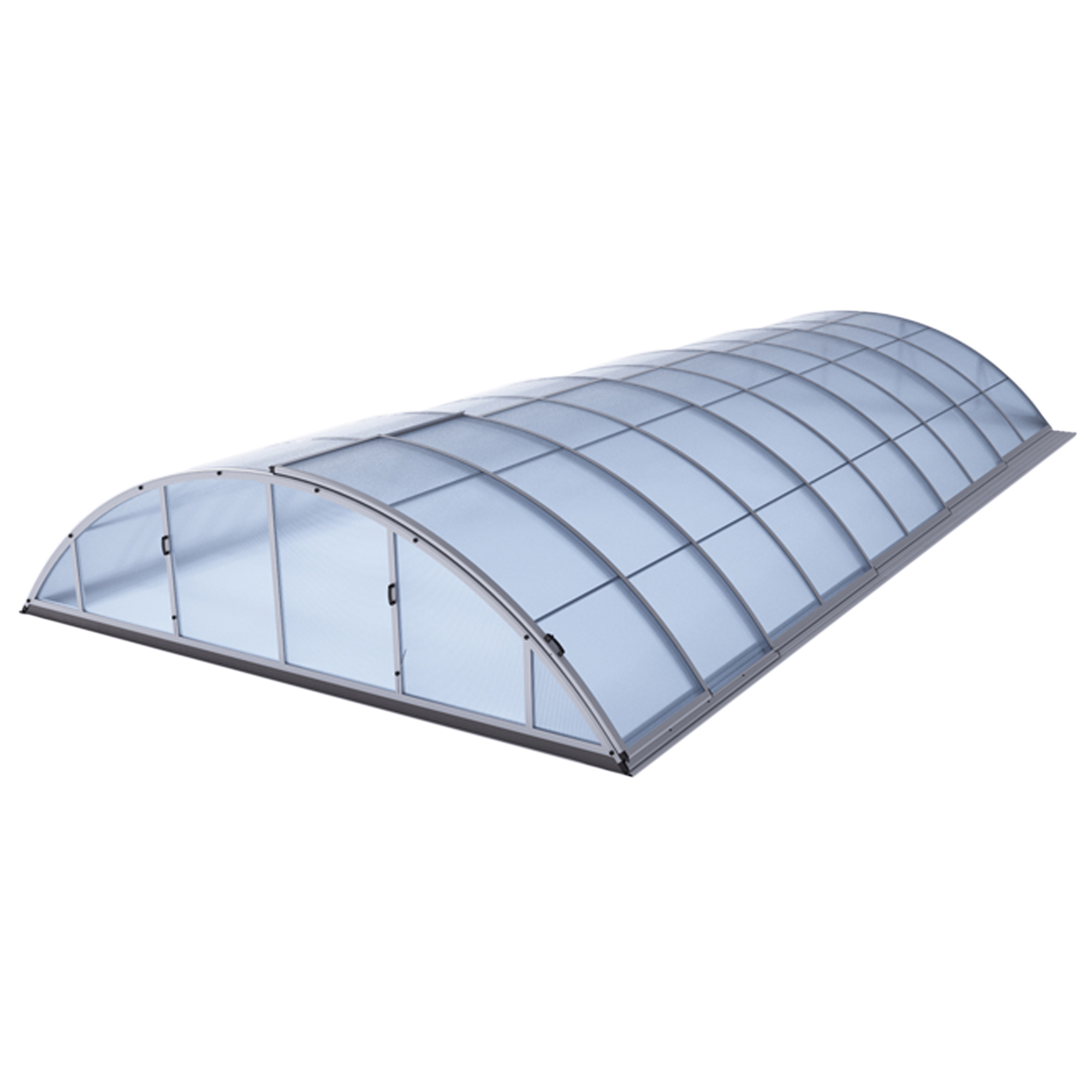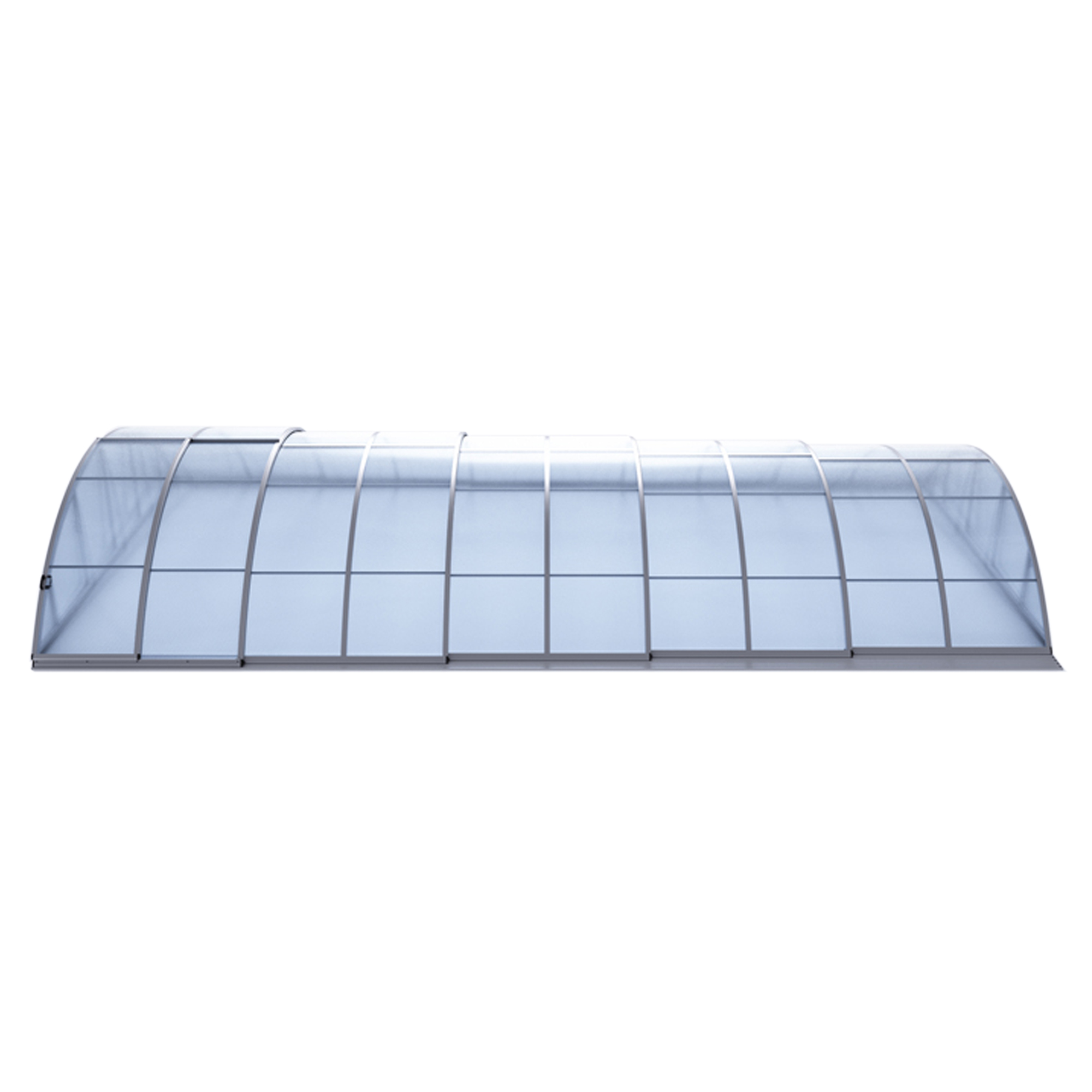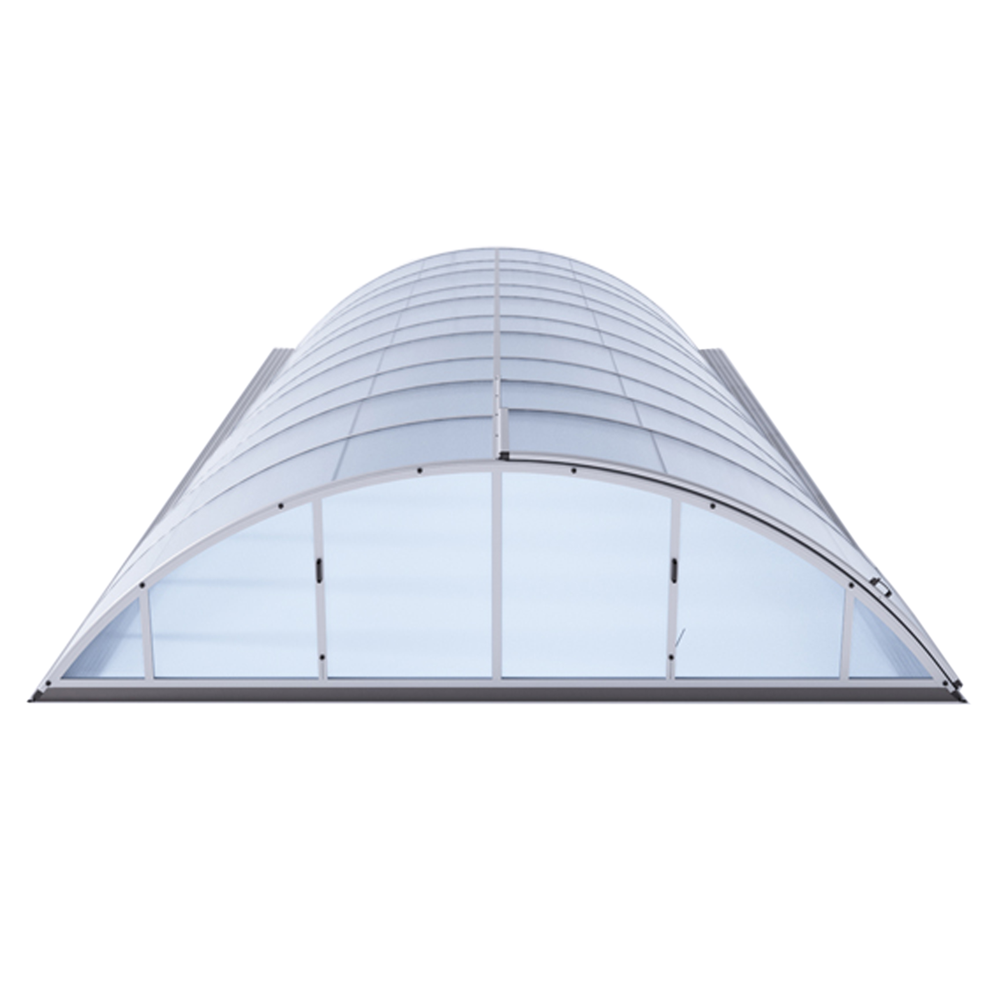 Die Überdachung ist mit teleskopischen Modulen ausgestattet und bietet viel Privatsphäre beim Schwimmen. Die Modulelemente sind so konzipiert, dass die gesamte Überdachung auf die Länge eines Moduls zusammengeschoben werden kann. Jedes Modul hat standardmäßig zwei Arretierungen mit Sicherheitsrosetten, welche es gegen selbständige Bewegung sichern. Die Eindeckung besteht aus klarem Polycarbonat, das Material mit UV-Schutz unterstützt gleichzeitig durch seine wärmeisolierenden Eigenschaften die Erwärmung des Beckenwassers.