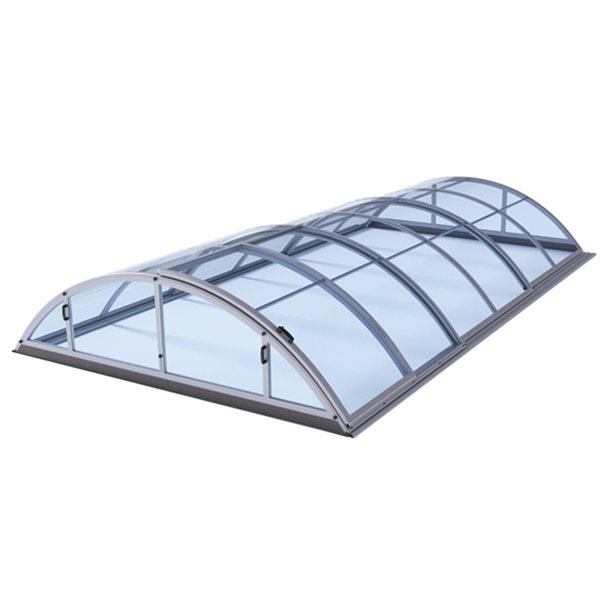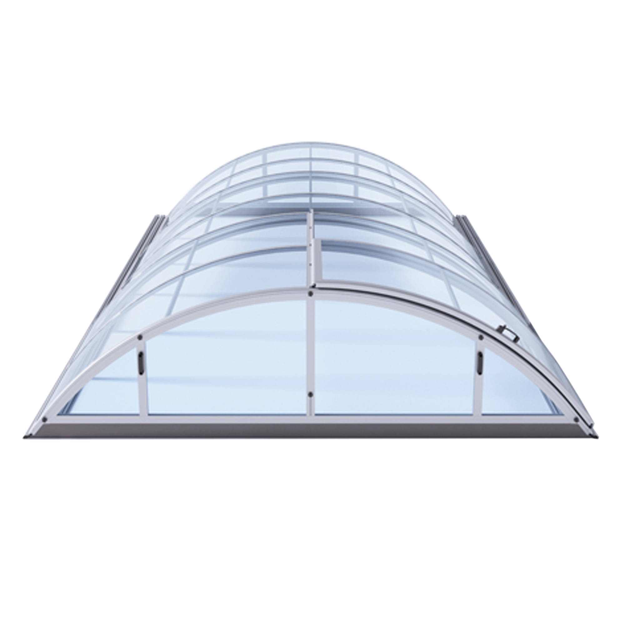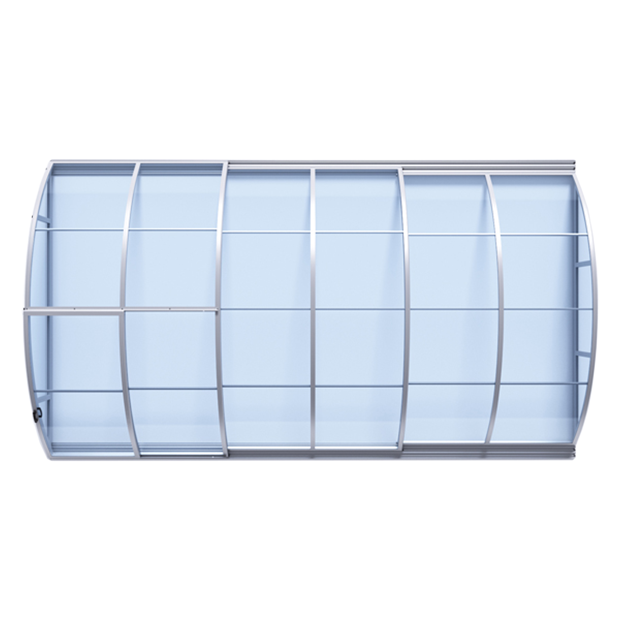 Die Überdachung ist mit teleskopischen Modulen ausgestattet und bietet viel Privatsphäre beim Schwimmen. Die Modulelemente sind so konzipiert, dass die gesamte Überdachung auf die Länge eines Moduls zusammengeschoben werden kann. Jedes Modul hat standardmäßig zwei Arretierungen mit Sicherheitsrosetten, welche es gegen selbständige Bewegung sichern. Die Eindeckung besteht aus klarem Polycarbonat, das Material mit UV-Schutz unterstützt gleichzeitig durch seine wärmeisolierenden Eigenschaften die Erwärmung des Beckenwassers.