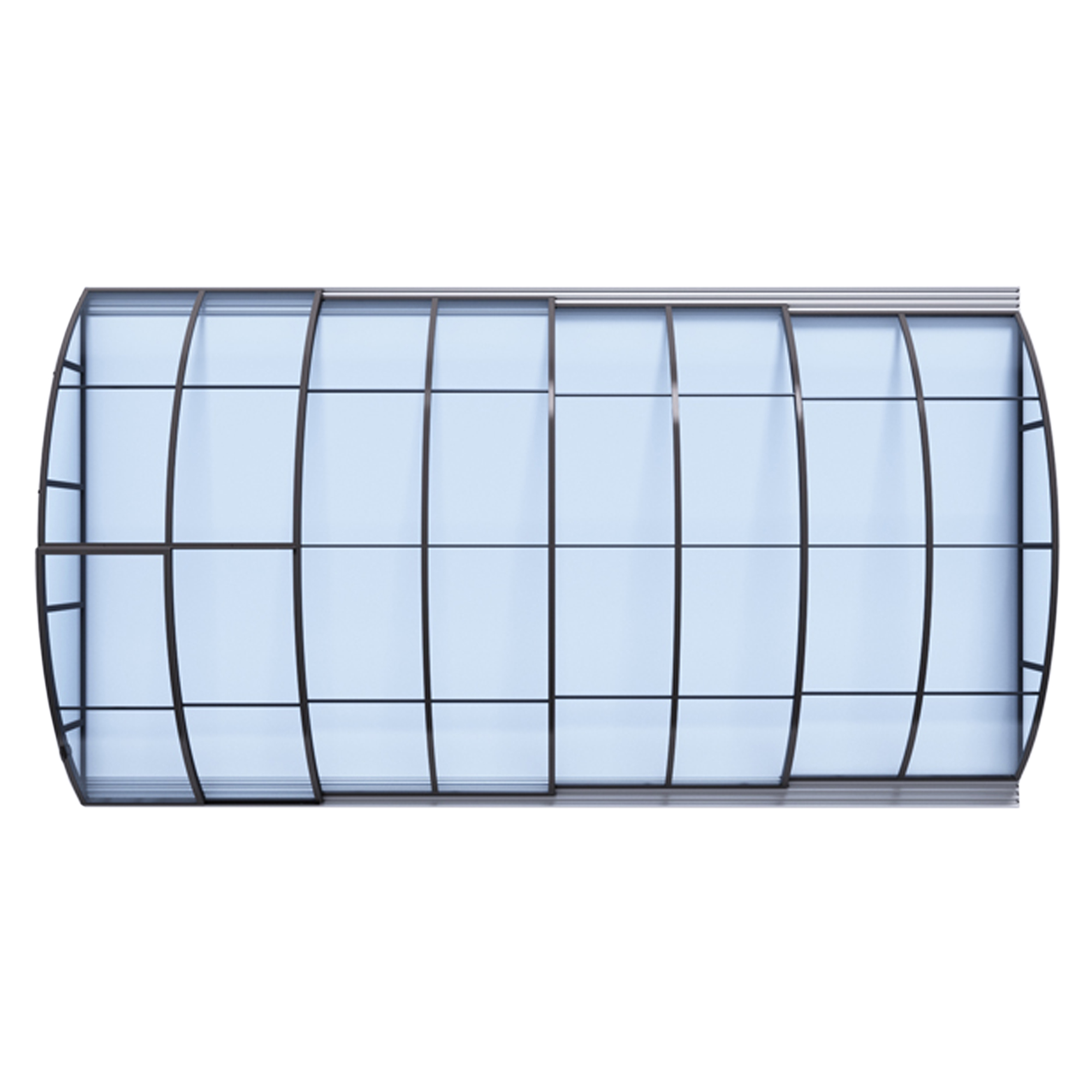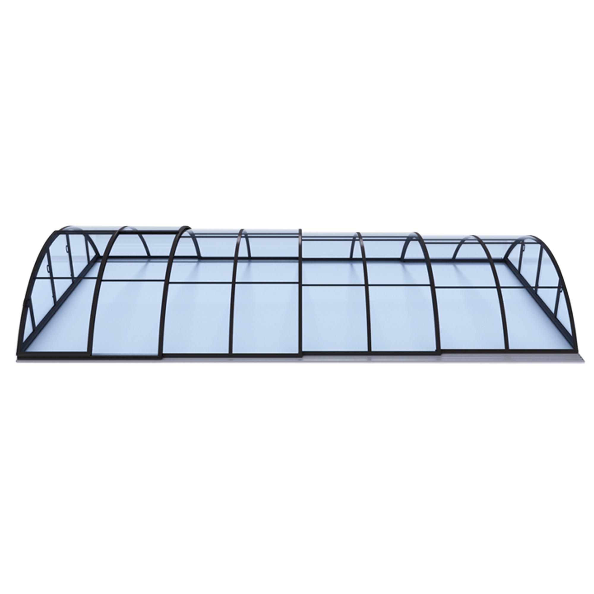 Die Überdachung ist mit teleskopischen Modulen ausgestattet und bietet viel Privatsphäre beim Schwimmen. Die Modulelemente sind so konzipiert, dass die gesamte Überdachung auf die Länge eines Moduls zusammengeschoben werden kann. Jedes Modul hat standardmäßig zwei Arretierungen mit Sicherheitsrosetten, welche es gegen selbständige Bewegung sichern. Die Eindeckung besteht aus klarem Polycarbonat, das Material mit UV-Schutz unterstützt gleichzeitig durch seine wärmeisolierenden Eigenschaften die Erwärmung des Beckenwassers.