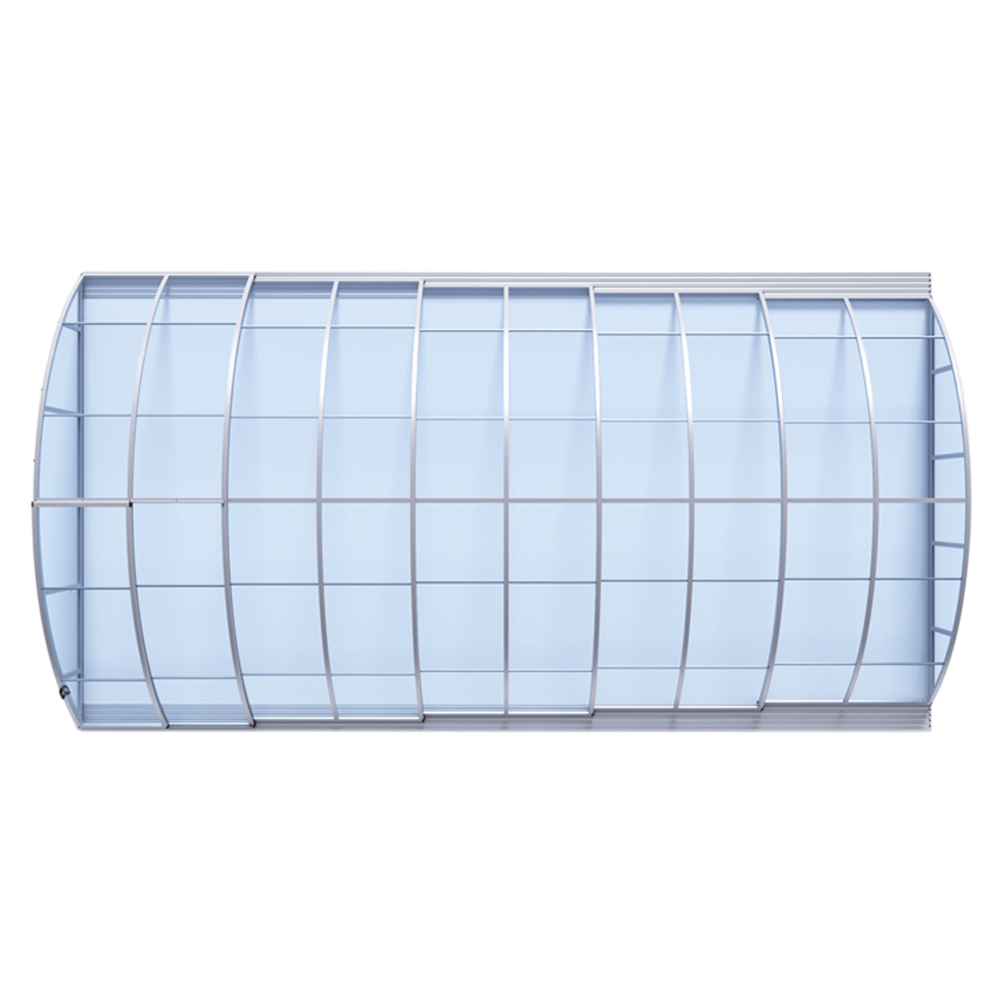 Die Überdachung ist mit teleskopischen Modulen ausgestattet und bietet viel Privatsphäre beim Schwimmen. Die Modulelemente sind so konzipiert, dass die gesamte Überdachung auf die Länge eines Moduls zusammengeschoben werden kann. Jedes Modul hat standardmäßig zwei Arretierungen mit Sicherheitsrosetten, welche es gegen selbständige Bewegung sichern. Die Eindeckung besteht aus klarem Polycarbonat, das Material mit UV-Schutz unterstützt gleichzeitig durch seine wärmeisolierenden Eigenschaften die Erwärmung des Beckenwassers.