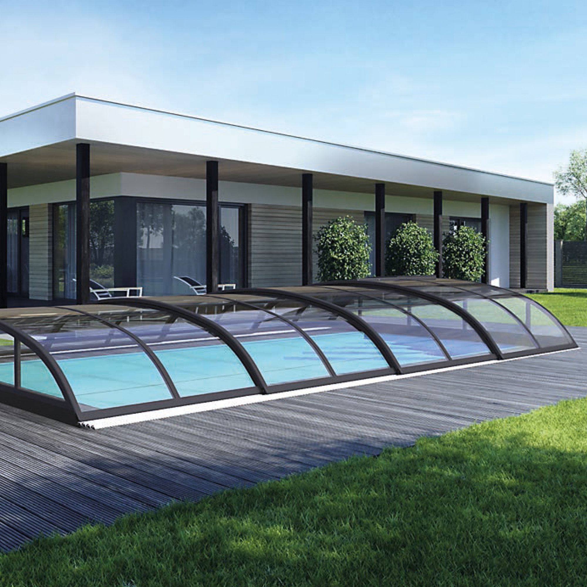 Wenn Sie gerne runde Formen und anmutige Kurven mögen, dann ist die mittelhohe Poolüberdachung Modell KLASIK für Sie die beste Lösung. Diese futuristische und minimalistische Überdachung ist dank ihrer eleganten Ausführung eine der beliebtesten Formen und passt in jeden Garten. Ein Klassiker, dem niemand überdrüssig wird.