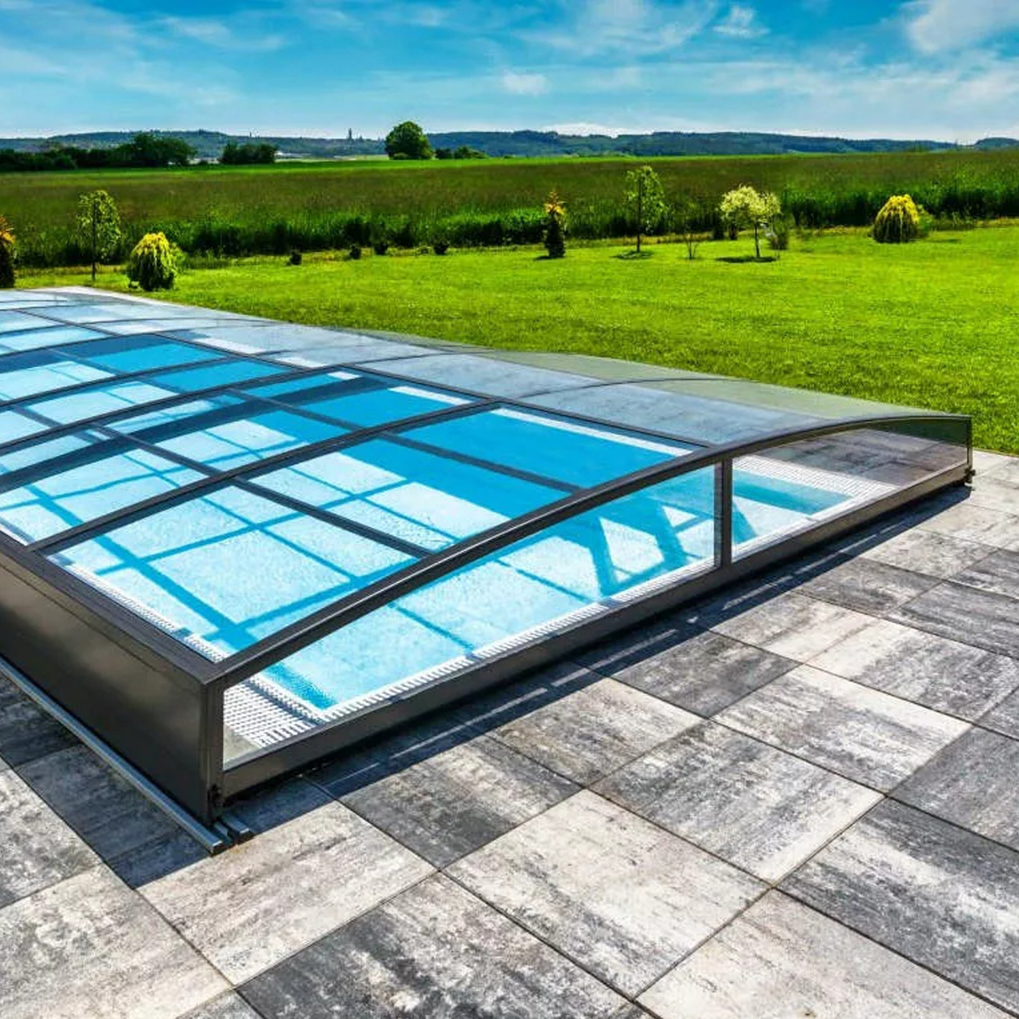 Die Überdachung ist mit teleskopischen Modulen ausgestattet und bietet viel Privatsphäre beim Schwimmen. Die Moduleelemente sind so konzipiert, dass die gesamte Überdachung auf die Länge eines Moduls zusammengeschoben werden kann. Jedes Modul hat standardmäßig zwei Arretierungen mit Sicherheitsrosetten, welche es gegen selbständige Bewegung sichern. Die Module sind für einen noch höheren Schutz mit einem Schloss versehen und abschließbar. Die Eindeckung besteht aus Polycarbonat, das Material mit UV-Schutz unterstützt gleichzeitig durch seine wärmeisolierenden Eigenschaften die Erwärmung des Beckenwassers.