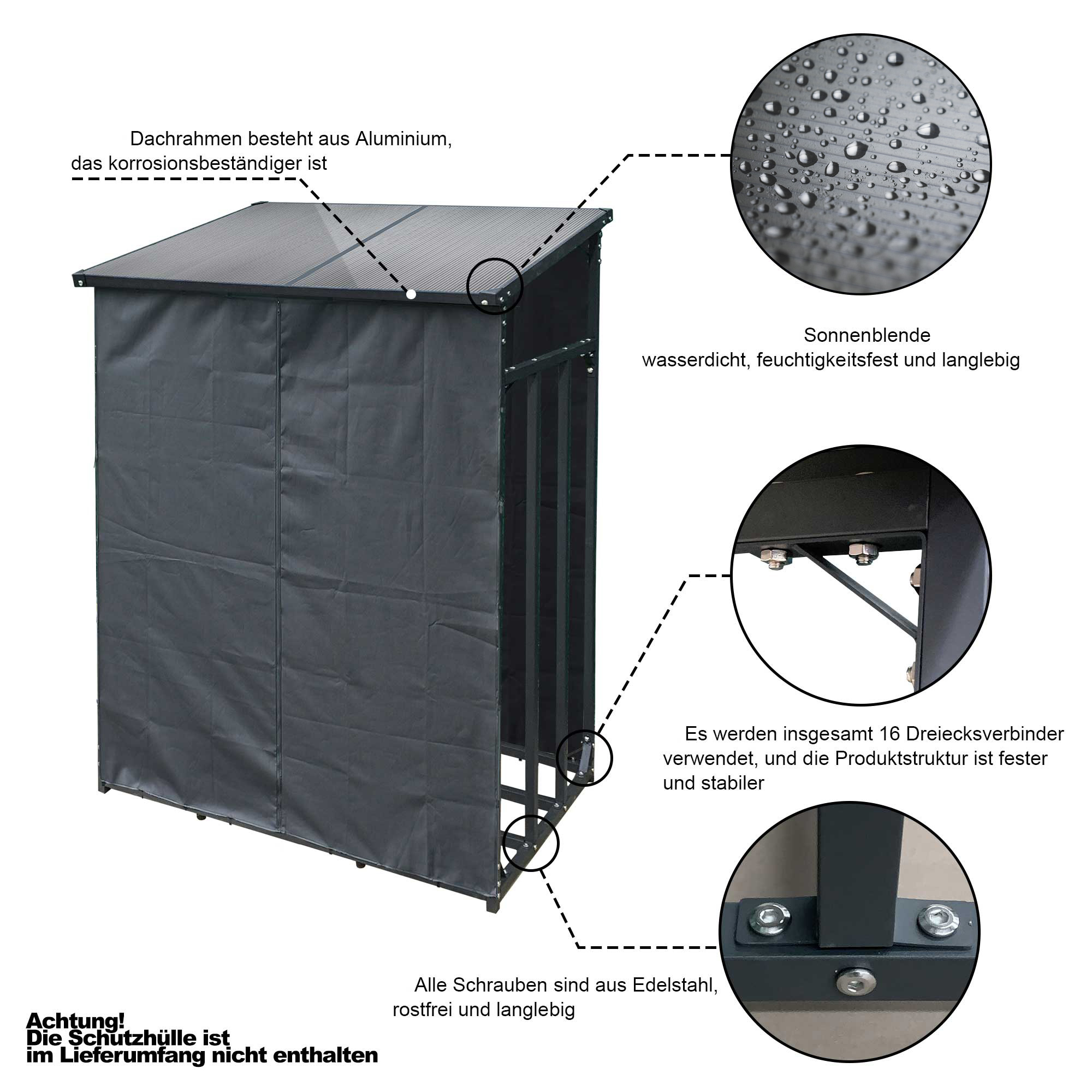 Das verwendete pulverbeschichtete Stahl in Farbe Anthrazit ist witterungsbeständig und für Außeneinsatz hervorragend geeignet.