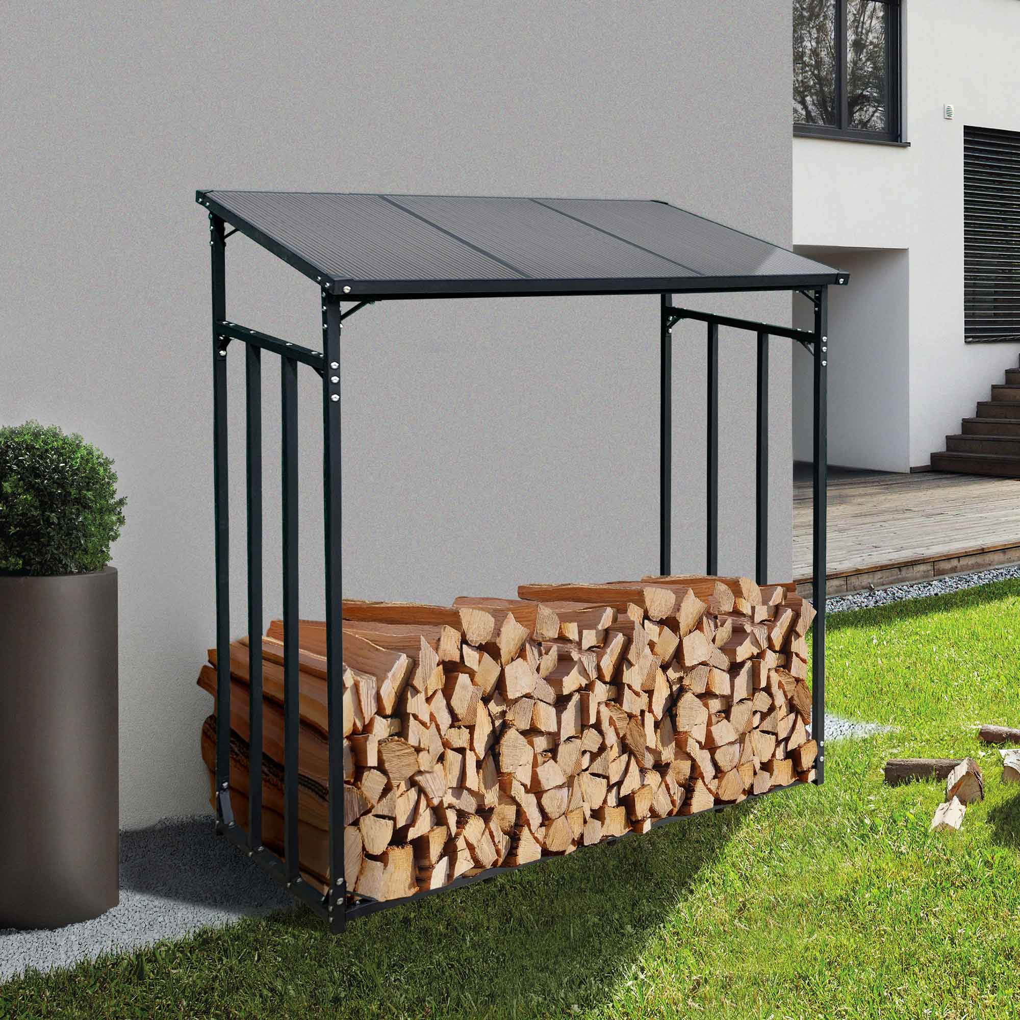 Mit dem Kaminholzregal das Feuerholz zuverlässig und sicher vor schlechter Witterung schützen.