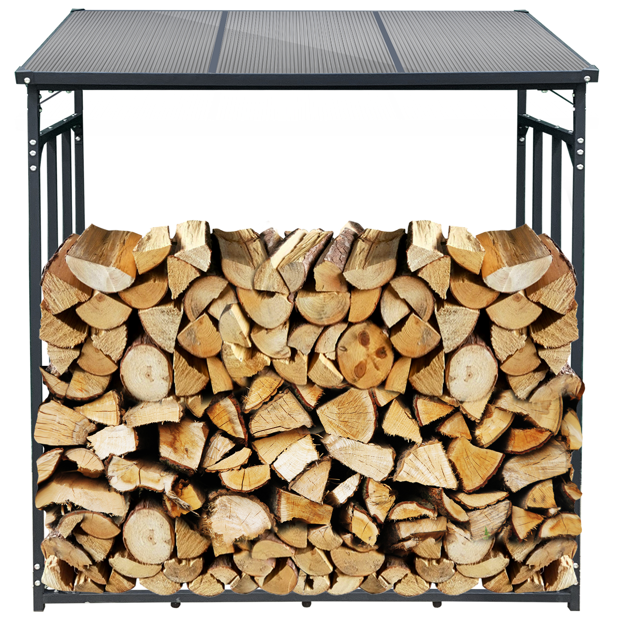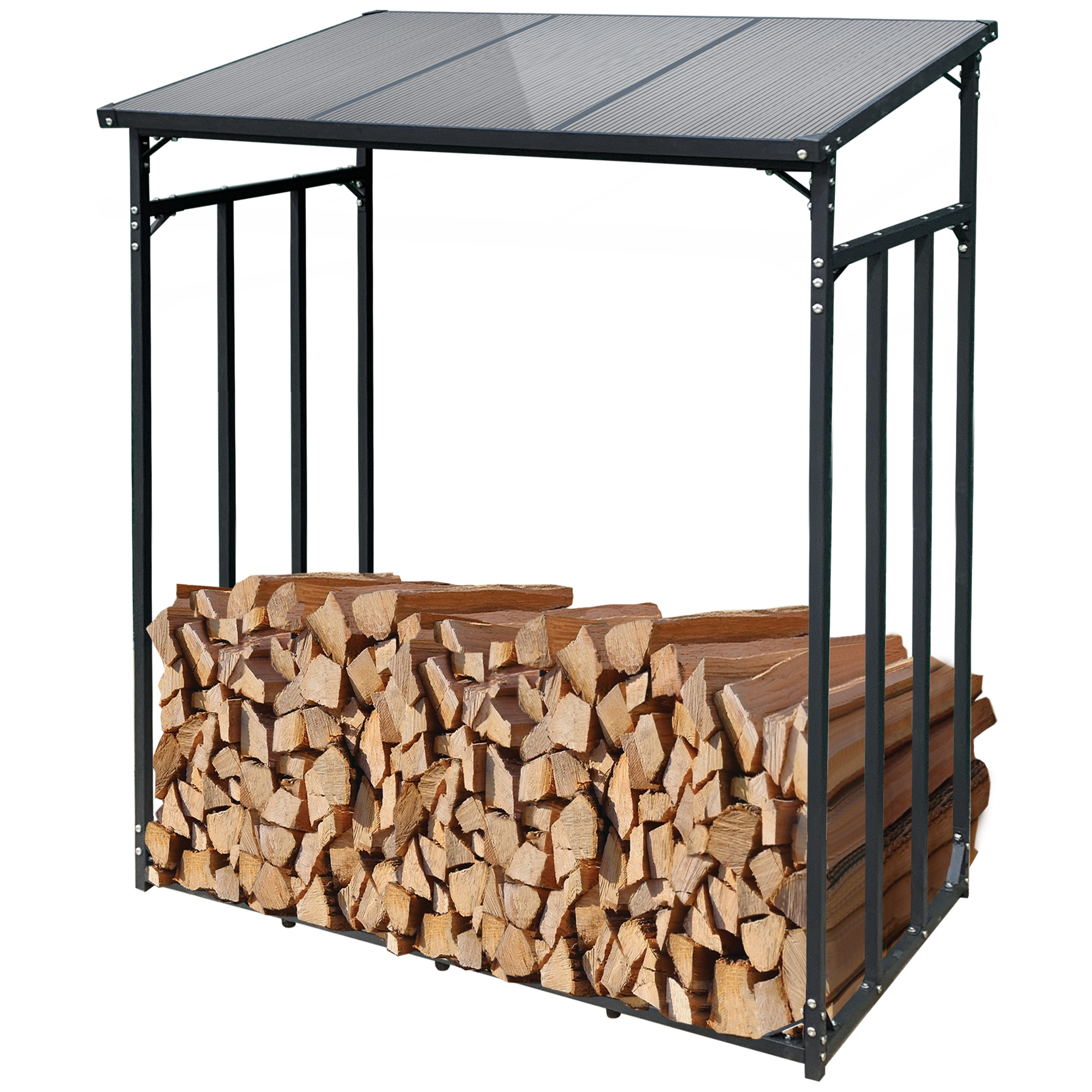 Mit Außenmaßen von 185 cm (Breite) x 70 cm (Tiefe) x 185 cm (Höhe) bietet der Feuerholzständer Platz für ca. 2,3 m³ Brennholz.