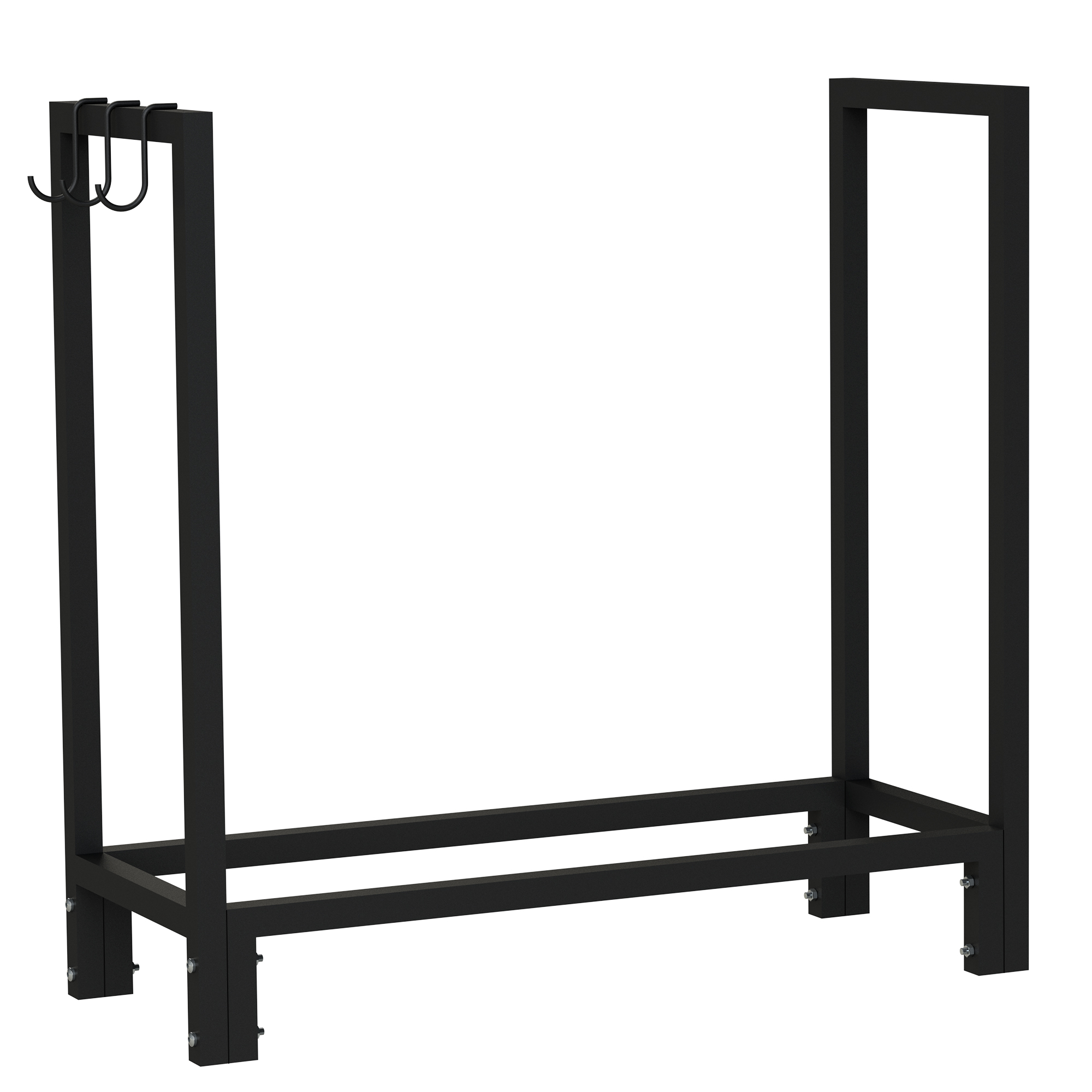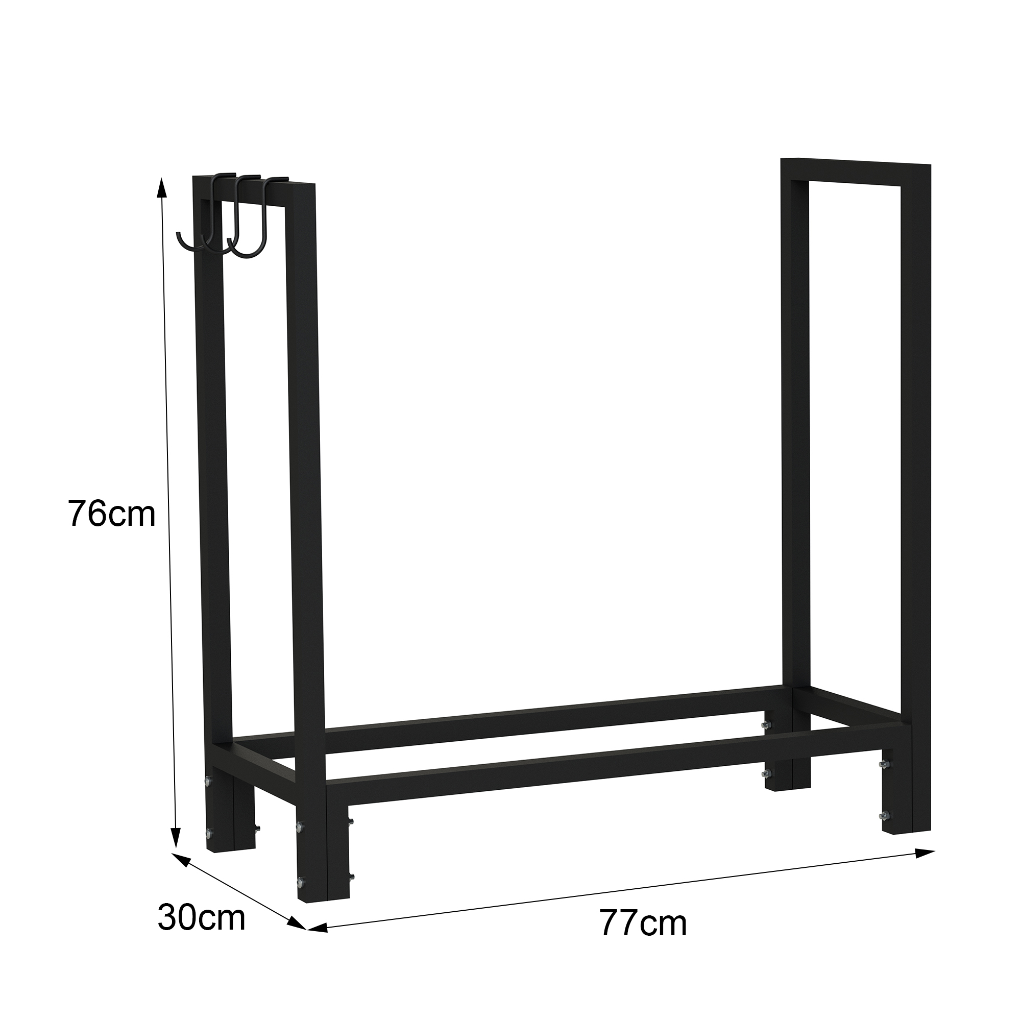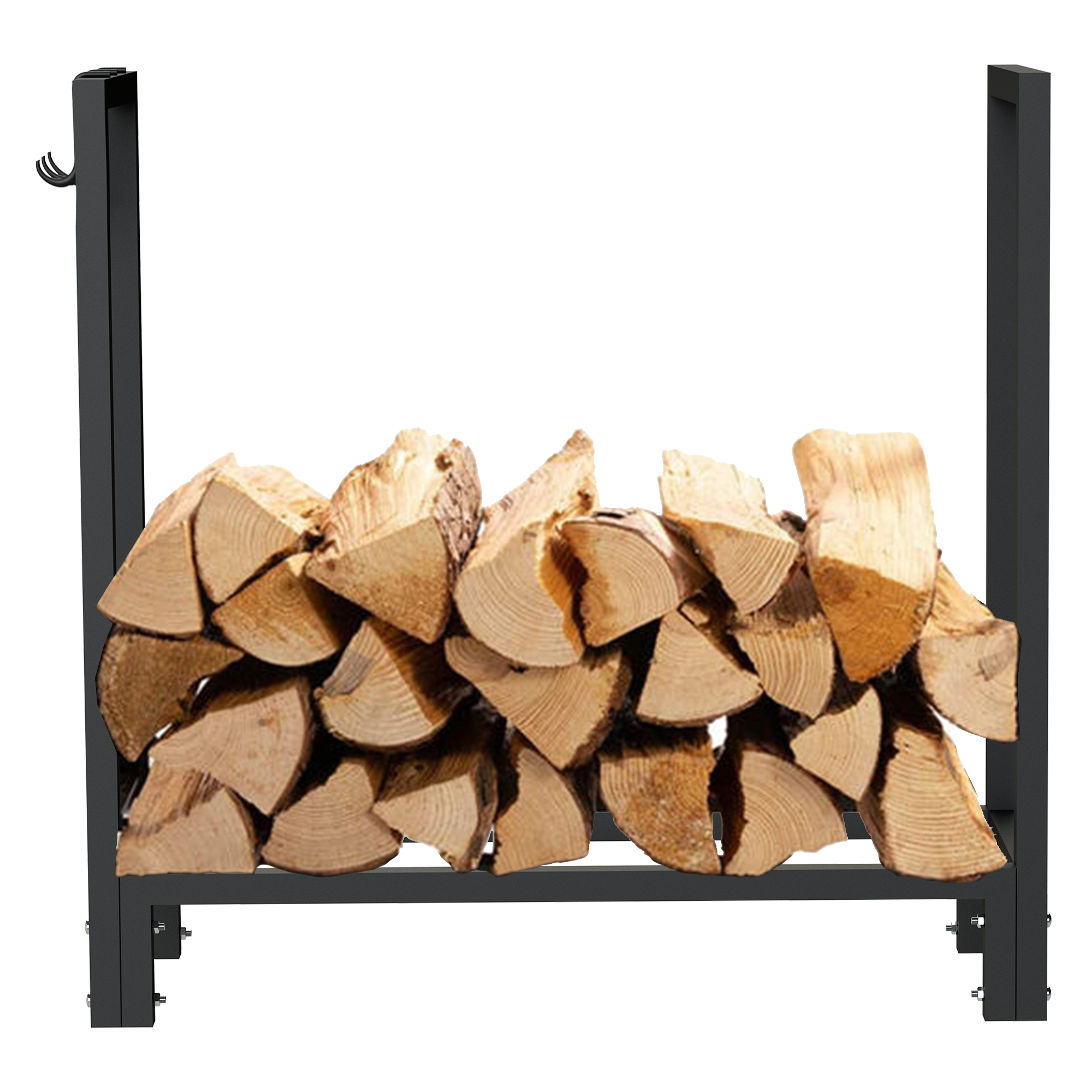 Der Holzstapelhalter für ordentliches Stapeln von Brennholz sorgt für komfortable und aufgeräumte Wohnumgebung, inkl. drei Aufhängehaken für Kaminbesteck wie Schürhaken, Feuerhaken, Aschekratze.