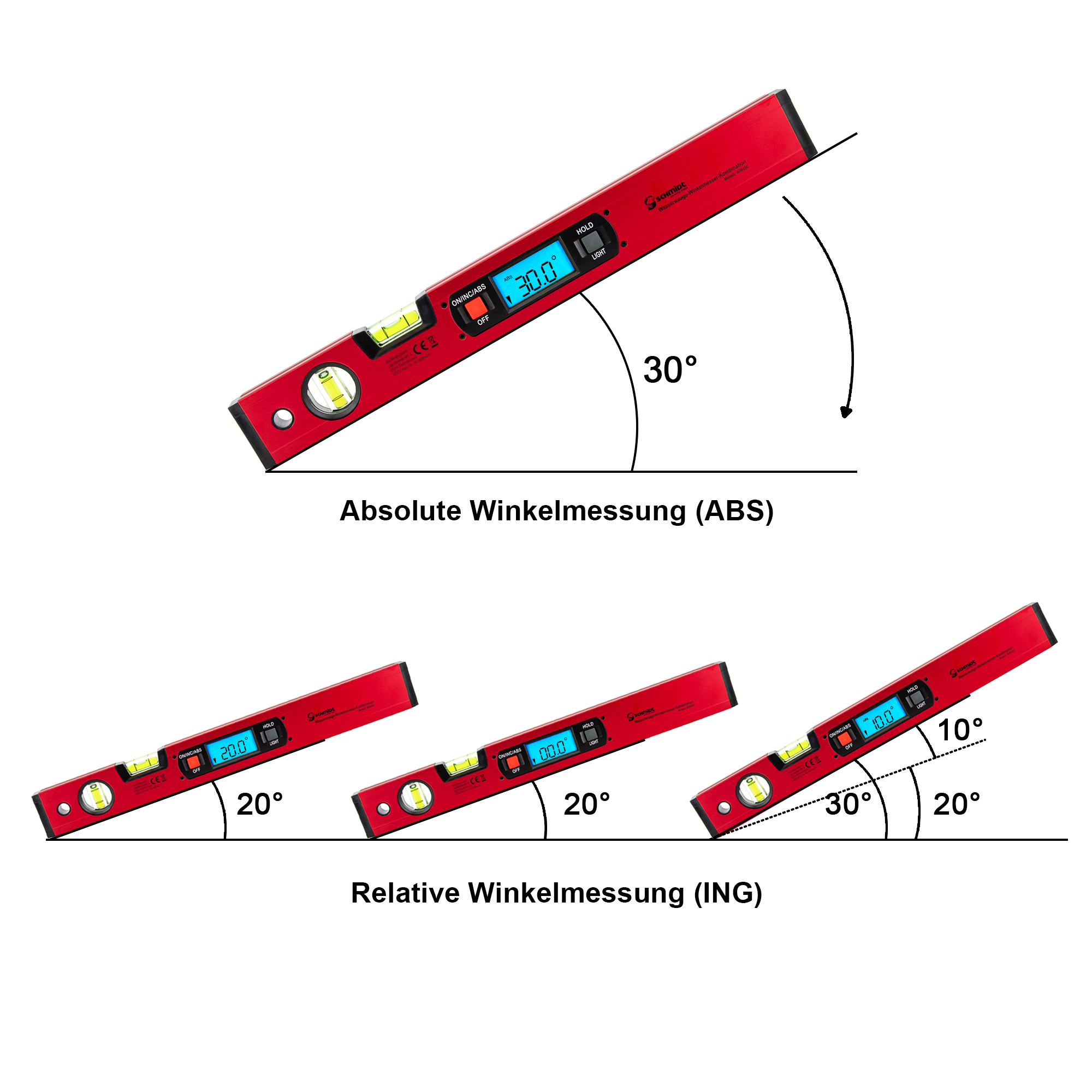 - Umschaltbare Einheiten in ° Grad und mm/m, per Tastendruck zwischen der relativen Winkelmessung (INC) und absoluten Winkelmessung (ABS) wechseln. Beim Wechseln auf die relative Messung setzt der Gradmesser die Anzeige auf 0 Grad, die folgenden Messwerte beziehen sich dann auf diesen Nullpunkt.