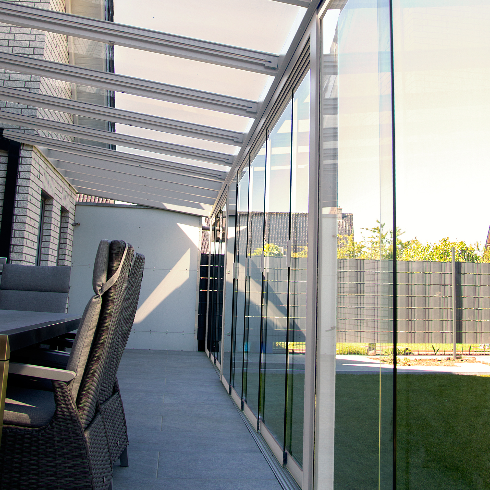 *Dreamgarden Überdachungen können mit Glasschiebewänden und LED-Einbauleuchten erweitert werden (Nicht im Lieferumfang)